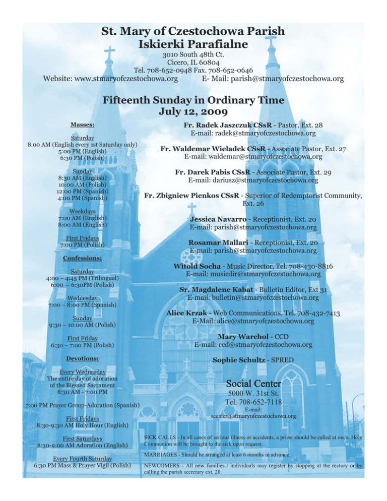 St. Mary of Czestochowa Parish Iskierki Parafialne 3010 South 48th Ct. Cicero, IL 60804 Tel. 708-652-0948 Fax. 708-652-0646 Website: www.stmaryofczestochowa.org E- Mail: [email protected] Fifteenth Sunday in Ordinary Time July 12, 2009 Masses: Saturday 8.00 AM (English every 1st Saturday only) 5:00 PM (English) 6:30 PM (Polish) Sunday 8:30 AM (English) 10:00 AM (Polish) 12:00 PM (Spanish) 4:00 PM (Spanish) Weekdays 7:00 AM (English) 8:00 AM (English) First Fridays 7:00 PM (Polish) Fr. Radek Jaszczuk CSsR - Pastor, Ext. 28 E-mail: [email protected] Fr. Waldemar Wieladek CSsR - Associate Pastor, Ext. 27 E-mail: [email protected] Fr. Darek Pabis CSsR - Associate Pastor, Ext. 29 E-mail: [email protected] Fr. Zbigniew Pienkos CSsR - Superior of Redemptorist Community, Ext. 26 Jessica Navarro - Receptionist, Ext. 20 E-mail: [email protected] Rosamar Mallari - Receptionist, Ext. 20 E-mail: [email protected] Confessions: Saturday 4:00 – 4:45 PM (Trilingual) 6:00 — 6:30PM (Polish) Wednesday 7:00 – 8:00 PM (Spanish) Sunday 9:30 – 10:00 AM (Polish) Witold Socha - Music Director, Tel. 708-430-8816 E-mail: [email protected] Sr. Magdalene Kabat - Bulletin Editor, Ext 31 E-mail: [email protected] Alice Krzak - Web Communications, Tel. 708-432-7413 E-Mail: [email protected] First Friday 6:30 – 7:00 PM (Polish) Mary Warchol - CCD E-mail: [email protected] Devotions: Sophie Schultz - SPRED Every Wednesday The entire day of adoration of the Blessed Sacrament 8:30 AM - 7:00 PM Social Center 7:00 PM Prayer Group-Adoration (Spanish) First Fridays 8:30-9:30 AM Holy Hour (English) First Saturdays 8:30-9:00 AM Adoration (English) Every Fourth Saturday 6:30 PM Mass & Prayer Vigil (Polish) 5000 W. 31st St. Tel. 708-652-7118 E-mail: [email protected] SICK CALLS - In all cases of serious illness or accidents, a priest should be called at once. Holy Communion will be brought to the sick upon request. MARRIAGES - Should be arranged at least 6 months in advance. NEWCOMERS - All new families / individuals may register by stopping at the rectory or by calling the parish secretary ext. 20. Sunday Iskierki Parafialne 12:00 4:00 July 12, Fifteenth Sunday in Ordinary Time 8:30 †Richard Pusateri (friend) †Krolak Family (Gert) †Rose Grzeskowiak 10:00 †Stanley & Halina Czykier †August Svestka (Larry Svestka) †Stefania Piejko (Chór Millenium) †Kazimierz i Aniela Kut (Sophie & Stanley Sutor) †Józef Gąsienica (Władysław Liszka) 12:00 Por los feligreses 4:00 †Ismael Ruiz (2º aniversario de fallecido, familiares) July 13, Monday, Weekday in Ordinary Time 7:00 Parishioners 8:00 †Holy Souls in the Book of Remembrance July 14, Tuesday, Blessed Kateri Tekakwitha, virgin 7:00 †Holy Souls in the Book of Remembrance 8:00 Andelbrat & Mrozik Families July 15, Wednesday, Bonaventure, bishop & doctor 7:00 †Holy Souls in the Book of Remembrance 8:00 †Sue Zolecki (Nick) 8:30 Eucharistic Adoration until 7PM 7PM El Circulo de Oración July 16, Thursday, Our Lady of Mount Carmel 7:00 Parishioners 8:00 †Mary Skrzypczak (family) July 17, Friday, Weekday in Ordinary Time 7:00 †Holy Souls in the Book of Remembrance 8:00 †Holy Souls in the Book of Remembrance July 18, Saturday, Camilius de Lelis, priest 11:00 Wedding: Bogusława Gruszka & Wojciech Strama 1:00 Wedding: Małgorzata Piwowar & Andrzej Stanek 3:00 Quinceañera: Liliana De la Riva 5:00 St. Mary’s Women’s Club †Edward Piznarski (Martha & family) 6:30 Polish Mass: †Stanley Maka (wife) July 19, Sixteenth Sunday in Ordinary Time 8:30 †Mike Vavrek (family) †Casey Trznadel (John Considine) †Rose Grzeskowiak (Shut-ins) St. Mary’s Choir 10:00 The Most Holy Redeemer—Intention of Redemptorits †Halina & Stanley Czykier †Reneta Domalik (Parents) †Józef Gąsienica (Józefa I Paweł Wąsik) †Stefania Piejko †Kazimierz & Aniela Kut (Sophie & Stanley Sutor) Benedición por sus Quince años Kassandra Magayares †Manuel Venegas (1er aniv., Martha Venegas) †Ulises Venegas (1er aniv.,Martha Venegas ) †Ismael Ruiz Lector Schedule July 18, 2009 5:00 Marie Jarding & Martha Stolarski July 19, 2009 8:30 Erik Batrez & Helen Cison 10:00 Jarek Szyszlak, Arek Topór 12:00 Roberto Pasillas, Linda Ramirez Juan Rodriguez, Miriam Campagne 4PM Los Niños Eucharistic Ministers July 18, 2009 5:00 Larry Napoletano, Joanne Napoletano July 19, 2009 8:30 Myra Rodriguez, John Kulaga, Rafael Ayala, Christine Zaragoza 10:00 Waldemar Lipka 12:00 Ma. Cruz Rodriguez, Juana Salas, Javier Hernandez 4PM Martha Tamayo, Humberto Telles WEDDING BANNS There is a promise of marriage between…….. III. Bogusława Gruszka & Wojciech Strama III. Małgorzata Piwowar & Andrzej Stanek II. Zofia Strama & Dawid Ciesla II. Anna Strózik & Mariusz Turza II. Cristina Gonzalez & Anthony J. Vais I. Małgorzata Bryja & Dawid Fafrowicz I. Małgorzata Maka & Gregorz W. Myrda We welcome in Baptism…….. Miguel Diaz de la Vega Ochoa Viktoria Woszczyk St. Mary of Czestochowa Sunday Collection: JULY 5, 2009 07/04 This weekend the Early Bird Raffle for a GPS will be held at the 10:00 AM Mass. The final Early Bird Raffle will take place on Sunday, August 8th at the 5PM Mass. The prize is an IPod Nano. In order to be eligible for the Early Bird raffles, you must sell all 20 raffle tickets in the Parish raffle book and payment of $100 for them must be received before the Early Bird Drawings. The cover of the raffle book is used for the drawing. More raffle tickets can be obtained from the parish rectory office during office hours – 9AM to 5PM. We ask our parishioners again (as we have in the past) to donate any of the following items for our parish Carnival and Summer Fest. Your support has been tremendous in the past! Can we count on your generosity again? Monetary donations are also greatly appreciated. ► Paper napkins ► Styrofoam plates, bowls, and cups ► Straws ► Cases of soda ► Cases of water ► Hot Dog buns ► Hot Dogs ► Hamburger buns ► Hamburger patties ► S