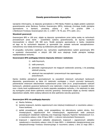 Zasady gwarantowania depozytów Uprzejmie informujemy, Ŝe depozyty gromadzone w PKO Banku Polskim są objęte polskim systemem gwarantowania przez Bankowy Fundusz Gwarancyjny (BFG), instytucję chroniącą środki pienięŜne zgromadzone w bankach, powołaną ustawą z dnia 14 grudnia 1994 r. o Bankowym Funduszu Gwarancyjnym (Dz. U. z 2007 r. Nr 70, poz. 474 z późn. zm.). Wysokość gwarancji: Gwarancjami BFG w 100 proc. objęte są depozyty zgromadzone przez jedną osobę na rachunkach prowadzonych przez banki - uczestników systemu gwarantowania, do łącznej wysokości równowartości w złotych 100 000 euro. Środki pienięŜne zgromadzone w banku niezaleŜnie od tego na ilu rachunkach deponent je zgromadził (np. posiada rachunek oszczędnościoworozliczeniowy oraz lokatę terminową) są traktowane jako jeden depozyt. W przypadku rachunków wspólnych (np. rachunków współmałŜonków) system gwarancyjny BFG w wysokości równowartości w złotych 100 000 euro obejmuje środki pienięŜne kaŜdego współposiadacza rachunku. Gwarancjom BFG podlegają imienne depozyty złotowe i walutowe: 1) osób fizycznych, 2) osób prawnych, 3) jednostek organizacyjnych nie mających osobowości prawnej, o ile posiadają zdolność prawną, 4) szkolnych kas oszczędności i pracowniczych kas zapomogowo poŜyczkowych. Oprócz środków pienięŜnych zgromadzonych na wszystkich imiennych rachunkach bankowych deponenta, gwarantowane są takŜe ich naleŜności wynikające z innych czynności bankowych, potwierdzone imiennymi dokumentami wystawionymi przez bank (m.in. przeprowadzanie rozliczeń bankowych, udzielanie gwarancji bankowych) oraz naleŜności z tytułu dyspozycji na wypadek śmierci oraz z tytułu kwot wydatkowanych na koszty pogrzebu posiadacza rachunku, o ile naleŜności te stały się wymagalne przed dniem spełnienia warunku gwarancji. Gwarancjami objęte są równieŜ naleŜne deponentowi odsetki, które zostaną naliczone do dnia spełnienia warunku gwarancji. Gwarancjom BFG nie podlegają depozyty: a) Skarbu Państwa, b) banków krajowych, banków zagranicznych oraz instytucji kredytowych w rozumieniu ustawy – Prawo bankowe, c) spółek prowadzących giełdę, rynek pozagiełdowy lub alternatywny system obrotu, firm inwestycyjnych, zagranicznych firm inwestycyjnych, zagranicznych osób prawnych prowadzących działalność maklerską oraz Krajowego Depozytu Papierów Wartościowych S.A. w rozumieniu ustawy z dnia 29 lipca 2005 r. o obrocie instrumentami finansowymi, d) krajowych i zagranicznych zakładów ubezpieczeń, krajowych i zagranicznych zakładów reasekuracji w rozumieniu ustawy z dnia 22 maja 2003 r. o działalności ubezpieczeniowej oraz Ubezpieczeniowego Funduszu Gwarancyjnego w rozumieniu ustawy z dnia 22 maja 2003 r. o ubezpieczeniach obowiązkowych, Ubezpieczeniowym i Polskim Biurze Ubezpieczycieli Komunikacyjnych, Funduszu Gwarancyjnym e) narodowych funduszy inwestycyjnych, firm zarządzających w rozumieniu ustawy z dnia 30 kwietnia 1993 r. o narodowych funduszach inwestycyjnych i ich prywatyzacji, f) funduszy inwestycyjnych, towarzystw funduszy inwestycyjnych, funduszy zagranicznych, spółek zarządzających, oddziałów towarzystw inwestycyjnych w rozumieniu ustawy z dnia 27 maja 2004 r. o funduszach inwestycyjnych, g) otwartych funduszy emerytalnych, pracowniczych funduszy emerytalnych, powszechnych towarzystw emerytalnych, pracowniczych towarzystw emerytalnych w rozumieniu ustawy z dnia 28 sierpnia 1997 r. o organizacji i funkcjonowaniu funduszy emerytalnych, h) spółdzielczych kas oszczędnościowo-kredytowych, Krajowej Spółdzielczej Kasy Oszczędnościowo-Kredytowej w rozumieniu ustawy z dnia 14 grudnia 1995 r. o spółdzielczych kasach oszczędnościowo-kredytowych, i) osób posiadających w dniu spełnienia warunku gwarancji pakiet co najmniej 5 % ogólnej liczby głosów na walnym zgromadzeniu lub udziału w kapitale zakładowym, a takŜe osób, które w stosunku do nich są podmiotami dominującymi lub zaleŜnymi w rozumieniu art. 3 pkt 16 i 17 ustawy, o której mowa w lit. c, w przypadku gdy osoby te pełniły swoje funkcje w dniu spełnienia warunku gwarancji bądź w okresie bieŜącego roku obrotowego (obrachunkowego) lub poprzedzającego dzień spełnienia warunku gwarancji, j) członków zarządu i rady nadzorczej banku krajowego oraz osób pełniących w tym banku funkcje dyrektorów i zastępców dyrektorów w centrali banku, jak równieŜ dyrektorów i zastępców dyrektorów oddziałów tego banku, w przypadku gdy osoby te pełniły swoje funkcje w dniu spełnienia warunku gwarancji bądź w okresie bieŜącego roku obrotowego (obrachunkowego) lub poprzedzającego dzień spełnienia warunku gwarancji, k) dyrektorów oraz zastępców dyrektora oddziału banku zagranicznego lub oddziału instytucji kredytowej, w przypadku którego nastąpiło spełnienie warunku gwarancji, jeŜeli osoby te pełniły swoje funkcje w dniu spełnienia warunku gwarancji bądź w okresie bieŜącego roku obrotowego (obrachunkowego) lub poprzedzającego dzień spełnienia warunku gwarancji. Gwarancjami BFG nie są objęte takŜe produkty, w przypadku, których bank jedynie pośredniczy w ich sprzedaŜy jak np.: jednostki funduszy inwestycyjnych, polisy ubezpieczeniowe, obligacje skarbowe. Waluta w jakiej wypłacane są środki gwarantowane Wypłata gwarantowanych środków pienięŜnych następuje w złotych bez względu na to, w jakiej walucie nominowane były depozyty zgromadzone w banku. Do obliczania równowartości euro oraz innych walut obcych w złotych stosuje się kurs średni Narodowego Banku Polskiego z dnia spełnienia warunku gwarancji. W przypadku prowadzenia przez bank jednego rachunku dla kilku osób (rachunek wspólny), deponentem jest kaŜda z tych osób - w granicach określonych w umowie rachunku, a w przypadku braku postanowień umownych lub przepisów w tym zakresie - w częściach równych. Ustanowienie pełnomocnictwa do dysponowania 