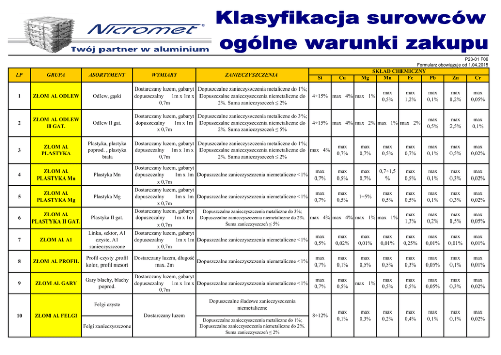 P23-01 F06 Formularz obowiązuje od 1.04.2015 WYMIARY GRUPA ASORTYMENT 1 ZŁOM Al. ODLEW Odlew, gąski Dostarczany luzem, gabaryt Dopuszczalne zanieczyszczenia metaliczne do 1%; dopuszczalny 1m x 1m x Dopuszczalne zanieczyszczenia niemetaliczne do 4÷15% max 4% max 1% 0,7m 2%. Suma zanieczyszczeń ≤ 2% 2 ZŁOM Al. ODLEW II GAT. Odlew II gat. 3 ZŁOM Al. PLASTYKA Plastyka, plastyka poprod. , plastyka biała 4 ZŁOM Al. PLASTYKA Mn Plastyka Mn 5 ZŁOM Al. PLASTYKA Mg Plastyka Mg 6 ZŁOM Al. PLASTYKA II GAT. Plastyka II gat. 7 ZŁOM Al. A1 Linka, sektor, A1 czyste, A1 zanieczyszczone Dostarczany luzem, gabaryt dopuszczalny 1m x 1m Dopuszczalne zanieczyszczenia niemetaliczne <1% x 0,7m max 0,5% max 0,02% max 0,01% 8 ZŁOM Al. PROFIL Profil czysty ,profil kolor, profil niesort Dostarczany luzem, długość Dopuszczalne zanieczyszczenia niemetaliczne <1% max. 2m max 0,7% max 0,1% 9 ZŁOM Al. GARY Gary blachy, blachy poprod. Dostarczany luzem, gabaryt dopuszczalny 1m x 1m x Dopuszczalne zanieczyszczenia niemetaliczne <1% 0,7m max 0,7% 8÷12% Zn Cr max 0,1% max 1,2% max 0,05% Dostarczany luzem, gabaryt Dopuszczalne zanieczyszczenia metaliczne do 3%; dopuszczalny 1m x 1m Dopuszczalne zanieczyszczenia niemetaliczne do 4÷15% max 4% max 2% max 1% max 2% x 0,7m 2%. Suma zanieczyszczeń ≤ 5% max 0,5% max 2,5% max 0,1% Dostarczany luzem, gabaryt Dopuszczalne zanieczyszczenia metaliczne do 1%; dopuszczalny 1m x 1m x Dopuszczalne zanieczyszczenia niemetaliczne do max 4% 0,7m 2%. Suma zanieczyszczeń ≤ 2% max 0,7% max 0,7% max 0,5% max 0,7% max 0,1% max 0,5% max 0,02% Dostarczany luzem, gabaryt dopuszczalny 1m x 1m Dopuszczalne zanieczyszczenia niemetaliczne <1% x 0,7m max 0,5% max 0,7% 0,7÷1,5 % max 0,5% max 0,1% max 0,3% max 0,02% ZŁOM Al. FELGI max 0,5% max 0,1% max 0,3% max 0,02% max 1,3% max 0,2% max 1,5% max 0,05% max 0,01% max 0,25% max 0,01% max 0,01% max 0,01% max 0,5% max 0,5% max 0,3% max 0,05% max 0,1% max 0,01% max 0,5% max 1% max 0,5% max 0,5% max 0,05% max 0,3% max 0,02% max 0,1% max 0,3% max 0,2% max 0,4% max 0,1% max 0,1% max 0,02% max 0,7% Dopuszczalne śladowe zanieczyszczenia niemetaliczne Dostarczany luzem Felgi zanieczyszczone Si Cu Mg max 0,5% Dostarczany luzem, gabaryt max max max dopuszczalny 1m x 1m Dopuszczalne zanieczyszczenia niemetaliczne <1% 1÷5% 0,7% 0,5% 0,5% x 0,7m Dostarczany luzem, gabaryt Dopuszczalne zanieczyszczenia metaliczne do 3%; dopuszczalny 1m x 1m Dopuszczalne zanieczyszczenia niemetaliczne do 2%. max 4% max 4% max 1% max 1% Suma zanieczyszczeń ≤ 5% x 0,7m Felgi czyste 10 ZANIECZYSZCZENIA SKŁAD CHEMICZNY Mn Fe Pb LP Dopuszczalne zanieczyszczenia metaliczne do 1%; Dopuszczalne zanieczyszczenia niemetaliczne do 2%. Suma zanieczyszczeń ≤ 2% max 1,2% 11 ZŁOM Al. SHREDDER GARY Shredder gary Dostarczany luzem Dopuszczalne zanieczyszczenia niemetaliczne <1%; wilgotność niedopuszczalna max 1% max 0,5% max 0,5% max 0,5% max 0,5% max 0,05% max 0,3% max 0,02% 12 ZŁOM Al. SHREDDER PLASTYKA Shredder plastyka Dostarczany luzem Dopuszczalne zanieczyszczenia niemetaliczne <1%; wilgotność niedopuszczalna max 4% max 0,7% max 1% max 0,7% max 0,7% max 0,1% max 1% max 0,02% 13 ZŁOM Al. SHREDDER ODLEW Shredder odlew Dostarczany luzem Dopuszczalne zanieczyszczenia niemetaliczne <1%; wilgotność niedopuszczalna 4÷15% max 4% max 1% max 0,5% max 1,2% max 0,1% max 1,2% max 0,05% 14 ZŁOM Al. SHREDDER PROFIL Shredder Profil Dostarczany luzem Dopuszczalne zanieczyszczenia niemetaliczne <1%; wilgotność niedopuszczalna 15 ZŁOM Al. CIENKIE Chłodnice Al., żaluzja, puszka, Dostarczany luzem, gabaryt dopuszczalny 1m x 1m x 0,7m 16 Dostarczany luzem, Wióry czyste nieskorodowany, nieskłębiony, nie pomieszany z wiórami ZŁOM Al. WIÓRY innych metali, w postaci Wióry stopowe, wióry pozwalającej na mieszane bezproblemowy rozładunek (niejednorodne) Wióry stopowe, wióry mieszane (niejednorodne) Sprasowany w kostkę, dostarczany na paletach drewnianych. max 0,7% max 0,1% max 0,5% max 0,5% max 0,3% max 0,05% max 0,1% max 0,01% max 0,5% max 0,5% max 0,5% max 1,2% max 0,1% max 0,1% max 0,02% max 0,2% max 0,4% max 0,1% max 0,1% max 0,02% max 0,5% max 1% max 0,5% max 1,2% max 0,05% Dopuszczalne zanieczyszczenia niemetaliczne <5%. W przypadku dostaw sprasowanych przeprowadzana jest próba w warunkach produkcyjnych. W przypadku wykrycia nieprawidłowego składu chemicznego, bądź max 13% max 6% max 1% zaniżonego uzysku spowodowanego zanieczyszczeniami dostawca zobowiązany jest do odebrania na swój koszt zanieczyszczonego materiału, oraz poniesienia wszelkich kosztów związanych z przeprowadzonymi badaniami. max 0,5% max 1% max 0,5% max 1,2% max 0,1% max 0,5% max 1% max 0,5% max 5% max 0,1% max 0,5% max 1% max 0,5% max 1,2% max 0,1% max 0,01% max 0,1% max 0,01% max 0,01% max 0,01% Dopuszczalne zanieczyszczenia metaliczne do 1%; Dopuszczalne zanieczyszczenia niemetaliczne do 2%. max 1% Suma zanieczyszczeń ≤ 2% Dopuszczalne zanieczyszczenia niemetaliczne (woda, max max emulsja) do 2%, Dopuszczalne zanieczyszczenia max 13% metaliczne do 1%. Wilgotność: wióry suche baza 2%, 0,1% 0,3% wióry mokre baza 5% Dopuszczalne zanieczyszczenia niemetaliczne (woda, emulsja) do 2%, Dopuszczalne zanieczyszczenia max 13% max 6% max 1% metaliczne do 1%. Wilgotność: wióry suche baza 2%, wióry mokre baza 5% 17 WIÓRY PACZKOWANE 18 ZŁOM Al. WIÓRY ZN Wióry stopowe, wióry nieskorodowany, nieskłębiony mieszane Dopuszczalne zanieczyszczenia niemetaliczne <5% max 13% max 6% max 1% / sprasowany / (niejednorodne) zbrykietowawany 19 ZŁOM Al. WIÓRY MIX Wióry stopowe, wióry nieskorodowany, nieskłębiony mieszane Dopuszczalne zanieczyszczenia niemetaliczne <8% max 13% max 6% max 1% / sprasowany / (niejednorodne) zbrykietowawany 20 ZŁOM Al. NIEOBROBIONE Dostarczany luzem, Dostarczany luzem, Gąski Dostarczany w stoskach Brak dopuszczalnych zanieczyszczeń; wilgotność niedopuszczalna max 0,1% max 0,01% max 0,01% 20 Brak dopuszczalnych zanieczyszczeń; wilgotność niedopuszc