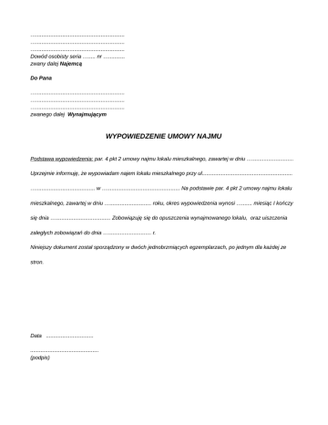 …............................................................ …............................................................ …............................................................ Dowód osobisty seria …..... nr …........... zwany dalej Najemcą Do Pana …............................................................ …............................................................ …............................................................ zwanego dalej Wynajmującym WYPOWIEDZENIE UMOWY NAJMU Podstawa wypowiedzenia: par. 4 pkt 2 umowy najmu lokalu mieszkalnego, zawartej w dniu …............................ Uprzejmie informuję, że wypowiadam najem lokalu mieszkalnego przy ul............................................................. …........................................ w …................................................. Na podstawie par. 4 pkt 2 umowy najmu lokalu mieszkalnego, zawartej w dniu …............................ roku, okres wypowiedzenia wynosi …....... miesiąc I kończy się dnia …..................................... Zobowiązuję się do opuszczenia wynajmowanego lokalu, oraz uiszczenia zaległych zobowiązań do dnia …............................. r. Niniejszy dokument został sporządzony w dwóch jednobrzmiących egzemplarzach, po jednym dla każdej ze stron. Data ................................ .............................................. (podpis)