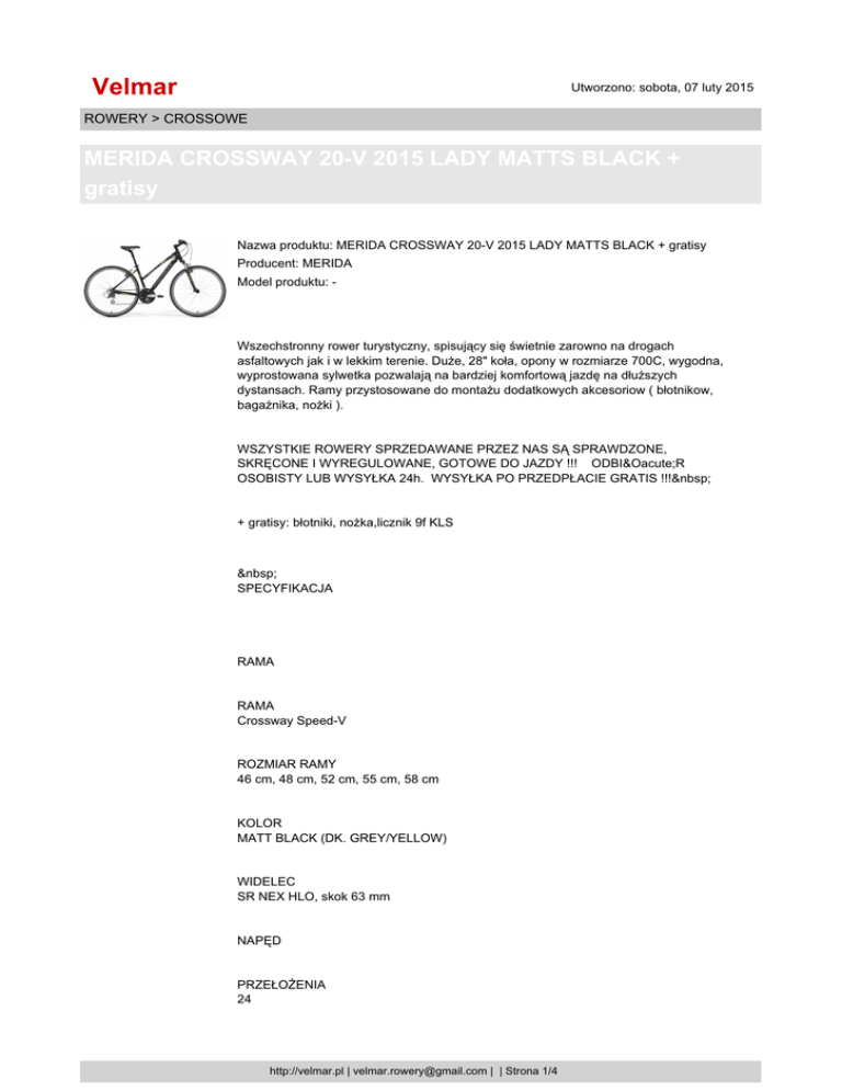 Velmar Utworzono: sobota, 07 luty 2015 ROWERY > CROSSOWE MERIDA CROSSWAY 20-V 2015 LADY MATTS BLACK + gratisy Nazwa produktu: MERIDA CROSSWAY 20-V 2015 LADY MATTS BLACK + gratisy Producent: MERIDA Model produktu: - Wszechstronny rower turystyczny, spisujący się świetnie zarowno na drogach asfaltowych jak i w lekkim terenie. Duże, 28" koła, opony w rozmiarze 700C, wygodna, wyprostowana sylwetka pozwalają na bardziej komfortową jazdę na dłuższych dystansach. Ramy przystosowane do montażu dodatkowych akcesoriow ( błotnikow, bagażnika, nożki ). WSZYSTKIE ROWERY SPRZEDAWANE PRZEZ NAS SĄ SPRAWDZONE, SKRĘCONE I WYREGULOWANE, GOTOWE DO JAZDY !!! ODBIÓR OSOBISTY LUB WYSYŁKA 24h. WYSYŁKA PO PRZEDPŁACIE GRATIS !!! + gratisy: błotniki, nożka,licznik 9f KLS SPECYFIKACJA RAMA RAMA Crossway Speed-V ROZMIAR RAMY 46 cm, 48 cm, 52 cm, 55 cm, 58 cm KOLOR MATT BLACK (DK. GREY/YELLOW) WIDELEC SR NEX HLO, skok 63 mm NAPĘD PRZEŁOŻENIA 24 http://velmar.pl | [email protected] | | Strona 1/4 Velmar Utworzono: sobota, 07 luty 2015 ROWERY > CROSSOWE MERIDA CROSSWAY 20-V 2015 LADY MATTS BLACK + gratisy PRZERZUTKA P Shimano M191 PRZERZUTKA T Shimano Acera-X MANETKA P/T Shimano EZ fire 3/fire 8 KORBA CW-XCC-T208 48-38-28 CG KASETA Sunrace CS8 11-32 ŁAŃCUCH KMC 8s KOŁA ROZMIAR KÓŁ 700C PIASTA P/T OV alloy/OV cassette OBRĘCZE Merida comp V SZPRYCHY UCP steel DĘTKI 700C OPONA P/T Cross 700x40C http://velmar.pl | [email protected] | | Strona 2/4 Velmar Utworzono: sobota, 07 luty 2015 ROWERY > CROSSOWE MERIDA CROSSWAY 20-V 2015 LADY MATTS BLACK + gratisy KOMPONENTY HAMULEC P/T V-Brake Linear KIEROWNICA MERIDA comp OS 600 R30 MOSTEK Adjustable A-Head SIODŁO Cross Sport SZTYCA Suspension 27.2 PEDAŁY PP pedal Producent zastrzega możliwość zmiany specyfikacji bez uprzedzenia Paragon lub faktura VAT. Dlaczego warto kupić u nas rower? RACELITE 6061 ALUMINIUM Niezwykle lekki i mocny stop używany w przemyśle lotniczym. MERIDA poddaje go dodatkowemu hartowaniu, tworząc podwojnie cieniowane lekkie i sztywne rury. LOCKOUT Blokada amortyzatora przedniego lub tylnego za pomocą dźwigni na jego obudowie. Pozwala na optymalny transfer energii w zależności od rodzaju nawierzchni i ukształtowania terenu. http://velmar.pl | [email protected] | | Strona 3/4 Velmar Utworzono: sobota, 07 luty 2015 ROWERY > CROSSOWE MERIDA CROSSWAY 20-V 2015 LADY MATTS BLACK + gratisy LOCKOUT Blokada amortyzatora przedniego lub tylnego za pomocą dźwigni na jego obudowie. Pozwala na optymalny transfer energii w zależności od rodzaju nawierzchni i ukształtowania terenu. Cena: 1599.00zł Opcje dostępne dla MERIDA CROSSWAY 20-V 2015 LADY MATTS BLACK + gratisy : rozmiar ramy 42L, 46L. Dostępność: Ten produkt został dodany do sklepu w dniu sobota, 31 styczeń 2015 http://velmar.pl | [email protected] | | Strona 4/4