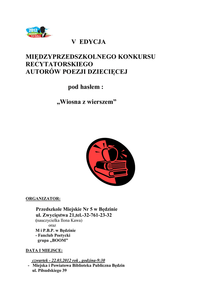 V EDYCJA MIĘDZYPRZEDSZKOLNEGO KONKURSU RECYTATORSKIEGO AUTORÓW POEZJI DZIECIĘCEJ pod hasłem : „Wiosna z wierszem” ORGANIZATOR: Przedszkole Miejskie Nr 5 w Będzinie ul. Zwycięstwa 21,tel.-32-761-23-32 (nauczycielka Ilona Kawa) oraz M i P.B.P. w Będzinie - Fanclub Poetycki grupa „BOOM” DATA I MIEJSCE: czwartek - 22.03.2012 rok , godzina-9:30 - Miejska i Powiatowa Biblioteka Publiczna Będzin ul. Piłsudskiego 39 CELE: -rozwijanie zainteresowań poetyckich u dzieci -umożliwianie kontaktu z językiem literackim -rozbudzanie wrażliwości estetycznej -umiejętność zaprezentowania wybranego utworu poetyckiego dostosowanego do wieku -promocja twórczości J. Dormana w 100 rocznicę urodzin twórcy i eksperymentatora teatralnego REGULAMIN KONKURSU: - w konkursie mogą uczestniczyć dzieci w wieku : 3,4,5 i 6 lat - każdy uczestnik może recytować jeden wybrany wiersz - indywidualnie lub z podziałem na role( wraz ze swoim bohaterem) - z każdego przedszkola oczekujemy na maksymalnie 4 zgłoszenia uczestników uwzględniając kategorię wiekową : 3,4,5 i 6 lat Pisemne zgłoszenia uczestników należy składać do dnia : 16 marca 2012 roku (piątek) na adres e-mail : [email protected] lub fax: 32 761-23-32 Każde zgłoszenie powinno zawierać : nazwę, adres i telefon przedszkola; imię i nazwisko oraz wiek uczestnika konkursu; tytuł i nazwisko autora wiersza. Zaleca się przeprowadzenie wewnętrznych eliminacji w celu wyłonienia laureatów w każdej grupie wiekowej. Finalistom z każdej grupy wiekowej organizator zapewnia nagrody , opiekunom podziękowania. Słodki poczęstunek dla wszystkich. W związku z obchodami -100 rocznicy urodzin Jana Dormana - założyciela i patrona Teatru Dzieci Zagłębia w Będzinie - proponujemy by każdy uczestnik konkursu recytatorskiego wykonał sylwetę wybranego bohatera swojego wiersza w postaci- kukiełki, lalki, pacynki czy maskotki, z którą będzie mógł recytować swój utwór. Do każdej pracy należy dołączyć metryczkę zawierającą dane osobowe uczestnika konkursu. Bohaterów waszych wierszy będzie można oglądać na wystawie w MiPBP w Będzinie przez całą wiosnę. SERDECZNIE ZAPRASZAMY DZIECI, NAUCZYCIELI I RODZICÓW ORGANIZATORZY