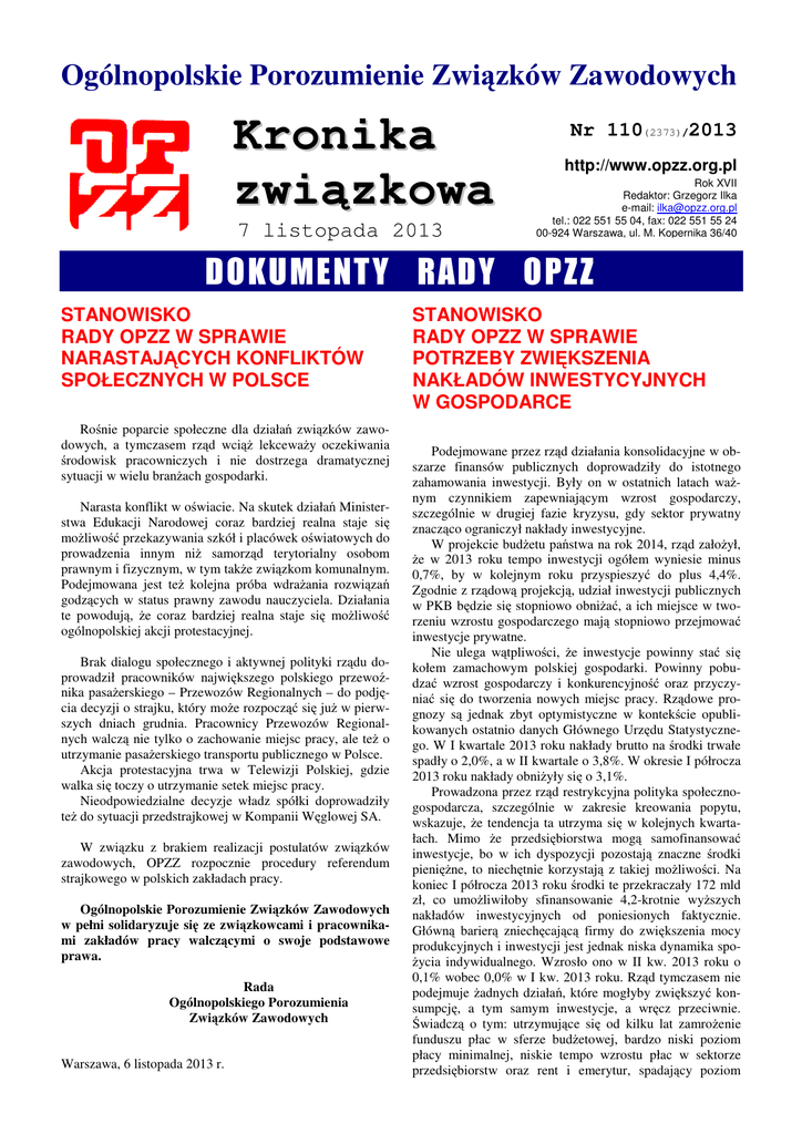 Ogólnopolskie Porozumienie Związków Zawodowych Kronika związkowa 7 listopada 2013 Nr 110(2373)/2013 http://www.opzz.org.pl Rok XVII Redaktor: Grzegorz Ilka e-mail: [email protected] tel.: 022 551 55 04, fax: 022 551 55 24 00-924 Warszawa, ul. M. Kopernika 36/40 DOKUMENTY RADY OPZZ STANOWISKO RADY OPZZ W SPRAWIE NARASTAJĄCYCH KONFLIKTÓW SPOŁECZNYCH W POLSCE Rośnie poparcie społeczne dla działań związków zawodowych, a tymczasem rząd wciąż lekceważy oczekiwania środowisk pracowniczych i nie dostrzega dramatycznej sytuacji w wielu branżach gospodarki. Narasta konflikt w oświacie. Na skutek działań Ministerstwa Edukacji Narodowej coraz bardziej realna staje się możliwość przekazywania szkół i placówek oświatowych do prowadzenia innym niż samorząd terytorialny osobom prawnym i fizycznym, w tym także związkom komunalnym. Podejmowana jest też kolejna próba wdrażania rozwiązań godzących w status prawny zawodu nauczyciela. Działania te powodują, że coraz bardziej realna staje się możliwość ogólnopolskiej akcji protestacyjnej. Brak dialogu społecznego i aktywnej polityki rządu doprowadził pracowników największego polskiego przewoźnika pasażerskiego – Przewozów Regionalnych – do podjęcia decyzji o strajku, który może rozpocząć się już w pierwszych dniach grudnia. Pracownicy Przewozów Regionalnych walczą nie tylko o zachowanie miejsc pracy, ale też o utrzymanie pasażerskiego transportu publicznego w Polsce. Akcja protestacyjna trwa w Telewizji Polskiej, gdzie walka się toczy o utrzymanie setek miejsc pracy. Nieodpowiedzialne decyzje władz spółki doprowadziły też do sytuacji przedstrajkowej w Kompanii Węglowej SA. W związku z brakiem realizacji postulatów związków zawodowych, OPZZ rozpocznie procedury referendum strajkowego w polskich zakładach pracy. Ogólnopolskie Porozumienie Związków Zawodowych w pełni solidaryzuje się ze związkowcami i pracownikami zakładów pracy walczącymi o swoje podstawowe prawa. Rada Ogólnopolskiego Porozumienia Związków Zawodowych Warszawa, 6 listopada 2013 r. STANOWISKO RADY OPZZ W SPRAWIE POTRZEBY ZWIĘKSZENIA NAKŁADÓW INWESTYCYJNYCH W GOSPODARCE Podejmowane przez rząd działania konsolidacyjne w obszarze finansów publicznych doprowadziły do istotnego zahamowania inwestycji. Były on w ostatnich latach ważnym czynnikiem zapewniającym wzrost gospodarczy, szczególnie w drugiej fazie kryzysu, gdy sektor prywatny znacząco ograniczył nakłady inwestycyjne. W projekcie budżetu państwa na rok 2014, rząd założył, że w 2013 roku tempo inwestycji ogółem wyniesie minus 0,7%, by w kolejnym roku przyspieszyć do plus 4,4%. Zgodnie z rządową projekcją, udział inwestycji publicznych w PKB będzie się stopniowo obniżać, a ich miejsce w tworzeniu wzrostu gospodarczego mają stopniowo przejmować inwestycje prywatne. Nie ulega wątpliwości, że inwestycje powinny stać się kołem zamachowym polskiej gospodarki. Powinny pobudzać wzrost gospodarczy i konkurencyjność oraz przyczyniać się do tworzenia nowych miejsc pracy. Rządowe prognozy są jednak zbyt optymistyczne w kontekście opublikowanych ostatnio danych Głównego Urzędu Statystycznego. W I kwartale 2013 roku nakłady brutto na środki trwałe spadły o 2,0%, a w II kwartale o 3,8%. W okresie I półrocza 2013 roku nakłady obniżyły się o 3,1%. Prowadzona przez rząd restrykcyjna polityka społecznogospodarcza, szczególnie w zakresie kreowania popytu, wskazuje, że tendencja ta utrzyma się w kolejnych kwartałach. Mimo że przedsiębiorstwa mogą samofinansować inwestycje, bo w ich dyspozycji pozostają znaczne środki pieniężne, to niechętnie korzystają z takiej możliwości. Na koniec I półrocza 2013 roku środki te przekraczały 172 mld zł, co umożliwiłoby sfinansowanie 4,2-krotnie wyższych nakładów inwestycyjnych od poniesionych faktycznie. Główną barierą zniechęcającą firmy do zwiększenia mocy produkcyjnych i inwestycji jest jednak niska dynamika spożycia indywidualnego. Wzrosło ono w II kw. 2013 roku o 0,1% wobec 0,0% w I kw. 2013 roku. Rząd tymczasem nie podejmuje żadnych działań, które mogłyby zwiększyć konsumpcję, a tym samym inwestycje, a wręcz przeciwnie. Świadczą o tym: utrzymujące się od kilku lat zamrożenie funduszu płac w sferze budżetowej, bardzo niski poziom płacy minimalnej, niskie tempo wzrostu płac w sektorze przedsiębiorstw oraz rent i emerytur, spadający poziom Kronika związkowa nr 110(2373)/2013 – strona 2 oszczędności, jak również ostatnio dokonane zmiany w Kodeksie pracy w zakresie czasu pracy. Są to główne przyczyny spadku inwestycji. W tej sytuacji Rada uznaje, że niezbędne i słuszne jest zwiększenie wydatków rządowych i publicznych na inwestycje infrastrukturalne oraz w badania i rozwój (B+R), jak również na podnoszenie kwalifikacji pracowników, tym bardziej, że poziom wydatków publicznych w relacji do PKB w Polsce w 2012 roku wyniósł 42,3% i jest najniższy od 5 lat oraz jednym z najniższych w Unii Europejskiej. Rada w pełni identyfikuje się ze stanowiskiem Europejskiej Konfederacji Związków Zawodowych w kwestii potrzeby zwiększenia inwestycji, wyrażonym na posiedzeniu Komitetu Wykonawczego w dnia 22-23 października 2013 roku w Brukseli, w którym EKZZ wzywa Radę do zmiany kursu i przyjęcia odważnego europejskiego programu naprawczego, ukierunkowanego na zwiększenie inwestycji w gospodarce o 2% PKB. Rada Ogólnopolskiego Porozumienia Związków Zawodowych Warszawa, dnia 6 listopada 2013 r. 6 listopada 2013 r. w Warszawie odbyło się posiedzenie Rady OPZZ. Rada omawiała m.in. sytuację społeczną w Polsce po decyzjach o podjęcia akcji protestacyjnych i strajków m.in. w oświacie, Przewozach Regionalnych i Kompanii Węglowej, działania (a w zasadzie ich brak ) państwa w sferze gospodarki, stanowisko związków zawodowych na konferencję klimatyczną w Warszawie, przygotowania do Kongresu OPZZ