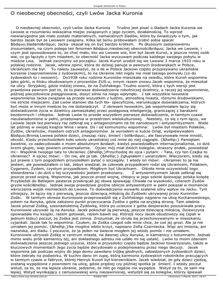 wreszcie jest ukraińskim miastem. Jednocześnie uważał, że Lwów będąc miastem jednego państwaukraińskiego, należy do wielu kultur. I z tym stwierdzeniem chyba może się zgodzić wielu z nas. Jacek