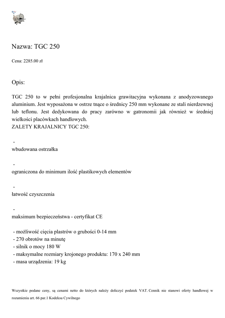 Nazwa: TGC 250 Cena: 2285.00 zł Opis: TGC 250 to w pełni profesjonalna krajalnica grawitacyjna wykonana z anodyzowanego aluminium. Jest wyposażona w ostrze tnące o średnicy 250 mm wykonane ze stali nierdzewnej lub teflonu. Jest dedykowana do pracy zarówno w gatronomii jak również w średniej wielkości placówkach handlowych. ZALETY KRAJALNICY TGC 250: wbudowana ostrzałka ograniczona do minimum ilość plastikowych elementów łatwość czyszczenia maksimum bezpieczeństwa - certyfikat CE - możliwość cięcia plastrów o grubości 0-14 mm - 270 obrotów na minutę - silnik o mocy 180 W - maksymalne rozmiary krojonego produktu: 170 x 240 mm - masa urządzenia: 19 kg Wszystkie podane ceny, są cenami netto do których należy doliczyć podatek VAT. Cennik nie stanowi oferty handlowej w rozumieniu art. 66 par.1 Kodeksu Cywilnego