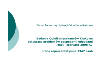 Zakład Termicznej Utylizacji Odpadów w Krakowie Badania Opinii mieszkańców Krakowa dotyczące problemów gospodarki odpadami /maj i czerwiec 2008 r./ próba reprezentatywna 1347 osób Badanie opinii (1) I. Akceptacja dla budowy spalarni odpadów Osoby zdecydowanie akceptujące budowę ZTPO – 86%, Osoby zdecydowanie nie akceptujące budowy ZTPO - 14%. Największe zrozumienie dla tej inwestycji mają mieszkańcy Łagiewnik, Swoszowic, Łobzowa i Czyżyn. Najniższy poziom akceptacji odnotowano w Podgórzu. II. Akceptacja budowy ekologicznej budowy spalarni odpadów na terenie własnej dzielnicy tak 45%; nie 42% mieszkańców III. Ocena negatywnego wpływu poniższych instalacji na zdrowie ludzkie: Składowisko odpadów - tak 64,2%; nie 18,8%, Kompostownia – tak 23,9%; nie 44,7%, ZTPO - tak 20%; nie 36,5%, Sortownia - tak 18,5%; nie 52,2%. Badanie opinii (2) IV. Ocena negatywnego wpływu poniższych instalacji na środowisko naturalne: Składowisko odpadów - tak 66,6%;nie 15,1%, Kompostownia – tak 24,8%; nie 44,5%, ZTPO - tak 21,6%; nie 34,4%, Sortownia - tak 17,9%; nie 51%. V. Która z instalacji jest najbardziej potrzebna w systemie gospodarki odpadami ? ZTPO - 43,6%, Sortownia odpadów - 31,8%, Kompostownia – 12,9%, Składowisko - 9,8%. VI. Mieszkańcy segregujący odpady: tak 50,3%; nie 49,7%. VII. Opinia dotycząca wprowadzenia obowiązku segregacji odpadów tak 58,7%; nie 17,1%; trudno powiedzieć 24,2%. Zakład Termicznej Utylizacji Odpadów w Krakowie Konsultacje społeczne dotyczące ZTPO 2007/2008 Konsultacje społeczne (1) Konsultacje społeczne rozpoczęły się w 2007 roku i trwają do dziś. Przede wszystkim wykonywały je Zakłady Usługowe „Południe”, ale także jednostki i spółki miejskie. Uczestniczyli w nich Radni Miasta Krakowa, Radni Dzielnic, przedstawiciele organizacji ekologicznych, eksperci z zakresu gospodarki odpadami, mieszkańcy Krakowa, w tym społeczności lokalne z terenów potencjalnych lokalizacji ZTPO oraz media. SPOTKANIA z Radnymi Miasta i Dzielnic oraz Mieszkańcami w 2007 r. 14.06; 28.06; 3.07; 5.07; 26.07; 9.08; 23.08; 26.09, 27.09; 11.10; 15.11; 18.10 - Dzielnica XIII; 9.11 - Dzielnica XIII - SP na Golikówce. Około 300 mieszkańców. 5.11 - Rada Dzielnicy XII.; 8.11 - Dzielnica XIV SPOTKANIA z Radnymi Miasta i Dzielnic oraz Mieszkańcami w 2008 r. 30.01; 7.03; 1.04- dz. XIV, spotkanie z Radą Dzielnicy; 12.05-dz. XIV spotkanie w SP 156 przy ul. Centralnej z mieszkańcami (ok.200); 3.06; 8.06; 3.07- Hotel Novotel oraz Wyższa Szkoła im.J.Tischnera; spotkanie zorganizowane przez Agencję „Profile” dla mieszkańców, radnych Miasta Krakowa i Dzielnic, organizacji i stowarzyszeń; 3.09-Zarząd Dzielnicy XIV Konsultacje społeczne (2) Konferencje 8-9.02.2007 - Seminarium „Gospodarka odpadami komunalnymi-wymiana doświadczeń we wdrażaniu dyrektyw UE oraz logistyczne i techniczne rozwiązania w dziedzinie gospodarki odpadami” 11.01.2008 - debata zorganizowana przez europosła B. Sonika „Czy utoniemy w śmieciach”: 17.01.2008 - debata w Radiu Kraków 3-4.04.2008 - Międzynarodowa Konferencja „Eko-Vis. Wykorzystanie energii z zakładów termicznego przekształcania odpadów komunalnych w systemach ciepłowniczych i energetycznych” 4.07.2008 - „Ochrona klimatu, hamulec czy bodziec dla gospodarki” Konferencja w Bibliotece Jagiellońskiej zorganizowana przez europosła B. Sonika. Spotkania Zespołu Zadaniowego ds. oceny realizacji I etapu Planu gospodarki odpadami oraz przygotowania wniosków dla realizacji etapu II 13.05.2008 - spotkanie z wójtami i burmistrzami powiatu ziemskiego krakowskiego oraz wielickiego, a także burmistrzem Myślenic. Podczas spotkania zadano uczestnikom pytania: o możliwość potencjalnej lokalizacji krakowskiej spalarni na terenie ich gmin oraz o ewentualny dowóz odpadów z ich terenów negatywne stanowisko oraz ewentualny dowóz odpadów z ich terenów do ZTPO. Na obydwa pytania odpowiedziano negatywnie. 25.09.2008 - spotkanie z firmą reprezentowaną przez Pana A. Szczepka „Piece Tunelowe” – w sprawie technologii spalania. Konsultacje społeczne (3) Promocja systemu gospodarki odpadami Działania związane z promocją i edukacją prowadzone były przez Krakowski Zarząd Gospodarki Komunalnej, Wydział Kształtowania Środowiska, MPO Sp. z.o.o. i pozostałe miejskie spółki komunalne. Dni Ziemi - kwiecień 2008 r. Festiwalu Recyclingu - czerwiec 2008 r. Media Akcji promocyjnej i edukacyjnej towarzyszyła akcja medialna. W jej wyniku powstało kilkadziesiąt artykułów w prasie lokalnej i ogólnopolskiej (obszerne artykuły np. w Dzienniku Polskim, ale także w Gazecie Krakowskiej, Gazecie Wyborczej, w Aurze, Przeglądzie Komunalnym, Tygodniku Nowohuckim, Metro i innych), relacje telewizyjne w TVP Kraków, w tym film autorstwa red. I. Pieczary o krakowskiej spalarni odpadów, w TVN, wiele debat na antenie m.in. Radia Kraków, a także innych rozgłośni. Odbyły się także dyskusje w redakcjach Aury oraz Nowej Energii. Kampania Czysta Akcja oraz Ekocentrum. KZK w 2008 r. rozpoczął kampanię informacyjno - edukacyjną „Ekocentrum System Gospodarki Odpadami”. Jej celem było podniesienie świadomości i poziomu wiedzy mieszkańców Krakowa w zakresie właściwego gospodarowania odpadów. Ważnym elementem kampanii jest strona http://www.ekocentrum.krakow.pl lub www.ekocentrum.krakow.pl oraz bezpłatna infolinia, dzięki którym mieszkańcy mają możliwość uzyskania odpowiedzi na pytania dotyczące zagadnień związanych z gospodarką odpadami. Kampania Ekocentrum stanowi kompleksową informację na temat istniejącego i docelowego systemu gospodarki odpadami. Na akcję składają się artykuły prasowe, plakaty, ulotki, filmy informacyjne zamieszczone na stronie www, krótkometrażowe prezentacje filmowe, reklama na pojazdach MPK, a także wystawy poświęcone tematyce gospodarki odpadami. Konsultacje społeczne (4) Listopad 2008 r. KHK S.A. planuje otwarcie punktów kons