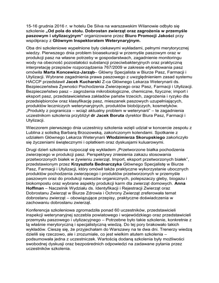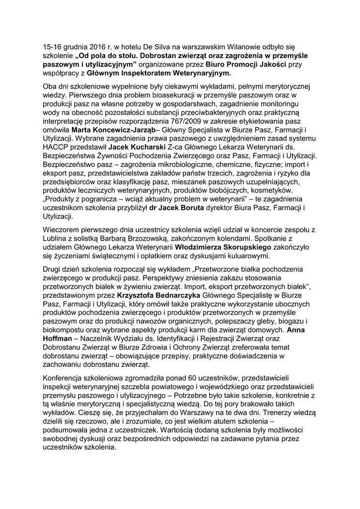 15-16 grudnia 2016 r. w hotelu De Silva na warszawskim Wilanowie odbyło się szkolenie „Od pola do stołu. Dobrostan zwierząt oraz zagrożenia w przemyśle paszowym i utylizacyjnym” organizowane przez Biuro Promocji Jakości przy współpracy z Głównym Inspektoratem Weterynaryjnym. Oba dni szkoleniowe wypełnione były ciekawymi wykładami, pełnymi merytorycznej wiedzy. Pierwszego dnia problem bioasekuracji w przemyśle paszowym oraz w produkcji pasz na własne potrzeby w gospodarstwach, zagadnienie monitoringu wody na obecność pozostałości substancji przeciwbakteryjnych oraz praktyczną interpretację przepisów rozporządzenia 767/2009 w zakresie etykietowania pasz omówiła Marta Koncewicz-Jarząb– Główny Specjalista w Biurze Pasz, Farmacji i Utylizacji. Wybrane zagadnienia prawa paszowego z uwzględnieniem zasad systemu HACCP przedstawił Jacek Kucharski Z-ca Głównego Lekarza Weterynarii ds. Bezpieczeństwa Żywności Pochodzenia Zwierzęcego oraz Pasz, Farmacji i Utylizacji. Bezpieczeństwo pasz – zagrożenia mikrobiologiczne, chemiczne, fizyczne; import i eksport pasz, przedstawicielstwa zakładów państw trzecich, zagrożenia i ryzyko dla przedsiębiorców oraz klasyfikację pasz, mieszanek paszowych uzupełniających, produktów leczniczych weterynaryjnych, produktów biobójczych, kosmetyków. „Produkty z pogranicza – wciąż aktualny problem w weterynarii” – te zagadnienia uczestnikom szkolenia przybliżył dr Jacek Boruta dyrektor Biura Pasz, Farmacji i Utylizacji. Wieczorem pierwszego dnia uczestnicy szkolenia wzięli udział w koncercie zespołu z Lublina z solistką Barbarą Brzozowską, zakończonym kolendami. Spotkanie z udziałem Głównego Lekarza Weterynarii Włodzimierza Skorupskiego zakończyło się życzeniami świątecznymi i opłatkiem oraz dyskusjami kuluarowymi. Drugi dzień szkolenia rozpoczął się wykładem „Przetworzone białka pochodzenia zwierzęcego w produkcji pasz. Perspektywy zniesienia zakazu stosowania przetworzonych białek w żywieniu zwierząt. Import, eksport przetworzonych białek”, przedstawionym przez Krzysztofa Bednarczyka Głównego Specjalistę w Biurze Pasz, Farmacji i Utylizacji, który omówił także praktyczne wykorzystanie ubocznych produktów pochodzenia zwierzęcego i produktów przetworzonych w przemyśle paszowym oraz do produkcji nawozów organicznych, polepszaczy gleby, biogazu i biokompostu oraz wybrane aspekty produkcji karm dla zwierząt domowych. Anna Hoffman – Naczelnik Wydziału ds. Identyfikacji i Rejestracji Zwierząt oraz Dobrostanu Zwierząt w Biurze Zdrowia i Ochrony Zwierząt zreferowała temat dobrostanu zwierząt – obowiązujące przepisy, praktyczne doświadczenia w zachowaniu dobrostanu zwierząt. Konferencja szkoleniowa zgromadziła ponad 60 uczestników, przedstawicieli inspekcji weterynaryjnej szczebla powiatowego i wojewódzkiego oraz przedstawicieli przemysłu paszowego i utylizacyjnego – Potrzebne było takie szkolenie, konkretnie z tą właśnie merytoryczną i specjalistyczną wiedzą. Do tej pory brakowało takich wykładów. Cieszę się, że przyjechałam do Warszawy na te dwa dni. Trenerzy wiedzą dzielili się rzeczowo, ale i zrozumiale, co jest wielkim atutem szkolenia – podsumowała jedna z uczestniczek. Wartością dodaną szkolenia były możliwości swobodnej dyskusji oraz bezpośrednich odpowiedzi na zadawane pytania przez uczestników szkolenia.