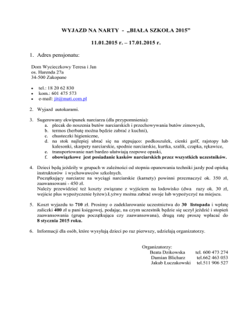 WYJAZD NA NARTY - „BIAŁA SZKOŁA 2015” 11.01.2015 r. – 17.01.2015 r. 1. Adres pensjonatu: Dom Wycieczkowy Teresa i Jan os. Harenda 27a 34-500 Zakopane tel.: 18 20 62 830 kom.: 601 475 573 e-mail: [email protected] 2. Wyjazd autokarami. 3. Sugerowany ekwipunek narciarza (dla przypomnienia): a. plecak do noszenia butów narciarskich i przechowywania butów zimowych, b. termos (herbatę można będzie zabrać z kuchni), c. chusteczki higieniczne, d. na stok najlepiej ubrać się na stępująco: podkoszulek, cienki golf, rajstopy lub kalesonki, skarpety narciarskie, spodnie narciarskie, kurtka, szalik, czapka, rękawice, e. transportowanie nart bardzo ułatwiają rzepowe opaski, f. obowiązkowe jest posiadanie kasków narciarskich przez wszystkich uczestników. 4. Dzieci będą jeździły w grupach w zależności od stopnia opanowania techniki jazdy pod opieką instruktorów i wychowawców szkolnych. Początkujący narciarze na wyciągi narciarskie (karnety) powinni przeznaczyć ok. 350 zł, zaawansowani - 450 zł. Należy przewidzieć też koszty związane z wyjściem na lodowisko (dwa razy ok. 30 zł, wejście plus wypożyczenie łyżew).Łyżwy można zabrać swoje lub wypożyczyć na miejscu. 5. Koszt wyjazdu to 710 zł. Prosimy o zadeklarowanie uczestnictwa do 30 listopada i wpłatę zaliczki 400 zł u pani księgowej, podając, na czym uczestnik będzie się uczył jeździć i stopień zaawansowania (grupa początkująca czy zaawansowana), drugą ratę proszę wpłacać do 8 stycznia 2015 roku. 6. Informacji dla osób, które wysyłają dzieci po raz pierwszy, udzielają organizatorzy. Organizatorzy: Beata Dzikowska tel. 600 473 274 Damian Blicharz tel.662 463 053 Jakub Łuczakowski tel.511 906 527
