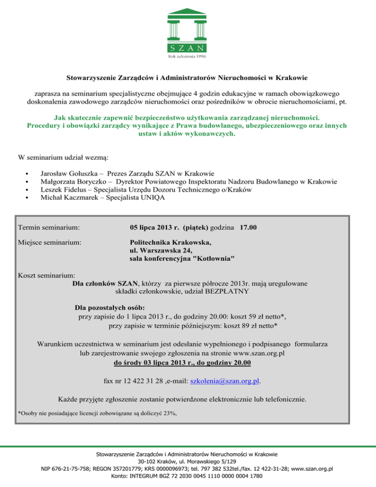 Stowarzyszenie Zarządców i Administratorów Nieruchomości w Krakowie zaprasza na seminarium specjalistyczne obejmujące 4 godzin edukacyjne w ramach obowiązkowego doskonalenia zawodowego zarządców nieruchomości oraz pośredników w obrocie nieruchomościami, pt. Jak skutecznie zapewnić bezpieczeństwo użytkowania zarządzanej nieruchomości. Procedury i obowiązki zarządcy wynikające z Prawa budowlanego, ubezpieczeniowego oraz innych ustaw i aktów wykonawczych. W seminarium udział wezmą: Jarosław Gołuszka – Prezes Zarządu SZAN w Krakowie Małgorzata Boryczko – Dyrektor Powiatowego Inspektoratu Nadzoru Budowlanego w Krakowie Leszek Fidelus – Specjalista Urzędu Dozoru Technicznego o/Kraków Michał Kaczmarek – Specjalista UNIQA Termin seminarium: 05 lipca 2013 r. (piątek) godzina 17.00 Miejsce seminarium: Politechnika Krakowska, ul. Warszawska 24, sala konferencyjna "Kotłownia" Koszt seminarium: Dla członków SZAN, którzy za pierwsze półrocze 2013r. mają uregulowane składki członkowskie, udział BEZPŁATNY Dla pozostałych osób: przy zapisie do 1 lipca 2013 r., do godziny 20.00: koszt 59 zł netto*, przy zapisie w terminie późniejszym: koszt 89 zł netto* Warunkiem uczestnictwa w seminarium jest odesłanie wypełnionego i podpisanego formularza lub zarejestrowanie swojego zgłoszenia na stronie www.szan.org.pl do środy 03 lipca 2013 r., do godziny 20.00 fax nr 12 422 31 28 ,e-mail: [email protected]. Każde przyjęte zgłoszenie zostanie potwierdzone elektronicznie lub telefonicznie. *Osoby nie posiadające licencji zobowiązane są doliczyć 23%, Stowarzyszenie Zarządców i Administratorów Nieruchomości w Krakowie 30-102 Kraków, ul. Morawskiego 5/129 NIP 676-21-75-758; REGON 357201779; KRS 0000096973; tel. 797 382 532tel./fax. 12 422-31-28; www.szan.org.pl Konto: INTEGRUM BGŻ 72 2030 0045 1110 0000 0004 1780 Program seminarium: I. Zintegrowany System Wsparcia Członków SZAN 1. Omówienie założeń systemu 2. Program Kompetentny Zarządca - założenia a. podnoszenie kwalifikacji b. ubezpieczenia c. ochrona danych osobowych d. obsługa księgowa e. obsługa prawna f. plan działania względem nieruchomości II. Obowiązki zarządcy wynikające z przepisów Prawa budowlanego: Obowiązki zarządcy - przeglądy coroczne i pięcioletnie Książka obiektu budowlanego Współpraca z Nadzorem Budowlanym Wytyczne przy sprawowaniu kontroli technicznych utrzymania obiektów budowlanych (procedury, zgłoszenia, pozwolenia) 5. Kary nakładane przez Nadzór Budowlany 1. 2. 3. 4. III. Obowiązki zarządcy wynikające z ustawy o dozorze technicznym. 1. Przepisy, warunki techniczne, normy, specyfikacje techniczne i zalecenia Europejskiej Komisji Dźwigowej dotyczące dźwigów. 2. Procedury UDT dotyczące modernizacji dźwigów - ścieżki postępowania dla użytkowników. 3. Modernizacja częściowa i kompleksowa. 4. Zalecenia UDT oraz najczęściej zgłaszane przez użytkowników problemów dotyczących dźwigów. IV. Ubezpieczenia 1. Odpowiedzialność cywilna podmiotów uczestniczących w gospodarce nieruchomościami i ich ubezpieczenie oc 2. Rodzaje ubezpieczeń odpowiedzialności cywilnej przeznaczone dla uczestników w gospodarce nieruchomościami 3. Reguły odpowiedzialności cywilnej w najbardziej typowych scenariuszach szkodowych 4. Odszkodowania w praktyce Stowarzyszenie Zarządców i Administratorów Nieruchomości w Krakowie 30-102 Kraków, ul. Morawskiego 5/129 NIP 676-21-75-758; REGON 357201779; KRS 0000096973; tel. 797 382 532tel./fax. 12 422-31-28; www.szan.org.pl Konto: INTEGRUM BGŻ 72 2030 0045 1110 0000 0004 1780 FORMULARZ ZGŁOSZENIOWY „Jak skutecznie zapewnić bezpieczeństwo użytkowania zarządzanej nieruchomości. Procedury i obowiązki zarządcy wynikające z Prawa budowlanego, ubezpieczeniowego oraz innych ustaw i aktów wykonawczych.” -Kraków, 05.07.2013 r Dane uczestnika szkolenia Imię i nazwisko Stanowisko Licencja zarządcy Licencja pośrednika E-mail Telefon Brak licencji Proszę zaznaczyć x Adres korespondencyjny Dane do faktury Nazwa firmy/ Imię i nazwisko Adres* *Opcjonalnie pieczęć NIP: firmy Warunki uczestnictwa: 1.Opłatę za szkolenie należy przekazać przelewem na konto Organizatora tj. Stowarzyszenie Zarządców i Administratorów Nieruchomości w Krakowie (SZAN) bez roszczenia o zwrot wpłaty w przypadku nieobecności na szkoleniu zgłoszonej osoby. 2.Zgłoszenie na szkolenie musi zostać potwierdzone podpisanym formularzem zgłoszeniowym. 3.Rezygnacja tylko w formie pisemnej. Brak pisemnej rezygnacji ze szkolenia najpóźniej na 2 dni przed planowanym terminem szkolenia skutkuje obciążeniem całkowitym kosztem za szkolenie. Brak wpłaty nie jest jednoznaczny z rezygnacją ze szkolenia. 4.Organizator zastrzega sobie prawo do zmiany daty oraz miejsca szkolenia w przypadku niewystarczającej ilości osób, które zadeklarowały udział w szkoleniu. W przypadku odwołania szkolenia z winy organizatora, SZAN zobowiązuje się do zwrotu poniesionych kosztów bez odsetek w przeciągu 10 dni od daty odwołania szkolenia. 5.Organizator może zmienić termin szkolenia oraz wykładowcę z przyczyn obiektywnych. 6.Dopuszcza się zmianę uczestnika, po uprzednim poinformowaniu organizatora. Akceptuję warunki płatności i wyrażam zgodę na wystawienie faktury VAT bez mojego podpisu . Wyrażam zgodę na przetwarzanie moich danych osobowych zawartych w powyższym formularzu przez Stowarzyszenie Zarządców i Administratorów Nieruchomości w Krakowie na potrzeby spraw organizacyjnych, dotyczących uczestnictwa w szkoleniu a także na otrzymywanie informacji handlowej pocztą tradycyjną lub elektroniczną oraz udostępnienie moich danych innym podmiotom współpracującym przy realizacji szkolenia zgodnie z ustawa z dnia 29 sierpnia 1997 r. o ochronie danych osobowych (Dz. U. z 1997 r. nr 133, poz. 883 z późni. zm.). Wyrażam zgodę na przesłanie faktury VAT w formacie PDF na adres e-mail podany w formularzu zgło