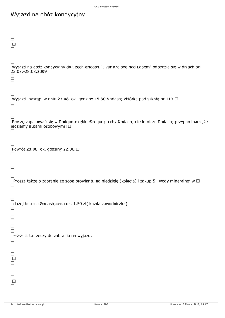 UKS Softball Wrocław Wyjazd na obóz kondycyjny Wyjazd na obóz kondycyjny do Czech –"Dvur Kralove nad Labem" odbędzie się w dniach od 23.08.-28.08.2009r. Wyjazd nastąpi w dniu 23.08. ok. godziny 15.30 – zbiórka pod szkołą nr 113. Proszę zapakować się w „miękkie” torby – nie lotnicze – przypominam ,że jedziemy autami osobowymi ! Powrót 28.08. ok. godziny 22.00. Proszę także o zabranie ze sobą prowiantu na niedzielę (kolacja) i zakup 5 l wody mineralnej w dużej butelce –cena ok. 1.50 zł( każda zawodniczka). -->> Lista rzeczy do zabrania na wyjazd. http://ukssoftball.wroclaw.pl Kreator PDF Utworzono 3 March, 2017, 19:47