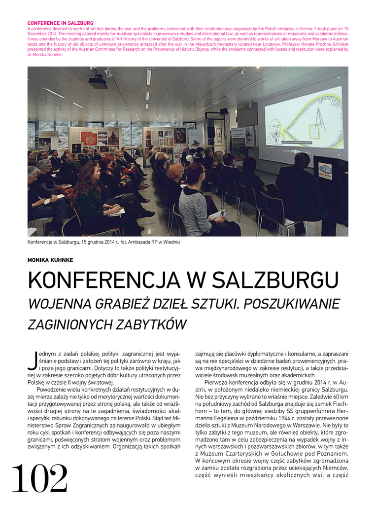 cOnfEREncE In SALzBuRG A conference devoted to works of art lost during the war and the problems connected with their restitution was organised by the Polish embassy in Vienna. It took place on 15 December 2014. The meeting catered mainly for Austrian specialists in provenance studies and international law, as well as representatives of museums and academic milieus. It was attended by the students and graduates of Art History of the University of Salzburg. Some of the papers were devoted to works of art taken away from Warsaw to Austrian lands and the history of old objects of unknown provenance amassed after the war in the Mauerbach monastery located near Linderow. Professor Renate Prochno-Schinkel presented the activity of the Austrian Committee for Research on the Provenance of Historic Objects, while the problems connected with losses and restitution were explained by Dr Monika Kuhnke. Konferencja w Salzburgu, 15 grudnia 2014 r., fot. Ambasada RP w Wiedniu mOnIKA KuhnKE KONFERENCJA W SALZBURGU WOJENNA GRABIEż DZIEŁ SZTUKI. POSZUKIWANIE ZAGINIONyCH ZAByTKÓW J ednym z zadań polskiej polityki zagranicznej jest wyjaśnianie podstaw i założeń tej polityki zarówno w kraju, jak i poza jego granicami. Dotyczy to także polityki restytucyjnej w zakresie szeroko pojętych dóbr kultury utraconych przez Polskę w czasie II wojny światowej. Powodzenie wielu konkretnych działań restytucyjnych w dużej mierze zależy nie tylko od merytorycznej wartości dokumentacji przygotowywanej przez stronę polską, ale także od wrażliwości drugiej strony na te zagadnienia, świadomości skali i specyfiki rabunku dokonywanego na terenie Polski. Stąd też Ministerstwo Spraw Zagranicznych zainaugurowało w ubiegłym roku cykl spotkań i konferencji odbywających się poza naszymi granicami, poświęconych stratom wojennym oraz problemom związanym z ich odzyskiwaniem. Organizacją takich spotkań 102 zajmują się placówki dyplomatyczne i konsularne, a zapraszani są na nie specjaliści w dziedzinie badań proweniencyjnych, prawa międzynarodowego w zakresie restytucji, a także przedstawiciele środowisk muzealnych oraz akademickich. Pierwsza konferencja odbyła się w grudniu 2014 r. w Austrii, w położonym niedaleko niemieckiej granicy Salzburgu. Nie bez przyczyny wybrano to właśnie miejsce. Zaledwie 60 km na południowy zachód od Salzburga znajduje się zamek Fischhorn – to tam, do głównej siedziby SS gruppenführera Hermanna Fegeleina w październiku 1944 r. zostały przewiezione dzieła sztuki z Muzeum Narodowego w Warszawie. Nie były to tylko zabytki z tego muzeum, ale również obiekty, które zgromadzono tam w celu zabezpieczenia na wypadek wojny z innych warszawskich i pozawarszawskich zbiorów, w tym także z Muzeum Czartoryskich w Gołuchowie pod Poznaniem. W końcowym okresie wojny część zabytków zgromadzona w zamku została rozgrabiona przez uciekających Niemców, część wynieśli mieszkańcy okolicznych wsi, a część amerykańscy żołnierze, który zajęli zamek z początkiem maja 1945 r. Bohdanowi Urbanowiczowi, członkowi polskiej misji rewindykacyjnej, udało się rok później rewindykować do Polski jedynie to, co pozostało. Kolejne dzieła sztuki wywiezione z Warszawy do zamku Fischhorn zaczęły wracać od osób prywatnych lub z muzeów rozsianych po całym świecie dopiero po ponad półwieczu. Wówczas ze Stanów Zjednoczonych Muzeum Narodowe w Warszawie odzyskało Portret Podlewskiego pędzla Jana Matejki, a zbiory Czartoryskich w Krakowie – XVII-wieczny Portret dworzanina autorstwa Jana Mostaerta pochodzący z Gołuchowa. Z Ameryki Południowej (także do warszawskiego muzeum) powrócił zespół XIX-wiecznych rysunków i grafik, a dalsza część tego zbioru, odnaleziona w Zell am See obok Fischhorn, przekazana została przez osobę prywatną. W tej samej miejscowości odnalazł się również średniowieczny krzyż z kolekcji gołuchowskiej. To właśnie zamek Fischhorn i losy zgromadzonych w nim zabytków pochodzących z Polski stały się tematem dwóch pierwszych referatów wygłoszonych podczas konferencji, które przygotowali studenci historii sztuki Uniwersytetu w Salzburgu. Magdalena Denk przypomniała dzieje zamku i jego rolę po przejęciu go przez SS, szczególnie w latach 1944–1946, z którymi wiąże się historia zabytków przywiezionych z Polski. Historię XII-wiecznego krzyża z kolekcji Czartoryskich w Gołuchowie przedstawiła Sandra Kobel. Krzyż z zamku Fischhorn najpewniej wykradł mieszkaniec jednej z okolicznych miejscowości i przez kilkadziesiąt lat przechowywany był on w jego domu. Odnaleziony został przez mieszkankę Zell am See w… pojemniku na śmieci. Po identyfikacji zabytek wrócił do Polski. Klemens Leitner przygotował tekst dotyczący rewindykacji, tym razem jednak z Polski do Austrii. Sprawa dotyczyła dwóch XVII-wiecznych gobelinów pochodzących ze zbiorów wiedeńskiego Kunsthistorisches Museum, które znalazły się w czasie wojny we Wrocławiu. Dekorowały dom gauleitera Dolnego Śląska Karla Hankego. Po zakończeniu działań wojennych obie tkaniny znaleziono na terenie Śląska i jako obiekty o nieznanej proweniencji przekazano je do Muzeum Narodowego w Warszawie. Dopiero w latach 80. udało się ustalić ich pochodzenie i zwrócono je do Wiednia. Ostatni z referatów studyjnych dotyczył spraw austriackich, a w szczególności tzw. zbioru Mauerbach szeroko komentowanego w latach 90. Sprawę tę, jako przykład rozwiązywania problemu dotyczącego dzieł sztuki o nieznanej proweniencji, przypomniała Karla Linderowa. Chodzi o zabytki, które pozostały niezidentyfikowane w tzw. Collecting Points, pochodzące najpewniej z prywatnych austriackich zbiorów żydowskich przekazanych Austrii przez administrację amerykańską z obowiązkiem odnalezienia ich prawowitych właścicieli i zwrotu im ich własności. Austria jednak uczyniła niewiele, aby z tego obowiązku się wywiązać, a dzieła sztuki z