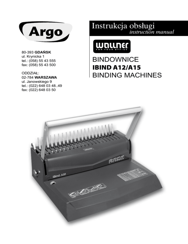 Instrukcja obsługi 80-393 GDAŃSK ul. Krynicka 1 tel.: (058) 55 43 555 fax: (058) 55 43 500 ODDZIAŁ: 02-784 WARSZAWA ul. Janowskiego 9 tel.: (022) 648 03 48..49 fax: (022) 648 03 50 instruction manual BindownicE ibind A12/A15 BINDING MACHINEs PL bindownice Wallner iBind A12 / A15 Uwaga ! Przed użyciem przeczytaj dokładnie instrukcję obsługi. Trzymaj urządzenie z dala od dzieci. Trzymaj urządzenie z dala od ognia i płynów. Umieść bindownicę w stabilnym i bezpiecznym miejscu w celu zabezpieczenia przed upadkiem lub spowodowaniem uszkodzenia urządzenia lub osoby je obsługującej. 5. Przed standardowym użytkowaniem, przetestuj urządzenie w celu sprawdzenia prawidłowego ułożenia papieru. 6. Przy dziurkowaniu plastikowych okładek sugerujemy umieszczenie ich pomiędzy dwoma kartkami papieru. 7. Urządzenie zostało zaprojektowane do oprawy przy użyciu plastikowych grzbietów i plastikowych okładek. 1. 2. 3. 4. Bindownice do grzbietów plastikowych 1. 2. 3. 4. 5. 6. Pojemnik na ścinki Dźwignia dziurkująca / bindująca Przełącznik do otwierania grzbietów Regulator głębokości dziurkowania Ogranicznik papieru Szczelina dziurkująca 2 1 3 6 4 5 Instrukcja obsługi Przed użytkowaniem umieść bindownicę w stabilnym i bezpiecznym miejscu. Dziurkowanie i bindowanie 1. Użyj ogranicznika rozmiaru papieru aby odpowiednio umieścić papier w formacie A4 lub mniejszym. 2. Naciśnij dźwignię aby przedziurkować kartki, a następnie zwolnij ją. 3. Przesuń przełącznik do pozycji open, aby otworzyć grzbiet. 4. Nałóż na grzbiet przedziurkowane okładki i kartki. 5. Zwolnij przełącznik do otwierania grzbietów i dźwignię, w celu zaciśnięcia grzbietu. 6. Wyjmij oprawiony dokument. © ARGO S.A. www.argo.pl 2 PL 1 2 3 4 5 6 Czyszczenie pojemnika na ścinki 1. Wyciągnij pojemnik na ścinki znajdujący się w dole urządzenia, usuń ścinki i wsuń z powrotem. 2. Pojemnik na ścinki opróżniaj regularnie. Dane techniczne: Model Format oprawianego dokumentu iBind A12 iBind A15 A4 (21 oczek) A4 (21 oczek) Maksymalna ilość jednorazowo dziurkowanych kartek A4 12 15 Maksymalna ilość oprawianych kartek 450 450 + + Pojemnik na ścinki Tabela doboru wielkości grzbietu: Rozmiar grzbietu (mm) 6 8 10 12,5 14 16 19 22 25 28,5 32 38 45 51 Maks. ilość kartek 25 45 65 105 125 145 165 210 240 270 300 350 440 500 Zalecenia 1. 2. 3. Dziurkowanie maksymalnych ilości kartek dopuszczalnych dla danego modelu niejest właściwym sposobem użytkowania bindownic. Eksploatacja każdego urządzeniaz maksymalnymi wartościami obciążeń prowadzi do zmniejszenia jego żywotności. Nie należy wkładać większych ilości kartek niż maksymalna. Może to bowiem spowodować zablokowanie układów mechanicznych, znacznie zmniejszających trwałość, a nawet prowadzić do jego uszkodzenia. Należy regularnie opróżniać pojemnik na ścinki. © ARGO S.A. www.argo.pl 3 EN Wallner iBind A12 / A15 binding machines Attention ! Read this operation manual carefully before using. Keep the machine separately from children. Keep the machine away from fire and liquid. Put the machine on a stable and safe place in order to prevent it from falling or causing any injury to people or the machine itself. 5. Test the machine with some scrap paper before formally punching and binding, to make sure whether the position is correct to punch. 6. When punching plastic covers, we suggest that the covers should be clipped between two pieces of paper. 7. This machine is only designed to use plastic comb rings and covers. 1. 2. 3. 4. binding machines description 1. 2. 3. 4. 5. 6. Wastepaper tray Punching / Binding handle Comb opening lock Margin Depth Adjuster Paper-size guide Paper entrance 2 1 3 6 4 5 Operation guide Place the machine on a stable and safe place before using. Punching and binding operation 1. Use the ‚paper-size guide to adjust size for A4 or below than A4. 2. Press the handle to punch holes and then release it. 3. To open the comb ring pull over the comb opening lock to the OPEN position. 4. Place the punched covers and pages onto the comb. 5. To close the comb release the comb opening lock and return the handle to the original position. 6. Take out the binded document. © ARGO S.A. www.argo.pl 4 EN 1 2 3 4 5 6 Clean up the wastepaper tray 1. PuIl out the wastepaper tray from the bottom of the machine, clean it and insert it back again. 2. Please clean up the wastepaper tray frequently. Specifications Model iBind A12 iBind A15 Binding length A4 (21 rings) A4 (21 rings) Punches up to 12 15 Binding up to 450 450 + + Wastepaper tray BINDING CAPACITY Determine the correct comb's diameter (size) for your document: Ring size (mm) 6 8 10 12,5 14 16 19 22 25 28,5 32 38 45 51 Sheet (70-80g) 25 45 65 105 125 145 165 210 240 270 300 350 440 500 Notes 1. 2. 3. Punching maximal amount of sheets, acceptable for given model, is not a correct method of usage of binding machines. Exploitation of every device with maximal acceptable volumes leads to reduction of service life. It is not allowed to insert into binding machine more sheets than quoted as maximal amount. It could cause paper jam and may lead to overloading of mechanical unit and as a result decrease of durability and even damage. Empty the wastepaper tray regularly. © ARGO S.A. www.argo.pl 5