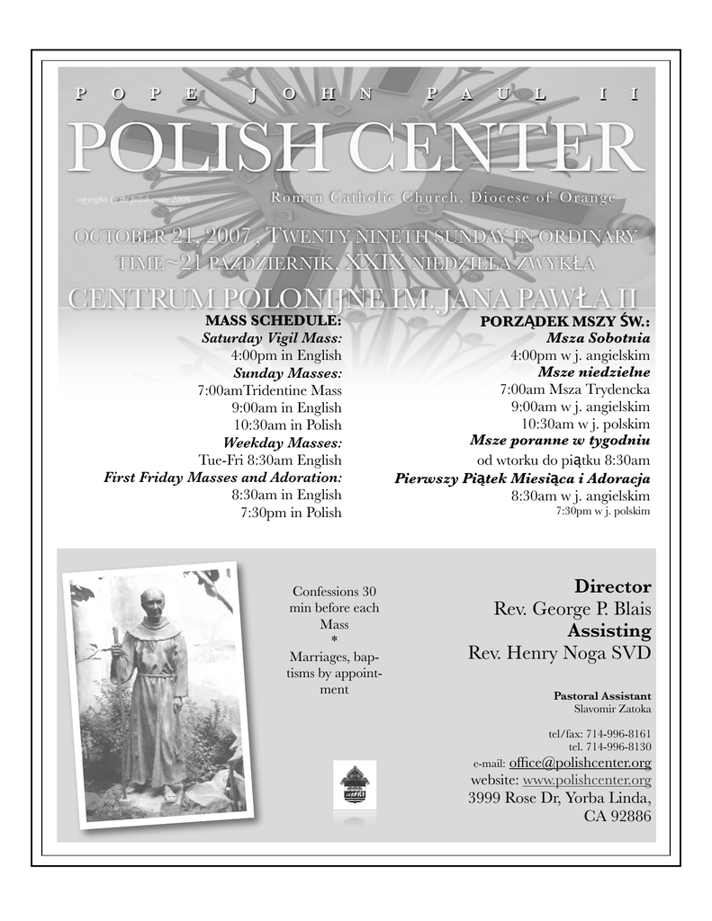 P O P E J O H N P A U L I I POLISH CENTER copyrights by the polish center 2006 Ro m a n C a t h o l i c C h u r c h , D i o c e s e o f O r a n g e OCTOBER 21, 2007 , TWENTY NINETH SUNDAY IN ORDINARY TIME~21 PAZDZIERNIK, XXIX NIEDZIELA ZWYK!A CENTRUM POLONIJNE IM. JANA PAW!A II MASS SCHEDULE: Saturday Vigil Mass: 4:00pm in English Sunday Masses: 7:00amTridentine Mass 9:00am in English 10:30am in Polish Weekday Masses: Tue-Fri 8:30am English First Friday Masses and Adoration: 8:30am in English 7:30pm in Polish Confessions 30 min before each Mass * Marriages, baptisms by appointment PORZ!DEK MSZY "W.: Msza Sobotnia 4:00pm w j. angielskim Msze niedzielne 7:00am Msza Trydencka 9:00am w j. angielskim 10:30am w j. polskim Msze poranne w tygodniu od wtorku do pi"tku 8:30am Pierwszy Pi#tek Miesi#ca i Adoracja 8:30am w j. angielskim 7:30pm w j. polskim Director Rev. George P. Blais Assisting Rev. Henry Noga SVD Pastoral Assistant Slavomir Zatoka tel/fax: 714-996-8161 tel. 714-996-8130 e-mail: [email protected] website: www.polishcenter.org 3999 Rose Dr, Yorba Linda, CA 92886 Page 2 MESSAGE FROM THE DIRECTOR XXIX Sunday in Ordinary Time Oct. 20 - 21 Today we celebrate World Mission Sunday, a day in which we are invited to reflect on the missionaries in the world and our participation in their efforts. In the Gospel, we hear the verse: “but when the Son of Man comes, will He find faith on earth.” It is in and through the work of the missionaries that the Gospel message will be spread to the ends of the earth. On this Mission Sunday, I would like us to reflect on the first reading. Moses climbed to the top of the hill and as long as he held his arms outstretched high his army was successful, but when he grew tired and his arms fell, so too did his army. He utilized Aaron and Hur to assist him in keeping his arms up high and likewise those working in the mission world sometimes grow tired and need our assistance to persevere in their call to win the battle to promote the Gospel in the world. As Catholics, we are called to promote the Gospel message of Life, Love, and compassion for and to all the world. How can we help lift the spirits of those working in the missions? The first and easiest way is to constantly pray for them and the spread of the Gospel. Let us always remember, in our daily prayer, the work of the missions and missionaries. Another way to assist the spread of the Gospel is to consider giving some of our time to go to the missions to proclaim the message of Jesus to the world that we live in. The mission territory is both far and remote as well as here in our own country and city. In our work places, neighborhoods and homes, we need to proclaim the Gospel values by how we live our lives. The final way that we can assist the work of the Missions is with our financial contribution. On this Mission Sunday, I ask you to join me in being generous in our financial contribution to keep the work of the missionaries active. It is in and through our financial contributions that the Church is able to continue its work of spreading the Gospel. As Jesus said:”The harvest is abundant but laborers are few.” May we send our prayerful and financial support for the success of the laborers in the missions. May we always be like Aaron and Hur in assisting the laborers in battle. May God Bless you and Mary keep you. Fr. George P. Blais Director MESSAGE FROM THE DIRECTOR XXIX Niedziela zwykła, 21 pażdziernik 2007 Dzisiaj Niedziela Misyjna, dzień w którym rozważamy pracę misjonarzy na całym świecie i naszym w ich pracy udziale. W Ewangelii słyszymy dziś pytanie: „Czy jednak Syn Człowieczy znajdzie wiarę na ziemi, gdy przyjdzie?” Praca misjonarzy to właśnie niesienie Słowa Bożego do wszystkich zakątków świata. Pragnę właśnie dzisiaj, w Niedzielę Misyjną poświęcić kilka słów pierwszemu czytaniu. Mojżesz wspiął się na szczyt góry i tak długo jak trzymał wzniesione do góry ręce jego armia wygrywała bitwę, ale kiedy ręce opadły ze zmęczenia zaczynali przegrywać. Aaron i Chur podtrzymywali więc ręce Mojżesza. Tak samo misjonarze potrzebują naszej pomocy kiedy tracą siły i wytrwałość w głoszeniu Słowa Bożego. Obowiązkiem każdego Katolika jest głoszenie Słowa Bożego, Życia, Miłości i współczucia dla całego świata. Jak możemy pomóc misjonarzom? Poprzez naszą modlitwę wspierającą ich pracę. Pamiętajmy o nich w naszej codziennej modlitwie. Możemy też pomóc ofiarowując nasz czas i pracę jako woulunariusz. Misje to nie tylko odległe miejsca w egzotycznych zakątkach świata, to także nasze ulice, sąsiedzi. Pomagając innym i dając dobry przykład naszym zachowaniem głosimy Słowo Boże. Kolejnym sposobem wsparcia pracy misjonarzy jest pomoc finansowa. Dzisiaj, w Niedzielę Misyjną zwracam się do was o szczodre wsparcie misji naszego Kościoła. To dzięki wam i waszej pomocy finansowej trudna praca Kościoła jest kontynuowana. Jezus powiedział: „Żniwo wprawdzie wielkie, ale robotników mało..”(Łk 10, 1-12). Pamiętajmy o pracy misyjnej, wspierajmy ją w naszych modlitwach oraz materialnie. Bądźmy jak Aaron i Chur pomagając zwyciężyć bitwę którą prowadzą misjonarze. Niech wam Bóg błogosławi i Maryja Panna ma zawsze w opiece. Ks. George P. Blais dyrektor READINGS FOR THE WEEK Monday: Rom 4:20-25; Lk 12:13-21 Tuesday: Rom 5:12, 15b, 17-19, 20b-21; Lk 12:35-38 Wednesday: Rom 6:12-18; Lk 12:39-48 Thursday: Rom 6:19-23; Lk 12:49-53 Friday: Rom 7:18-25a; Lk 12:54-59 Saturday: Rom 8:1-11; Lk 13:1-9 Sunday: Sir 35:12-14, 16-18; Ps 34; 2 Tm 4:6-8, 16-18; Lk 18:9-14 Page 3 KOMENTARZ LITURGICZNY Cykl C, 29 Niedziela Roku Czytania: Wj. 17:8-13; 2Tm. 3:14-4:2; Łk. 18:1-8 ...Zawsze powinni się modlić i nie ustawać... Trwanie przed Bogiem w modlitwie jest tematem dzisiejszych tekstów liturgii. Modlitwa zawsze była dla czlowieka rzeczą trudną i kłopotliwą. Dla wielu z nas jest stratą czasu. Nawet człowiek