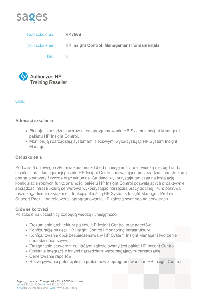 Kod szkolenia: Tytuł szkolenia: Dni: HK756S HP Insight Control: Management Fundamentals 3 Opis: Adresaci szkolenia Planują i zarządzają wdrożeniem oprogramowania HP Systems Insight Manager i pakietu HP Insight Control. Monitorują i zarządzają systemami sieciowymi wykorzystując HP System Insight Manager Cel szkolenia Podczas 3 dniowego szkolenia kursanci zdobędą umiejętności oraz wiedzę niezbędną do instalacji oraz konfiguracji pakietu HP Insight Control pozwalającego zarządzać infrastrukturą opartą o serwery fizyczne oraz wirtualne. Studenci wykorzystają ten czas na instalację i konfigurację różnych funkcjonalności pakietu HP Insight Control pozwalających proaktywnie zarządzać infrastrukturą serwerową wykorzystując narzędzia pracy zdalnej. Kurs pokrywa także zagadnienia związane z funkcjonalnością HP Systems Insight Manager: ProLiant Support Pack i kontrolą wersji oprogramowania HP zainstalowanego na serwerach. Główne korzyści Po szkoleniu uczestnicy zdobędą wiedzę i umiejętności: Zrozumienie architektury pakietu HP Insight Control oraz agentów Konfigurację pakietu HP Insight Control i monitoring infrastruktury Konfigurowanie opcji bezpieczeństwa w HP System Insight Manager i tworzenie narzędzi dodatkowych Zarządzanie serwerem na ktrótym zainstalowany jest pakiet HP Insight Control Opisanie integracji z innymi narzędziami wspomagającymi zarządzanie Generowanie raportów Rozwiązywanie potencjalnych problemów z oprogramowaniem HP Insight Control Opisanie i konfigurowanie funkcjonalności pozwalające zarządzać: obudowami HP BladeSystem oraz kontrolą wersji opgrogramowania ProLiant Support Pack zainstalowanego na montorowanych serwerach Wymagania Ukończenie kursu: Introduction to HP Insight Control WBT (HK317AAE) Ukończenie kursu: HP Insight Foundation (HE643S) Znajomość poniższych systemów operacyjnych: Microsoft Windows 2003 Standard, 2003 Enterprise Edition, 2008 lub Windows XP RedHat Enterprise Linux AS lub RedHat Enterprise Linux ES SuSE Linux Enterprise Znajomość podstawowych terminologii sieciowych oraz podstaw bezpieczeństwa IT Parametry szkolenia 3*8 godzin (3*7 godzin netto) wykładów i warsztatów. Wielkość grupy: maks. 8-10 osób. Program szkolenia: Moduł 1: Ogólne informacje o produkcie Opis pakietu HP Insight Control i oprogramowania HP Systems Insight Manager Opis nowych funkcjonalności dostępnych w HP Insight Control oraz HP Systems Insight Manager Sposoby wykorzystania funkcjonalności w zarządzaniu zdalnymi systemami Komponenty i aplikacje wymagane do zarządzania systemem Określenie dostępności oprogramowania Określenie zasobów pakietu Opis opieki gwarancyjnej dla systemów Windows, Linux and HP-UX Moduł 2: Podstawy zarządzania infrastruktura Zdefiniowanie pojęcia zarządzania systemami Kluczowe elementy zarządzania systemami Możliwości i komponenty karty iLO Komponenty SmartStart do zarządzania serwerami ProLiant Opis funkcjonalności Smart Update Manager służącej do aktualizacji oprogramowania i sterowników Porównanie komponentów ProLiant Support Pack i narzędzi wspomagających zarządzanie Opis agentów Insight Management Agents Rozwiązywanie problemów agentów Wykorzystanie System Management Homepage do zarządzania pojedynczym serwerem Komponenty i możliwości WBEM Rola WMI i interakcja z WBEM Komponenty i możliwości Version Control Wykorzystanie Version Control Agent i Version Control Repository Moduł 3: Instalacja oprogramowania po przez Version Control Architektura funkcjonalności Version Control Wymagania niezbędne do instalacji repozytorium oprogramowania Konfiguracja repozytorium oprogramowania Opis kroków aktualizacji zarządzanego systemu Laboratorium: Zarządzanie systemem Kurs Insight Control, Foundations of Management and Monitoring with Systems Insight Manager v7.0 skupia się na koncepcji uproszczenia zarządzania systemami. Celem tego laboratorium jest zapoznanie kursanta z ideą zarządzania systemem z perspektywy jednego systemu i pokazania wymagań jakie należy spełnić aby ręcznie wykonać zadania zarządzania bez oprogramowania HP Systems Insight Manager 7.0 i Insight Software. Po zakończeniu tego modułu kursant będzie potrafił: Zaktualizować funkcjonalność Version Control Repository Manager (VCRM) wraz z ProLiant Support Packs Skonfigurować Simple Network Management Protocol (SNMP) Zarządzać repozytorium VCRM Moduł 4: Typowa Instalacja Zadania podczas instalacji Kroki instalacji pakietu HP Insight Control na centralnym serwerze zarządzania - Central Management Server (CMS) Wyjaśnienie roli WMI Mapper i procesu konfiguracji Wyjaśnienie procesu aktualizacji oprogramowania HP Systems Insight Manager Kroki niezbędne do usunięcia oprogramowania HP Systems Insight Manager Moduł 5: Konfiguracja Opis i konfiguracja strony domowej Opis dodawania użytkowników i uprawnień Opis ustawienia wykrywania sprzętu Nawigacja poprzez strony zarządzanych systemów Opis konfiguracji zadań odpowiedzialnych za weryfikację stanu sprzętu i oprogramowania Opis konfiguracji powiadomień Laboratorium: Konfiguracja HP Insight Control W tym laboratorium kursant przeprowadzi podstawową konfigurację pakietu HP Insight Control wymaganą po instalacji. W wirtualnym laboratorium pakiet HP Insight Control został zainstalowany wcześniej dla oszczędności czasu. Po skończonym laboratorium kursant zdobędzie umiejętności: Dostęp do HP Systems Insight Manager Poruszania się w interfejsie HP Systems Insight Manager Konfiguracji linków systemowych HP Systems Insight Manager Uruchamiania “First Time Wizard” Tworzenia użytkowników w HP Systems Insight Manager Uruchomienia automatycznego wykrywania sprzętu Przeprowadzenia ręcznego wykrywania Przeprowadzenia zapytania o status sprzętu Przeglądania zdarzeń w HP Systems Insight Manager Tworzenia własnych skrzynek narzędziowych Tworzenia autoryzacji (powiązanie użytkownika, uprawnień i sys