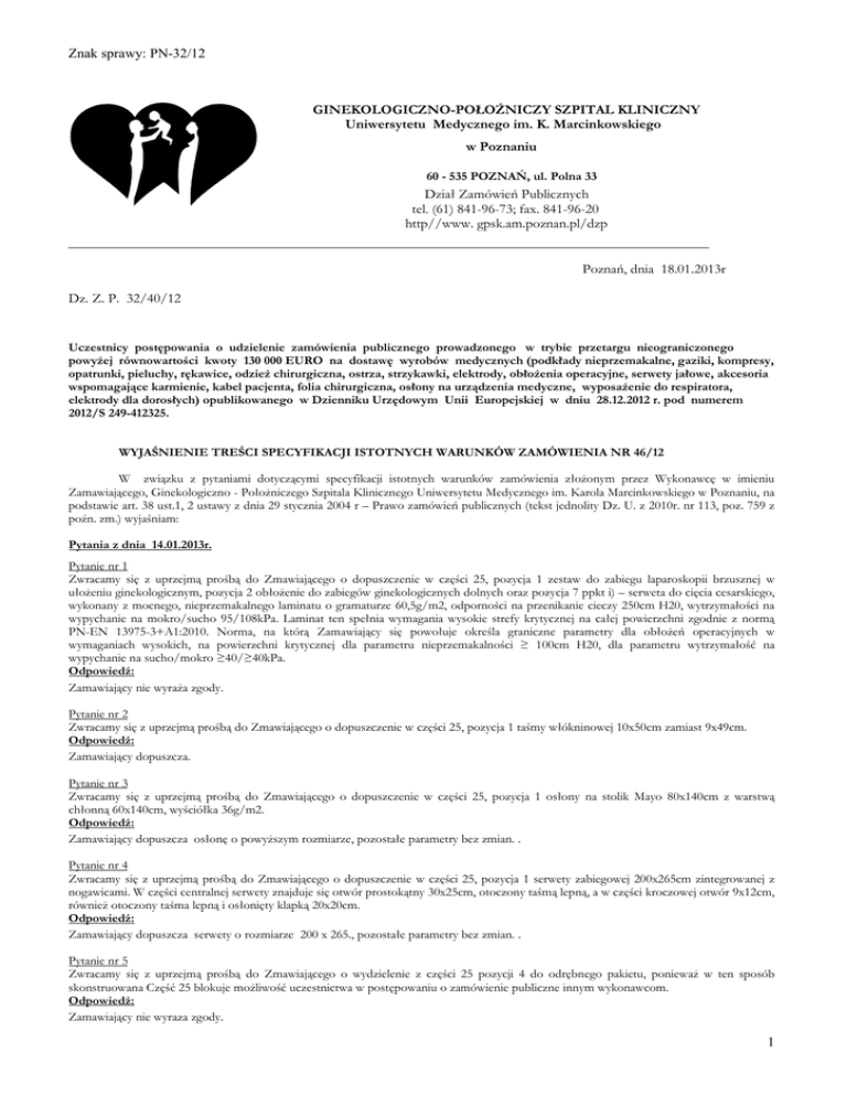 Znak sprawy: PN-32/12 GINEKOLOGICZNO-POŁOŻNICZY SZPITAL KLINICZNY Uniwersytetu Medycznego im. K. Marcinkowskiego w Poznaniu 60 - 535 POZNAŃ, ul. Polna 33 Dział Zamówień Publicznych tel. (61) 841-96-73; fax. 841-96-20 http//www. gpsk.am.poznan.pl/dzp ___________________________________________________________________________ Poznań, dnia 18.01.2013r Dz. Z. P. 32/40/12 Uczestnicy postępowania o udzielenie zamówienia publicznego prowadzonego w trybie przetargu nieograniczonego powyżej równowartości kwoty 130 000 EURO na dostawę wyrobów medycznych (podkłady nieprzemakalne, gaziki, kompresy, opatrunki, pieluchy, rękawice, odzież chirurgiczna, ostrza, strzykawki, elektrody, obłożenia operacyjne, serwety jałowe, akcesoria wspomagające karmienie, kabel pacjenta, folia chirurgiczna, osłony na urządzenia medyczne, wyposażenie do respiratora, elektrody dla dorosłych) opublikowanego w Dzienniku Urzędowym Unii Europejskiej w dniu 28.12.2012 r. pod numerem 2012/S 249-412325. WYJAŚNIENIE TREŚCI SPECYFIKACJI ISTOTNYCH WARUNKÓW ZAMÓWIENIA NR 46/12 W związku z pytaniami dotyczącymi specyfikacji istotnych warunków zamówienia złożonym przez Wykonawcę w imieniu Zamawiającego, Ginekologiczno - Położniczego Szpitala Klinicznego Uniwersytetu Medycznego im. Karola Marcinkowskiego w Poznaniu, na podstawie art. 38 ust.1, 2 ustawy z dnia 29 stycznia 2004 r – Prawo zamówień publicznych (tekst jednolity Dz. U. z 2010r. nr 113, poz. 759 z poźn. zm.) wyjaśniam: Pytania z dnia 14.01.2013r. Pytanie nr 1 Zwracamy się z uprzejmą prośbą do Zmawiającego o dopuszczenie w części 25, pozycja 1 zestaw do zabiegu laparoskopii brzusznej w ułożeniu ginekologicznym, pozycja 2 obłożenie do zabiegów ginekologicznych dolnych oraz pozycja 7 ppkt i) – serweta do cięcia cesarskiego, wykonany z mocnego, nieprzemakalnego laminatu o gramaturze 60,5g/m2, odporności na przenikanie cieczy 250cm H20, wytrzymałości na wypychanie na mokro/sucho 95/108kPa. Laminat ten spełnia wymagania wysokie strefy krytycznej na całej powierzchni zgodnie z normą PN-EN 13975-3+A1:2010. Norma, na którą Zamawiający się powołuje określa graniczne parametry dla obłożeń operacyjnych w wymaganiach wysokich, na powierzchni krytycznej dla parametru nieprzemakalności ≥ 100cm H20, dla parametru wytrzymałość na wypychanie na sucho/mokro ≥40/≥40kPa. Odpowiedź: Zamawiający nie wyraża zgody. Pytanie nr 2 Zwracamy się z uprzejmą prośbą do Zmawiającego o dopuszczenie w części 25, pozycja 1 taśmy włókninowej 10x50cm zamiast 9x49cm. Odpowiedź: Zamawiający dopuszcza. Pytanie nr 3 Zwracamy się z uprzejmą prośbą do Zmawiającego o dopuszczenie w części 25, pozycja 1 osłony na stolik Mayo 80x140cm z warstwą chłonną 60x140cm, wyściółka 36g/m2. Odpowiedź: Zamawiający dopuszcza osłonę o powyższym rozmiarze, pozostałe parametry bez zmian. . Pytanie nr 4 Zwracamy się z uprzejmą prośbą do Zmawiającego o dopuszczenie w części 25, pozycja 1 serwety zabiegowej 200x265cm zintegrowanej z nogawicami. W części centralnej serwety znajduje się otwór prostokątny 30x25cm, otoczony taśmą lepną, a w części kroczowej otwór 9x12cm, również otoczony taśma lepną i osłonięty klapką 20x20cm. Odpowiedź: Zamawiający dopuszcza serwety o rozmiarze 200 x 265., pozostałe parametry bez zmian. . Pytanie nr 5 Zwracamy się z uprzejmą prośbą do Zmawiającego o wydzielenie z części 25 pozycji 4 do odrębnego pakietu, ponieważ w ten sposób skonstruowana Część 25 blokuje możliwość uczestnictwa w postępowaniu o zamówienie publiczne innym wykonawcom. Odpowiedź: Zamawiający nie wyraza zgody. 1 Znak sprawy: PN-32/12 Pytanie nr 6 Zwracamy się z uprzejmą prośbą do Zmawiającego o dopuszczenie w części 25, pozycja 5 ppkt a),d),f),g) – serweta chirurgiczna wykonana z laminatu trójwarstwowego o konstrukcji: włóknina polipropelynowa – folia PE-włóknina polipropylenowa o łącznej gramaturze 76g/m2 i odporności na przemakanie 180cm H20, wytrzymałość na rozerwanie sucho/mokro 108/95kPa. oraz absorpcji 1100%. Odpowiedź: Zamawiający nie dopuszcza. Pytanie nr 7 Zwracamy się z uprzejmą prośbą do Zmawiającego o dopuszczenie w części 25, pozycja 5 ppkt c) osłonę na kamerę 14x250cm wykonaną z folii transparentnej o gramaturze 60 mikronów. Odpowiedź: Zamawiający dopuszcza. Pytanie nr 8 Zwracamy się z uprzejmą prośbą do Zmawiającego o dopuszczenie w części 25, pozycja 5, 6, 7 taśmy lepnej o wymiarach 10x50cm wykonanej z włókniny celulozowej w 51% i w 49% z poliestru. Warstwa przyczepna klej HMPSA ( na bazie kauczuku) i bio-kompatybilny, zatwierdzony do stosowania w kontakcie z ludzką skórą. Warstwa pokrywająca: papier silikonowy. Odpowiedź: Zamawiający dopuszcza tasmę o powyższym rozmiarze, pozostałe parametry bez zmian. . Pytanie nr 9 Zwracamy się z uprzejmą prośbą do Zmawiającego o dopuszczenie w części 25, pozycja 5 ppkt n) gaziki 10x12,5cm 17n, 12 w z nitką RTG. Odpowiedź: Zamawiający nie dopuszcza. Pytanie nr 10 Zwracamy się z uprzejmą prośbą do Zmawiającego o dopuszczenie w części 25, pozycja 5 ppkt o) i u) serwet wykonanych z laminatu dwuwarstwowego o gramaturze 60,5 i poziomie absorpcji 650%. Odpowiedź: Zamawiający nie dopuszcza. Pytanie nr 11 Zwracamy się z uprzejmą prośbą do Zmawiającego o dopuszczenie w części 25, pozycja 5, ppkt p) tolerancji rozmiarowej poprzez zastąpienie opisu torba papierowa 12,5x5 cm na torba papierowa ok.12,5x5cm. oraz w pozycji 7 ppkt a) tolerancji rozmiarowej poprzez zastąpienie opisu torba papierowa 9x15 na torba papierowa ok.9x15cm Odpowiedź: Zamawiający nie dopuszcza. Pytanie nr 12 Zwracamy się z uprzejmą prośbą do Zmawiającego o dopuszczenie w części 25, pozycja 6 ppkt a) oraz w pozycji 7 ppkt b) serwety z gazy, w kolorze zielonym 4w.17n. bez RTG. Odpowiedź: Zamawiający nie dopuszcza. Pytanie nr 13 Zwracamy się z uprzejmą prośbą do Zmawiającego 