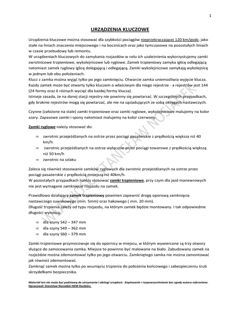 1 URZĄDZENIA KLUCZOWE Urządzenia kluczowe można stosować dla szybkości pociągów nieprzekraczającej 120 km/godz, jako stałe na liniach znaczenia miejscowego i na bocznicach oraz jako tymczasowe na pozostałych liniach w czasie przebudowy lub remontu. W urządzeniach kluczowych do zamykania rozjazdów w celu ich uzależnienia wykorzystujemy zamki zwrotnicowe trzpieniowe, wykolejnicowe lub ryglowe. Zamek trzpieniowy zamyka iglicę odlegającą natomiast zamek ryglowy iglicę dolegającą i odlegającą. Zamki wykolejnicowe zamykają wykolejnicę w jednym lub obu położeniach. Klucz z zamka można wyjąć tylko po jego zamknięciu. Otwarcie zamka uniemożliwia wyjęcie klucza. Każdy zamek może być otwarty tylko kluczem o właściwym dla niego rejestrze - a rejestrów jest 144 (24 formy oraz 6 różnych wycięć dla każdej formy klucza). Istnieje zasada, że na danej stacji rejestry nie powinny się powtarzać. W szczególnych przypadkach, gdy braknie rejestrów mogą się powtarzać, ale nie na sąsiadujących ze sobą okręgach nastawczych. Czynne (założone na stale) zamki trzpieniowe oraz zamki ryglowe, wykolejnicowe malujemy na kolor szary. Zapasowe zamki i spony natomiast malujemy na kolor czerwony. Zamki ryglowe należy stosować do: • • • zwrotnic przejeżdżanych na ostrze przez pociągi pasażerskie z prędkością większa niż 40 km/h. zwrotnic przejeżdżanych na ostrze wyłącznie przez pociągi towarowe z prędkością większą niż 50 km/h zwrotnic na szlaku Zaleca się również stosowanie zamków ryglowych dla zwrotnic przejeżdżanych na ostrze przez pociągi pasażerskie z prędkością mniejszą niż 40km/h. W pozostałych przypadkach należy stosować zamki trzpieniowe, przy czym dla jazd manewrowych nie jest wymagane zamknięcie rozjazdu na zamek. Prawidłowo działający zamek trzpieniowy powinien zapewnić drogę oporową zamknięcia nastawczego suwakowego (min. 5mm) oraz hakowego ( min. 20 mm). Długość trzpienia zależy od typu rozjazdu, na którym zamek będzie montowany. I tak odpowiednie długości wynoszą: • • • dla szyny S42 – 347 mm dla szyny S49 – 362 mm dla szyny S60 – 379 mm Zamki trzpieniowe przymocowuje się do opornicy w miejscu, w którym wywiercone są trzy otwory służące do zamocowania zamka. Miejsce to powinno być malowane na biało. Zabudowany zamek na rozjeździe można zdemontować tylko po jego otwarciu. Zamkniętego zamka nie można zamontować jak również zdemontować. Zamknąć zamek można tylko po wsunięciu trzpienia do położenia końcowego i zabezpieczeniu śrub skrzydełkami bezpiecznika. Materiał ten nie może być podstawą do utrzymania i obsługi urządzeń. Kopiowanie i rozpowszechnianie bez zgody autora zabronione. Opracował: Stanisław Nosiadek ISEM Racibórz. 2 Zamek ryglowy może być pojedynczy zamykający rozjazd w jednym położeniu lub podwójny zamykający rozjazd w obu położeniach. Przyleganie iglicy do opornicy na wysokości zamknięcia nastawczego kontrolowane jest z dokładnością do 2,5 mm. Zamki ryglowe zamykają każdą iglicę oddzielnie za pomocą suwaków ryglowych i prętów łączących suwaki ryglowe z iglicami. Suwak ryglowy z krótkim prętem montowany powinien być zawsze od strony początku iglicy. Wycięcie w suwakach powinny umożliwiać odsunięcie się iglicy od opornicy max 2,5 mm mierzone na wysokości zamknięcia nastawczego. Iglica odlegająca natomiast może się dosunąć o 20m mm do opornicy a odsunąć o 30 mm. Wycięcie w suwaku dla iglicy dolegającej wynosi 17 mm a dla iglicy odlegającej 62 mm. Do zamków ryglowych pojedynczych stosuje się suwaki o długości 437 mm a do podwójnych – 587 mm. Zwrotnica zamknięta zamkiem ryglowym ( i trzpieniowym również) jest nierozpruwana tzn. nie jest możliwe rozprucie rozjazdu bez uszkodzenia zamka. W zastosowaniu są również zamki wykolejnicowe, służące do zamykania wykolejnic w jednym lub obu położeniach. Wykolejnica może być uzależniona od położenia rozjazdu. W tym przypadku należy zastosować kolejność obsługi a mianowice: • • • przynieść z nastawni klucz oznaczony jako Wk.. + otworzyć nim zamek plusowy wykolejnicy, otworzyć wykolejnicę ( zdjąć z szyny) i zamknąć w położeniu minusowym kluczem Wk.. – wyjętym kluczem minusowym otworzyć zamek zwrotnicy i zwrotnicę przełożyć. Czyli: najpierw otwieramy wykolejnicę a następnie przekładamy rozjazd kierując na tor z wykolejnicą i odwrotnie. Uzależnienie to nie dopuszcza na najechanie taboru na zamkniętą wykolejnicę umieszczoną na szynie od strony zwrotnicy. Spona iglicowa służy do zabezpieczania iglicy dolegającej lub odlegającej. Założenie spony na iglicę dolegającą nie zapewnia drogi oporowej zamknięcia nastawczego. Klucze do spon mają tylko 22 formy z możliwością wykonania tylko dwóch wycięć. Nie można ich uzależniać w żadnym urządzeniu. Starsze typy spon iglicowych nie nadają się do zastosowania w rozjazdach S60 – są za krótkie. Spony stosuje się wszędzie tam, gdzie zachodzi potrzeba przytrzymania iglicy odlegającej do opornicy ( czasami stosujemy do uniemożliwienia przesunięcia się iglicy odlegającej do opornicy). Najczęściej wykorzystywana jest do przy wyłączeniu rygla lub przy robotach w zamknięciach nastawczych czy napędach zwrotnicowych. Sponę zakładamy przy końcu iglicy, w miejscu szyny, gdzie w szyjce szyny nawiercony jest otwór o średnicy 8 mm. Otwór ten powinien być obwiedziony od strony zewnętrznej białą farbą. W urządzeniach kluczowych uzależnienie zwrotnic w przebiegach odbywa się za pomocą skrzyń płaskich typu „Z” ( Zazulak) lub aparatów kluczowych typu P46 z drążkami przebiegowymi. Może być również wykorzystana normalna nastawnica, tak jak w urządzeniach mechanicznych, przy czym zamiast dźwigni zwrotnicowych na ławie znajdują się zamki zależnościowe zwrotnicowe lub wykolejnicowe. Spotyka sie również zamki zale