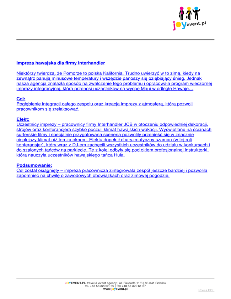 Impreza hawajska dla firmy Interhandler Niektórzy twierdzą, że Pomorze to polska Kalifornia. Trudno uwierzyć w to zimą, kiedy na zewnątrz panują minusowe temperatury i wszędzie panoszy się oziębiający śnieg. Jednak nasza agencja znalazła sposób na zwalczenie tego problemu i opracowała program wieczornej imprezy integracyjnej, która przenosi uczestników na wyspę Maui w odległe Hawaje… Cel: Pogłębienie integracji całego zespołu oraz kreacja imprezy z atmosferą, która pozwoli pracownikom się zrelaksować. Efekt: Uczestnicy imprezy – pracownicy firmy Interhandler JCB w otoczeniu odpowiedniej dekoracji, strojów oraz konferansjera szybko poczuli klimat hawajskich wakacji. Wyświetlane na ścianach surferskie filmy i specjalnie przygotowana sceneria pozwoliły przenieść się w znacznie cieplejszy klimat niż ten za oknem. Efektu dopełnił charyzmatyczny szaman (w tej roli konferansjer), który wraz z DJ-em zachęcili wszystkich uczestników do udziału w konkursach i do szalonych tańców na parkiecie. Te z kolei odbyły się pod okiem profesjonalnej instruktorki, która nauczyła uczestników hawajskiego tańca Hula. Podsumowanie: Cel został osiągnięty – impreza pracownicza zintegrowała zespół jeszcze bardziej i pozwoliła zapomnieć na chwilę o zawodowych obowiązkach oraz zimowej pogodzie. JOYEVENT.PL travel & event agency | ul. Fieldorfa 11/3 | 80-041 Gdańsk tel. +48 58 320 61 69 | fax +48 58 320 61 67 www.joyevent.pl Phoca PDF