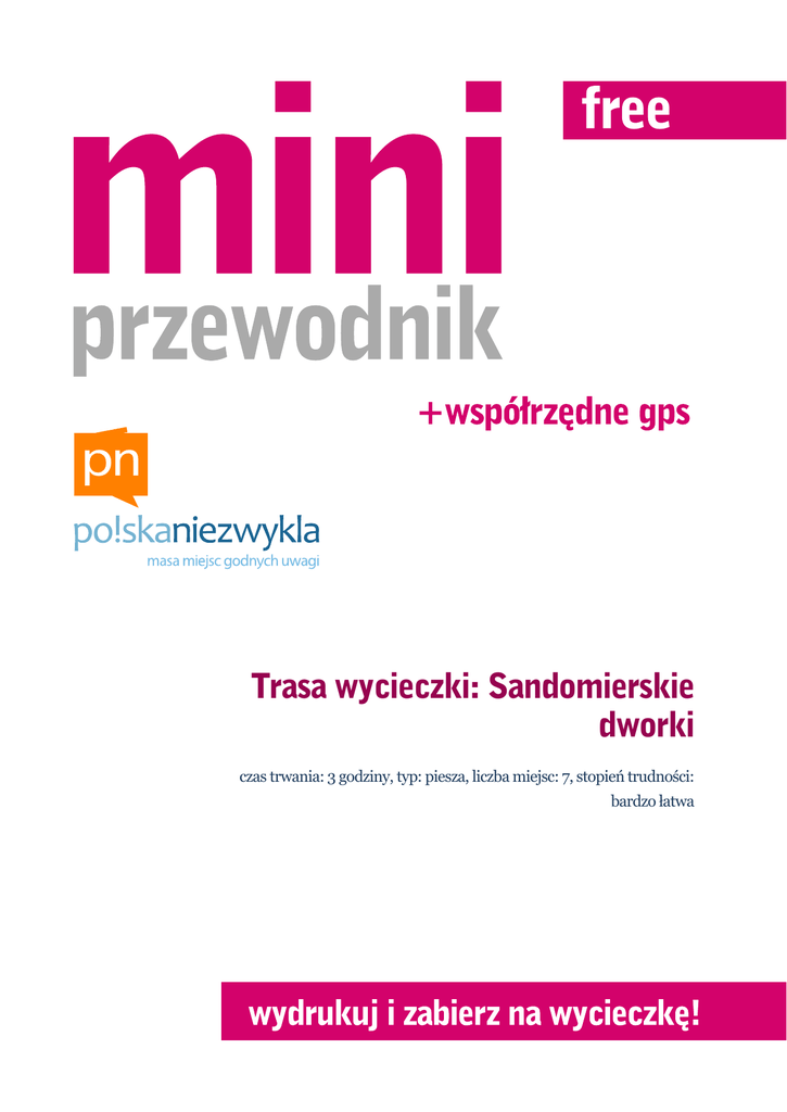 Trasa wycieczki: Sandomierskie dworki czas trwania: 3 godziny, typ: piesza, liczba miejsc: 7, stopień trudności: bardzo łatwa Opis wycieczki Sandomierskie dworki biegną nieco obok tradycyjnej trasy zwiedzanej przez turystów. Każdy z nich jest inny, więcej się kładzie nacisku na jego dzieje i związane z nim losy ludzi, którzy w nich zamieszkiwali, niźli na dokonania architektoniczne. Wszystkie te posiadłości znajdują się w obrębie miasta. Zwiedzanie ich można zacząć z dowolnego punktu. Ja proponuję zacząć od dworku Karpińskich z przełomu XVIII i XIX wieku, pięknie usytuowanego pod sandomierską skarpą. Mieści się w nim pensjonat "Stary Dwór", a obok jest pole biwakowe. Za ogrodzeniem tej posiadłości można się wspiąć na skarpę po schodkach, żeby dostać się na Stare Miasto, albo chodnikiem pod Bramę Opatowską - jak kto woli. Po przejściu Rynku idziemy w dół kierując się na zamek. Za budynkiem urzędu miejskiego, po lewej stronie ukazuje się nam dworek Ulrychów z 1864 roku, bardzo znaczny, pomalowany na zielono. W oficynie dworku znajdują się tanie pokoje noclegowe. Schodzimy jeszcze niżej i skręcamy w prawo i widzimy dworek Skorupskich - osławiony "Dworek ojca Mateusza". Teraz musimy się dostać do wąwozu Królowej Jadwigi, gdzie przy jego końcu znajduje się XVIII-wieczny dworek zwany "Sokołówką". Obiekt jest w posiadaniu sióstr zakonnych, a jego nazwa pochodzi od ich byłych właścicieli. Wracamy do ul. Staromiejskiej i spacerkiem przez Podwale Dolne do ul. Mickiewicza. Tu zaraz po lewej stronie, na na wprost parku jest następny z naszych obiektów dworek Sobolewskich z 1876 r. Solidna budowla z drzewa modrzewiowego zachowała się do dzisiaj w prawie niezmienionym stanie. Kilkadziesiąt metrów i jesteśmy pod kościołem św. Michała, gdzie usytuowany jest na jego dziedzińcu w obrębie Seminarium Duchownego dworek kapelana, przez niektórych nazywany domkiem kapelana, z lat 1769-1771. Jeszcze kilkadziesiąt metrów, przechodzimy przez ulicę i ukazuje się naszym oczom ostatni z obiektów, które chciałam Wam pokazać. To zespół dworski Strużyńskich, pięknie odrestaurowany, własność prywatna, w której się mieści stylowy Hotel "Sarmata". Zapraszam do Sandomierza i nie myślcie, że to już wszystkie atrakcje! Program wycieczki 2 3 Sandomierz Dworek Karpińskich W Sandomierzu znajduje się drewniany dworek konstrukcji zrębowej na wysokiej podmurówce z przełomu XVIII i XIX wieku. Jest pięknie położony u podnóża sandomierskiej skarpy. W 1840 roku został przebudowany przez kolejnego właściciela kapitana Michała Krajewskiego, w tym czasie założono również ogród i sad. W 1866 roku kupił go emerytowany rektor szkół wrocławskich Ignacy Karpiński, w którego rodzinie pozostawał przez kolejnych 100 lat, aż do momentu, gdy zaczęła się obsuwać skarpa sandomierska - lata 60. XX wieku. Od nazwiska ówczesnego właściciela po dziś dzień zwany jest "dworkiem Karpińskich". Wtedy to wykupiło dworek miasto, nigdy nie dokończono jego remontu... potem budowlę zniszczył pożar. Od 1995 roku znajduje się w rękach prywatnych. Pomysłowo zagospodarowany i odrestaurowany obiekt jest znowu ozdobą Sandomierza. Obecnie jest w nim pensjonat "Stary Dwór". 50°40'47"N 21°45'13"E | na mapie:A Sandomierz Dworek Skorupskich Dworek Skorupskich to jeden z nielicznych okazów architektury przedmiejskiej w Sandomierzu. Leży nieopodal wzgórza zamkowego przy ulicy Staromiejskiej, a prowadzi do niego kasztanowa aleja. Wybudował go w połowie XIX wieku Dionizy Skorupski, zaś pod koniec tego samego wieku rozbudowany został przez Juliana i Marię Skorupskich o dodatkowe skrzydło mieszkalne. Jest to drewniany, oszalowany budynek stojący na kamiennej podmurówce, przykryty dachem dwuspadowym. Wejście zdobi ganek podparty czterema kolumnami. Obecnie dworek jest w posiadaniu spadkobierców dawnych właścicieli i został zaadaptowany na cele turystyczne. 50°40'38"N 21°44'46"E | na mapie:C Sandomierz Dworek Ulrychów W 1864 roku p. Strużyński, urzędnik powiatowy, wystawił drewniany dworek i wydzierżawił go lokatorom. Następnym właścicielem do 1910 roku był Józef Olszewski, po nim prawa własności nabył Rosjanin Matwiej Ostromecki sędzia pokoju. W 1922 roku dworek kupili Jan i Stanisława Ulrychowie. Obecnie zamieszkuje go rodzina FijałkowskichLinart, krewni Ulrychów. W oficynie dworku znajdują się tanie pokoje noclegowe. Łatwo go znaleźć - przy wyjściu ze Starówki Sandomierskiej należy udać się ulicą w kierunku zamku; do tego jest bardzo widoczny, ponieważ ma kolor zielony. 50°40'41"N 21°44'53"E | na mapie:B Sandomierz Dworek "Sokołówka" Na Przedmieściu Krakowskim, przy końcu Wąwozu Królowej Jadwigi, stoi drewniany dwór zwany od nazwiska dawnych właścicieli "Sokołówką". Budynek o konstrukcji zrębowej pochodzi z XVIII wieku. Dwór wraz z otoczeniem został przez rodzinę Sokołowskich przekazany siostrom zakonnym. Obiekt, pomimo 200 lat istnienia, zachował się 4 w doskonałym stanie. 50°40'32"N 21°44'35"E | na mapie:D też dworkiem kapelana, był sandomierski architekt, ksiądz Józef Karśnicki. Został on zbudowany w latach 1769-1771, a usytuowany jest na dziedzińcu kościoła św. Michała w obrębie Seminarium Duchownego, pomiędzy kościołem a dzwonnicą. Od XIX wieku mieściła się tu drukarnia diecezjalna, a do 28 marca 2011 roku znajdował się tu Sandomierski Sąd Biskupi. 50°40'59"N 21°44'56"E | na mapie:F Sandomierz Dworek Sobolewskich W Sandomierzu przy ul. Mickiewicza 12, nieopodal Bramy Opatowskiej, znajduje się dworek Sobolewskich. Jego nazwa pochodzi od nazwiska ostatnich, a zarazem obecnych właścicieli dworku - p. Sobolewskich. Został zbudowany w 1876 roku przez Feliksa Brześciańskiego. Solidna budowla z drzewa modrzewiowego zachowała się do dzisiaj w prawie niezmienionym stanie. Do 1926 roku dworek miał kilku właścicieli, lecz od ta