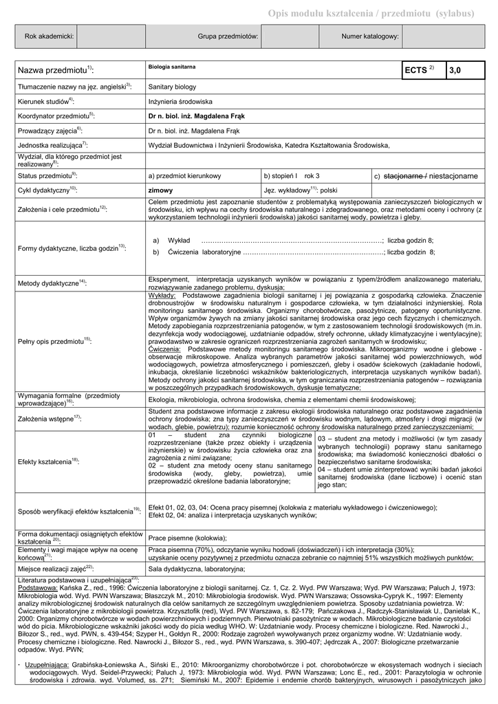 Opis modułu kształcenia / przedmiotu (sylabus) Rok akademicki: Grupa przedmiotów: Nazwa przedmiotu1): Biologia sanitarna Tłumaczenie nazwy na jęz. angielski3): Sanitary biology Kierunek studiów4): Inżynieria środowiska 5) Numer katalogowy: ECTS 2) 3,0 Dr n. biol. inż. Magdalena Frąk Koordynator przedmiotu : 6) Prowadzący zajęcia : Dr n. biol. inż. Magdalena Frąk Jednostka realizująca7): Wydział Budownictwa i Inżynierii Środowiska, Katedra Kształtowania Środowiska, Wydział, dla którego przedmiot jest realizowany8): Status przedmiotu9): a) przedmiot kierunkowy 10) b) stopień I rok 3 c) stacjonarne / niestacjonarne 11) Cykl dydaktyczny : zimowy Założenia i cele przedmiotu12): Celem przedmiotu jest zapoznanie studentów z problematyką występowania zanieczyszczeń biologicznych w środowisku, ich wpływu na cechy środowiska naturalnego i zdegradowanego, oraz metodami oceny i ochrony (z wykorzystaniem technologii inżynierii środowiska) jakości sanitarnej wody, powietrza i gleby. Formy dydaktyczne, liczba godzin13): Jęz. wykładowy : polski a) Wykład ………………………………………………………………………; liczba godzin 8; b) Ćwiczenia laboratoryjne ………………………………………………………; liczba godzin 8; Eksperyment, interpretacja uzyskanych wyników w powiązaniu z typem/źródłem analizowanego materiału, rozwiązywanie zadanego problemu, dyskusja; Wykłady: Podstawowe zagadnienia biologii sanitarnej i jej powiązania z gospodarką człowieka. Znaczenie drobnoustrojów w środowisku naturalnym i gospodarce człowieka, w tym działalności inżynierskiej. Rola monitoringu sanitarnego środowiska. Organizmy chorobotwórcze, pasożytnicze, patogeny oportunistyczne. Wpływ organizmów żywych na zmiany jakości sanitarnej środowiska oraz jego cech fizycznych i chemicznych. Metody zapobiegania rozprzestrzeniania patogenów, w tym z zastosowaniem technologii środowiskowych (m.in. dezynfekcja wody wodociągowej, uzdatnianie odpadów, strefy ochronne, układy klimatyzacyjne i wentylacyjne); prawodawstwo w zakresie ograniczeń rozprzestrzeniania zagrożeń sanitarnych w środowisku; Ćwiczenia: Podstawowe metody monitoringu sanitarnego środowiska. Mikroorganizmy wodne i glebowe obserwacje mikroskopowe. Analiza wybranych parametrów jakości sanitarnej wód powierzchniowych, wód wodociągowych, powietrza atmosferycznego i pomieszczeń, gleby i osadów ściekowych (zakładanie hodowli, inkubacja, określanie liczebności wskaźników bakteriologicznych, interpretacja uzyskanych wyników badań). Metody ochrony jakości sanitarnej środowiska, w tym ograniczania rozprzestrzeniania patogenów – rozwiązania w poszczególnych przypadkach środowiskowych, dyskusje tematyczne; Metody dydaktyczne14): Pełny opis przedmiotu15): Wymagania formalne (przedmioty wprowadzające)16): Ekologia, mikrobiologia, ochrona środowiska, chemia z elementami chemii środowiskowej; Student zna podstawowe informacje z zakresu ekologii środowiska naturalnego oraz podstawowe zagadnienia ochrony środowiska; zna typy zanieczyszczeń w środowisku wodnym, lądowym, atmosfery i drogi migracji (w wodach, glebie, powietrzu); rozumie konieczność ochrony środowiska naturalnego przed zanieczyszczeniami; 01 – student zna czynniki biologiczne 03 – student zna metody i możliwości (w tym zasady rozprzestrzeniane (także przez obiekty i urządzenia wybranych technologii) poprawy stanu sanitarnego inżynierskie) w środowisku życia człowieka oraz zna środowiska; ma świadomość konieczności dbałości o zagrożenia z nimi związane; bezpieczeństwo sanitarne środowiska; 02 – student zna metody oceny stanu sanitarnego 04 – student umie zinterpretować wyniki badań jakości środowiska (wody, gleby, powietrza), umie sanitarnej środowiska (dane liczbowe) i ocenić stan przeprowadzić określone badania laboratoryjne; jego stan; Założenia wstępne17): Efekty kształcenia18): Sposób weryfikacji efektów kształcenia19): Efekt 01, 02, 03, 04: Ocena pracy pisemnej (kolokwia z materiału wykładowego i ćwiczeniowego); Efekt 02, 04: analiza i interpretacja uzyskanych wyników; Forma dokumentacji osiągniętych efektów Prace pisemne (kolokwia); kształcenia 20): Elementy i wagi mające wpływ na ocenę Praca pisemna (70%), odczytanie wyniku hodowli (doświadczeń) i ich interpretacja (30%); końcową21): uzyskanie oceny pozytywnej z przedmiotu oznacza zebranie co najmniej 51% wszystkich możliwych punktów; Miejsce realizacji zajęć22): Sala dydaktyczna, laboratoryjna; 23) Literatura podstawowa i uzupełniająca : Podstawowa: Kańska Z., red., 1996: Ćwiczenia laboratoryjne z biologii sanitarnej. Cz. 1, Cz. 2. Wyd. PW Warszawa; Wyd. PW Warszawa; Paluch J, 1973: Mikrobiologia wód. Wyd. PWN Warszawa; Błaszczyk M., 2010: Mikrobiologia środowisk. Wyd. PWN Warszawa; Ossowska-Cypryk K., 1997: Elementy analizy mikrobiologicznej środowisk naturalnych dla celów sanitarnych ze szczególnym uwzględnieniem powietrza. Sposoby uzdatniania powietrza. W: Ćwiczenia laboratoryjne z mikrobiologii powietrza. Krzysztofik (red), Wyd. PW Warszawa, s. 82-179; Pańczakowa J., Radczyk-Stanisławiak U., Danielak K., 2000: Organizmy chorobotwórcze w wodach powierzchniowych i podziemnych. Pierwotniaki pasożytnicze w wodach. Mikrobiologiczne badanie czystości wód do picia. Mikrobiologiczne wskaźniki jakości wody do picia według WHO. W: Uzdatnianie wody. Procesy chemiczne i biologiczne. Red. Nawrocki J., Biłozor S., red., wyd. PWN, s. 439-454; Szyper H., Gołdyn R., 2000: Rodzaje zagrożeń wywoływanych przez organizmy wodne. W: Uzdatnianie wody. Procesy chemiczne i biologiczne. Red. Nawrocki J., Biłozor S., red., wyd. PWN Warszawa, s. 390-407; Jędrczak A., 2007: Biologiczne przetwarzanie odpadów. Wyd. PWN; Uzupełniająca: Grabińska-Łoniewska A., Siński E., 2010: Mikroorganizmy chorobotwórcze i pot. chorobotwórcze w ekosystemach wodnych i s