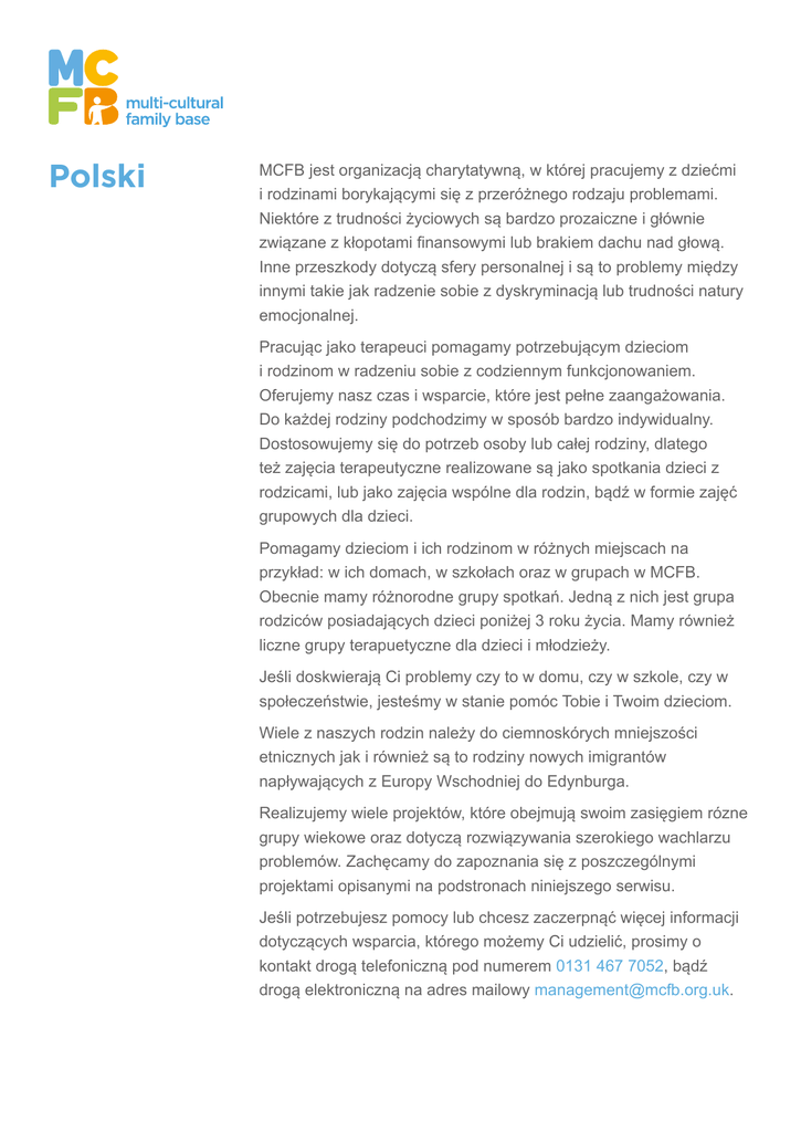 Polski MCFB jest organizacją charytatywną, w której pracujemy z dziećmi i rodzinami borykającymi się z przeróżnego rodzaju problemami. Niektóre z trudności życiowych są bardzo prozaiczne i głównie związane z kłopotami finansowymi lub brakiem dachu nad głową. Inne przeszkody dotyczą sfery personalnej i są to problemy między innymi takie jak radzenie sobie z dyskryminacją lub trudności natury emocjonalnej. Pracując jako terapeuci pomagamy potrzebującym dzieciom i rodzinom w radzeniu sobie z codziennym funkcjonowaniem. Oferujemy nasz czas i wsparcie, które jest pełne zaangażowania. Do każdej rodziny podchodzimy w sposób bardzo indywidualny. Dostosowujemy się do potrzeb osoby lub całej rodziny, dlatego też zajęcia terapeutyczne realizowane są jako spotkania dzieci z rodzicami, lub jako zajęcia wspólne dla rodzin, bądź w formie zajęć grupowych dla dzieci. Pomagamy dzieciom i ich rodzinom w różnych miejscach na przykład: w ich domach, w szkołach oraz w grupach w MCFB. Obecnie mamy różnorodne grupy spotkań. Jedną z nich jest grupa rodziców posiadających dzieci poniżej 3 roku życia. Mamy również liczne grupy terapuetyczne dla dzieci i młodzieży. Jeśli doskwierają Ci problemy czy to w domu, czy w szkole, czy w społeczeństwie, jesteśmy w stanie pomóc Tobie i Twoim dzieciom. Wiele z naszych rodzin należy do ciemnoskórych mniejszości etnicznych jak i również są to rodziny nowych imigrantów napływających z Europy Wschodniej do Edynburga. Realizujemy wiele projektów, które obejmują swoim zasięgiem rózne grupy wiekowe oraz dotyczą rozwiązywania szerokiego wachlarzu problemów. Zachęcamy do zapoznania się z poszczególnymi projektami opisanymi na podstronach niniejszego serwisu. Jeśli potrzebujesz pomocy lub chcesz zaczerpnąć więcej informacji dotyczących wsparcia, którego możemy Ci udzielić, prosimy o kontakt drogą telefoniczną pod numerem 0131 467 7052, bądź drogą elektroniczną na adres mailowy [email protected].