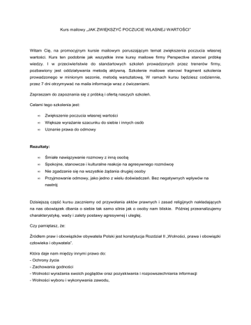 Kurs mailowy „JAK ZWIĘKSZYĆ POCZUCIE WŁASNEJ WARTOŚCI” Witam Cię, na promocyjnym kursie mailowym poruszającym temat zwiększenia poczucia własnej wartości. Kurs ten podobnie jak wszystkie inne kursy mailowe firmy Perspective stanowi próbkę wiedzy. I w przeciwieństwie do standartowych szkoleń prowadzonych przez trenerów firmy, pozbawiony jest oddziaływania metodą aktywną. Szkolenie mailowe stanowi fragment szkolenia prowadzonego w minionym sezonie, metodą warsztatową. W ramach kursu będziesz codziennie, przez 7 dni otrzymywać na maila informacje wraz z ćwiczeniami. Zapraszam do zapoznania się z próbką i ofertą naszych szkoleń. Celami tego szkolenia jest: • Zwiększenie poczucia własnej wartości • Większe wyrażanie szacunku do siebie i innych osób • Uznanie prawa do odmowy Rezultaty: • Śmiałe nawiązywanie rozmowy z inną osobą • Spokojne, stanowcze i kulturalne reakcje na agresywnego rozmówcę • Nie zgadzanie się na wszystkie żądania drugiej osoby • Przyjmowanie odmowy, jako jedno z wielu doświadczeń. Bez negatywnych wpływów na nastrój Dzisiejszą część kursu zaczniemy od przywołania aktów prawnych i zasad religijnych nakładających na nas obowiązek dbania o siebie tak samo silnie jak o osoby nam bliskie. Później przeanalizujemy charakterystykę, wady i zalety postawy agresywnej i uległej. Czy pamiętasz, że: Źródłem praw i obowiązków obywatela Polski jest konstytucja Rozdział II „Wolności, prawa i obowiązki człowieka i obywatela”. Która daje nam między innymi prawo do: - Ochrony życia - Zachowania godności - Wolności wyrażania swoich poglądów oraz pozyskiwania i rozpowszechniania informacji - Wolności wyboru i wykonywania zawodu, Podobne prawa i obowiązki nakłada nam Dekalog. Przykazanie miłości "Będziesz miłować bliźniego swego jak siebie samego." A co na to psychologia? Zgłębiając wiedzę psychologiczną znajdziemy: 1. Prawo do wyrażania swoich emocji 2. Prawo do wyrażania swojego zdania 3. Prawo do wyznaczania granic i strzeżenia ich 4. Prawo do szacunku samego siebie 5. Prawo do komfortu psychicznego 6. Obowiązek szanowania innych 7. Obowiązek nie naruszania granic innych osób 8. Obowiązek zauważania praw i potrzeb innych osób. Należy troszczyć się o swoje prawa i prawa innych osób. Taką postawę odzwierciedla asertywność. Oparta na zasadach takich jak: 1. Równość w relacjach międzyludzkich 2. Obrona własnego stanowiska bez nadmiernego lęku 3. Swobodne i szczere wyrażanie uczuć i korzystanie z własnych praw bez naruszania praw innych ludzi. Z badań wynika, że u ludzi korzyściami odniesionymi z wyrażania siebie jest: 1. Zwiększenie samooceny, 2. Zmniejszenie lęku 3. Pokonanie stanów depresyjnych 4. Zyskanie większego respektu u innych 5. Osiągnięcie większej ilości życiowych celów 6. Zwiększenie poziomu rozumienia siebie 7. Poprawa zdolności porozumiewania się z innymi Zamiast tego większość z nas funduje sobie zachowanie agresywne lub uległe. Na koniec dzisiejszej części kursu wypisz wady i zalety postawy agresywnej i uległej. POSTAWA ULEGŁA POSTAWA AGRESYWNA WADY ZALETY Do zobaczenia jutro. Pozdrawiam serdecznie Blanka Zientek www.perspective.biz.pl ZALETY WADY Witaj, Na początku proszę abyś przeczytał/a wypisane przez siebie wady i zalety postawy agresywnej i uległej. Następnie pomyśl, czym charakteryzowało by się zachowanie posiadające zalety z postawy agresywnej i uległej. Asertywność zawiera zalety postawy agresywnej i uległej. Asertywny styl kontaktu cechuje stanowczość bez przemocy, łagodność wobec innych, a zarazem siła i zdecydowania. Służy do psychologicznej obrony. Jest też sposobem wywierania wpływu. Nie zawiera agresji, ani manipulacji. Jest to patrzenie na siebie i innych jak na wartość, która wymaga szacunku i należytej ochrony, ochrony godności i praw osobistych. To dążenie do tego żeby stosunki z ludźmi oparte były na zaufaniu i prawdomówności. Rozmówca jest godnym partnerem, a nie wrogiem. Osoba asertywna jest pewna siebie, nikogo nie udaje, jest sobą, jest zadowolona ze swoich kontaktów z ludźmi. Czuje się autorem i jest odpowiedzialna za swoje decyzje. Biorąc pod uwagę to, co jest napisane wyżej i dlatego że Postawa (sposób myślenia) ma wpływ na zachowanie (autoprezentacje) co z kolei wpływa na postawę, popracujemy nad sposobem myślenia o sobie i innych. Na początku wypisz imiona 3 osób z twojego otoczenia. 1. 2. 3. Następnie napisz po jednym z komunikatów do powyższych osób. Schemat komunikatu wyglądałby tak: 1. Imię, cenię w Tobie… 2. Imię, podziwiam w Tobie… 3. Imię, moim zdaniem twoja zaletą jest… A teraz zajmijmy się twoją samooceną. Teraz uzupełnij tabelkę wypisując jak najwięcej konkretnych informacji. umiejętności osiągnięcia zalety 1 1 1 10 10 10 Wypełnioną tabelkę zachowaj. Czytaj te punkty za każdym razem, gdy idziesz na ważną rozmowę lub gdy masz obniżony nastrój. Uwierz, że skoro osiągnęłaś/łeś to, co wypisałeś/łaś możesz zdziałać więcej. Osiągnąć swój cel, spełnić marzenia. W ten sposób masz szansę uruchomić siłę przyciągania. Na tym koniec na dzisiaj. Do jutra ☺ Blanka Zientek www.perspective.biz.pl Witaj, W ramach przypomnienia, na początku naszego dzisiejszego spotkania proponuje Ci eksperyment. Stań przed lustrem i sprawdź jaki rodzaj • Kontaktu wzrokowego, • Postawy ciała • Sposobu gestykulacji • Wyrazu twarzy • Tonu, modulacji i natężenie głosu pasowałby do wczoraj opisanej postawy asertywnej. A teraz proponuje Ci podróż do świata wspomnień. Przypomnij sobie jak brzmią komunikaty, wewnętrzne głosy zniechęcające Cię do podjęcia działania. Może być to np.: komunikat brzmiący „Daj spokój i tak Ci się nie uda” Przykłady komunikatów: 1. . 2. . 3. . 4. . 5. . 6. . 7. . Następnie przypomnij sobie jaki komunikat mówi Co twój wewnętrzny gł