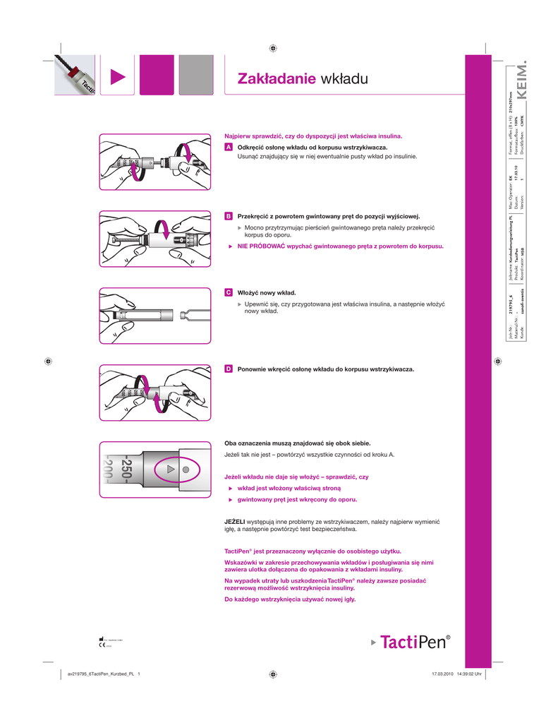 Zakładanie wkładu Najpierw sprawdzić, czy do dyspozycji jest właściwa insulina. A Odkręcić osłonę wkładu od korpusu wstrzykiwacza. Usunąć znajdujący się w niej ewentualnie pusty wkład po insulinie. B Przekręcić z powrotem gwintowany pręt do pozycji wyjściowej. X X C NIE PRÓBOWAĆ wpychać gwintowanego pręta z powrotem do korpusu. Włożyć nowy wkład. X D Mocno przytrzymując pierścień gwintowanego pręta należy przekręcić korpus do oporu. Upewnić się, czy przygotowana jest właściwa insulina, a następnie włożyć nowy wkład. Ponownie wkręcić osłonę wkładu do korpusu wstrzykiwacza. Oba oznaczenia muszą znajdować się obok siebie. Jeżeli tak nie jest – powtórzyć wszystkie czynności od kroku A. Jeżeli wkładu nie daje się włożyć – sprawdzić, czy X wkład jest włożony właściwą stroną X gwintowany pręt jest wkręcony do oporu. JEŻELI występują inne problemy ze wstrzykiwaczem, należy najpierw wymienić igłę, a następnie powtórzyć test bezpieczeństwa. TactiPen® jest przeznaczony wyłącznie do osobistego użytku. Wskazówki w zakresie przechowywania wkładów i posługiwania się nimi zawiera ulotka dołączona do opakowania z wkładami insuliny. Na wypadek utraty lub uszkodzenia TactiPen® należy zawsze posiadać rezerwową możliwość wstrzyknięcia insuliny. Do każdego wstrzyknięcia używać nowej igły. av219795_6TactiPen_Kurzbed_PL 1 17.03.2010 14:39:02 Uhr Wstrzykiwanie insuliny WAŻNE: zawiesiny insuliny należy zawsze wymieszać! 1X Nakładanie igły Najpierw sprawdzić, czy do dyspozycji jest właściwa insulina. A 2X Nałożyć prosto igłę. Wykonanie testu bezpieczeństwa Przed każdym wstrzyknięciem należy wykonać test bezpieczeństwa, ażeby usunąć pęcherzyki powietrza oraz sprawdzić prawidłowe funkcjonowanie wstrzykiwacza i igły. 3X A Nastawić dawkę 2 jednostek i zdjąć nasadkę ochronną igły. B Trzymać wstrzykiwacz igłą do góry i wcisnąć do oporu przycisk wstrzykujący. C Sprawdzić, czy z czubka igły wypływa insulina. X Jeżeli insulina nie wypływa, należy powtarzać test tak długo, aż insulina wypłynie. X Jeżeli po trzykrotnym wykonaniu testu insulina nadal nie będzie wypływać, należy zmienić igłę i wykonać ponowną próbę. X Jeżeli insulina nadal nie wypływa, należy sprawdzić, czy wkład został prawidłowo założony i ponownie wykonać próbę. X Jeżeli insulina wciąż jeszcze nie wypływa, należy zmienić wkład i rozpocząć test od początku. Nastawianie dawki A Nastawić żądaną dawkę. W pokazanym przykładzie wybrano dawkę 30 jednostek. Dawka pacjenta może odbiegać od tej wartości. JEŻELI NIE jest możliwe nastawienie żądanej dawki, należy sprawdzić, czy wkład zawiera wystarczającą ilość insuliny. 4X Wstrzykiwanie dawki insuliny Należy stosować technikę wstrzyknięcia, z którą zapoznał pacjenta fachowy personel medyczny. 10 Sek. Wbić igłę. B Do oporu wcisnąć przycisk wstrzykujący. Liczba widoczna w otworze wskazującym dawkę zmienia się przy tym na „0”. C Trzymać przycisk wstrzykujący wciśnięty do oporu. Należy powoli odliczyć do 10, a po skończeniu odliczania wyciągnąć igłę. A Ponownie nałożyć zewnętrzną nasadkę ochronną na igłę, a następnie trzymając nasadkę wykręcić igłę ze wstrzykiwacza. B Igłę należy wyrzucić w bezpieczny sposób (np. do odpornego na przebicia pojemnika). C Ponownie nałożyć nasadkę na wstrzykiwacz. Wyjmowanie i utylizacja igły av219795_6TactiPen_Kurzbed_PL 2 016760 5X A 17.03.2010 14:39:05 Uhr