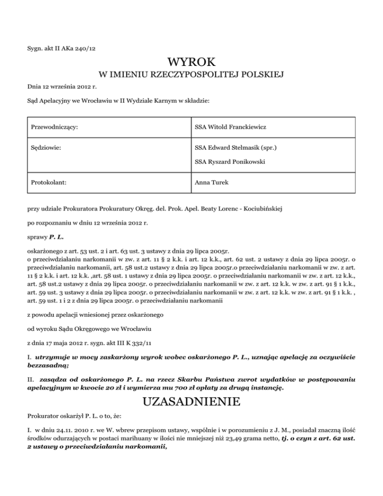 Sygn. akt II AKa 240/12 WYROK W IMIENIU RZECZYPOSPOLITEJ POLSKIEJ Dnia 12 września 2012 r. Sąd Apelacyjny we Wrocławiu w II Wydziale Karnym w składzie: Przewodniczący: SSA Witold Franckiewicz Sędziowie: SSA Edward Stelmasik (spr.) SSA Ryszard Ponikowski Protokolant: Anna Turek przy udziale Prokuratora Prokuratury Okręg. del. Prok. Apel. Beaty Lorenc - Kociubińskiej po rozpoznaniu w dniu 12 września 2012 r. sprawy P. L. oskarżonego z art. 53 ust. 2 i art. 63 ust. 3 ustawy z dnia 29 lipca 2005r. o przeciwdziałaniu narkomanii w zw. z art. 11 § 2 k.k. i art. 12 k.k., art. 62 ust. 2 ustawy z dnia 29 lipca 2005r. o przeciwdziałaniu narkomanii, art. 58 ust.2 ustawy z dnia 29 lipca 2005r.o przeciwdziałaniu narkomanii w zw. z art. 11 § 2 k.k. i art. 12 k.k. ,art. 58 ust. 1 ustawy z dnia 29 lipca 2005r. o przeciwdziałaniu narkomanii w zw. z art. 12 k.k., art. 58 ust.2 ustawy z dnia 29 lipca 2005r. o przeciwdziałaniu narkomanii w zw. z art. 12 k.k. w zw. z art. 91 § 1 k.k., art. 59 ust. 3 ustawy z dnia 29 lipca 2005r. o przeciwdziałaniu narkomanii w zw. z art. 12 k.k. w zw. z art. 91 § 1 k.k. , art. 59 ust. 1 i 2 z dnia 29 lipca 2005r. o przeciwdziałaniu narkomanii z powodu apelacji wniesionej przez oskarżonego od wyroku Sądu Okręgowego we Wrocławiu z dnia 17 maja 2012 r. sygn. akt III K 332/11 I. utrzymuje w mocy zaskarżony wyrok wobec oskarżonego P. L., uznając apelację za oczywiście bezzasadną; II. zasądza od oskarżonego P. L. na rzecz Skarbu Państwa zwrot wydatków w postępowaniu apelacyjnym w kwocie 20 zł i wymierza mu 700 zł opłaty za drugą instancję. UZASADNIENIE Prokurator oskarżył P. L. o to, że: I. w dniu 24.11. 2010 r. we W. wbrew przepisom ustawy, wspólnie i w porozumieniu z J. M., posiadał znaczną ilość środków odurzających w postaci marihuany w ilości nie mniejszej niż 23,49 grama netto, tj. o czyn z art. 62 ust. 2 ustawy o przeciwdziałaniu narkomanii, II. w nieustalonym okresie od 2006 r. do listopada 2010 r. w krótkich odstępach czasu we W. oraz innych nieustalonych miejscach, wbrew przepisom ustawy, udzielał J. M. środków odurzających w postaci marihuany, w znacznej ilości, nie mniejszej niż 700 gram, tj. o czyn z art. 58 ust. 2 ustawy o przeciwdziałaniu narkomanii III. w okresie od września 2010 r. do 24 listopada 2010 r. w krótkich odstępach czasu we W. i okolicach W., wbrew przepisom ustawy, udzielał M. L. środków odurzających w postaci marihuany, w nieustalonej ilości nie mniejszej niż 0, 1 grama netto, tj. o czyn z art. 58 ust. 1 ustawy o przeciwdziałaniu narkomanii IV. w okresie od września 2010 r. do 24 listopada 2010 r. w krótkich odstępach czasu, we W. i okolicach W., wbrew przepisom ustawy, w celu osiągnięcia korzyści majątkowej udzielał M. L. środków odurzających w postaci marihuany w nieustalonej ilości nie mniejszej niż 3 grama netto za kwotę 40 zł. tj. o czyn z art. 59 ust. 1 ustawy o przeciwdziałaniu narkomanii V. w okresie od września 2010 r. do 24 listopada 2010 r. we W. w krótkich odstępach czasu, wbrew przepisom ustawy, udzielał małoletniemu E. K. (1) środków odurzających w postaci marihuany, w nieustalonej ilości nie mniejszej niż 0,3 grama netto tj. o czyn z art. 58 ust. 2 ustawy o przeciwdziałaniu narkomanii VI. w okresie od września 2010 r. do 24 listopada 2010 r. we W. w krótkich odstępach czasu, wbrew przepisom ustawy w celu osiągnięcia korzyści majątkowej, udzielał małoletniemu E. K. (1) środków odurzających w postaci marihuany w nieustalonej ilości nie mniejszej niż 6 grama netto za kwotę nie mniejszą niż 15 zł. za gram tj. o czyn z art. 59 ust. 2 ustawy o przeciwdziałaniu narkomanii VII. w okresie od września 2010 r. do 24 listopada 2010 r. we W. w krótkich odstępach czasu, wbrew przepisom ustawy, udzielał małoletniemu Ł. C. (1) środków odurzających w postaci marihuany, w nieustalonej ilości nie mniejszej niż 3 gramy, tj. o czyn z art. 58 ust. 2 ustawy o przeciwdziałaniu narkomanii VIII. w okresie od września 2010 r. do 24 listopada 2010 r. we W. w krótkich odstępach czasu, wbrew przepisom ustawy w celu osiągnięcia korzyści majątkowej, udzielał małoletniemu Ł. C. (1) środków odurzających w postaci marihuany w nieustalonej ilości nie mniejszej niż 3 gram netto za kwotę nie mniejszą niż 15 zł. za gram tj. o czyn z art. 59 ust. 2 ustawy o przeciwdziałaniu narkomanii IX. w sierpniu 2010 r. w R. wbrew przepisom ustawy, wspólnie i w porozumieniu z J. M. pomagał T. O. w uprawie konopi innych niż włókniste, która to uprawa mogła dostarczyć znacznej ilości ziela konopi innych niż włókniste poprzez podlewanie, nawożenie i pielęgnację roślin, tj. o czyn z art. 18 § 3 kk w zw. z art. 63 ust. 2 ustawy o przeciwdziałaniu narkomanii X. w nieustalonym okresie od września do października 2010 r. w okolicy W., wspólnie i w porozumieniu z J. M., uprawiał wbrew przepisom ustawy konopie inne niż włókniste, które to dostarczyły znacznej ilości ziela konopi innej niż włókniste, tj. o czyn z art. 63 ust. 3 ustawy o przeciwdziałaniu narkomanii XI. w nieustalonym okresie od 2005 r. do 24 listopada 2010 r. we W. i innych nieustalonych miejscach w krótkich odstępach czasu, wbrew przepisom ustawy, udzielił znacznej ilości środków odurzających postaci marihuany nie mniej niż 500 gram nieustalonym osobom tj. o czyn z art. 58 ust. 2 ustawy o przeciwdziałaniu narkomanii Sąd Okręgowy we Wrocławiu wyrokiem z dnia 17 maja 2012 r. I. uznał osk. P. L., w ramach zarzutów opisanych w p. I i X, za winnego tego, że od września do października 2010 r. w okolicy W., działając czynem ciągłym z góry powziętym zamiarem, wbrew przepisom ustawy, uprawiał dwa krzewy konopi inne niż wbrew przepisom ustawy, poprzez rozdrabnianie i suszenie wytworzył znaczną ilość środka odurzającego w postaci marihuany o wadze nie mniejszej niż 23,49 g tj. przestępstwa z art. 53 ust. 2 i art. 63 ust. 3 ustawy 