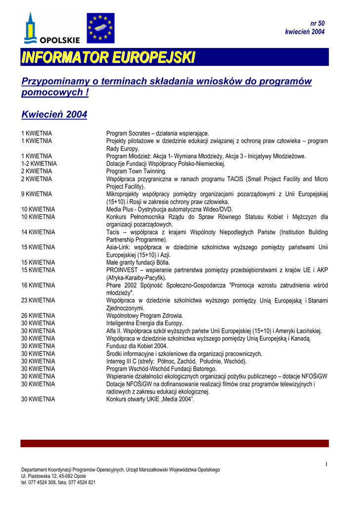 nr 50 kwiecień 2004 INFORMATOR EUROPEJSKI Przypominamy o terminach składania wniosków do programów pomocowych ! Kwiecień 2004 1 KWIETNIA 1 KWIETNIA 1 KWIETNIA 1-2 KWIETNIA 2 KWIETNIA 2 KWIETNIA 9 KWIETNIA 10 KWIETNIA 10 KWIETNIA 14 KWIETNIA 15 KWIETNIA 15 KWIETNIA 15 KWIETNIA 16 KWIETNIA 23 KWIETNIA 26 KWIETNIA 30 KWIETNIA 30 KWIETNIA 30 KWIETNIA 30 KWIETNIA 30 KWIETNIA 30 KWIETNIA 30 KWIETNIA 30 KWIETNIA 30 KWIETNIA 30 KWIETNIA Program Socrates – działania wspierające. Projekty pilotażowe w dziedzinie edukacji związanej z ochroną praw człowieka – program Rady Europy. Program Młodzież: Akcja 1- Wymiana Młodzieży, Akcja 3 - Inicjatywy Młodzieżowe. Dotacje Fundacji Współpracy Polsko-Niemieckiej. Program Town Twinning. Współpraca przygraniczna w ramach programu TACIS (Small Project Facility and Micro Project Facility). Mikroprojekty współpracy pomiędzy organizacjami pozarządowymi z Unii Europejskiej (15+10) i Rosji w zakresie ochrony praw człowieka. Media Plus - Dystrybucja automatyczna Wideo/DVD. Konkurs Pełnomocnika Rządu do Spraw Równego Statusu Kobiet i Mężczyzn dla organizacji pozarządowych. Tacis – współpraca z krajami Wspólnoty Niepodległych Państw (Institution Building Partnership Programme). Asia-Link: współpraca w dziedzinie szkolnictwa wyższego pomiędzy państwami Unii Europejskiej (15+10) i Azji. Małe granty fundacji Bölla. PROINVEST – wspieranie partnerstwa pomiędzy przedsiębiorstwami z krajów UE i AKP (Afryka-Karaiby-Pacyfik). Phare 2002 Spójność Społeczno-Gospodarcza "Promocja wzrostu zatrudnienia wśród młodzieży". Współpraca w dziedzinie szkolnictwa wyższego pomiędzy Unią Europejską i Stanami Zjednoczonymi. Wspólnotowy Program Zdrowia. Inteligentna Energia dla Europy. Alfa II. Współpraca szkół wyższych państw Unii Europejskiej (15+10) i Ameryki Łacińskiej. Współpraca w dziedzinie szkolnictwa wyższego pomiędzy Unią Europejską i Kanadą. Fundusz dla Kobiet 2004. Środki informacyjne i szkoleniowe dla organizacji pracowniczych. Interreg III C (strefy: Północ, Zachód, Południe, Wschód). Program Wschód-Wschód Fundacji Batorego. Wspieranie działalności ekologicznych organizacji pożytku publicznego – dotacje NFOŚiGW Dotacje NFOŚiGW na dofinansowanie realizacji filmów oraz programów telewizyjnych i radiowych z zakresu edukacji ekologicznej. Konkurs otwarty UKIE „Media 2004”. Departament Koordynacji Programów Operacyjnych, Urząd Marszałkowski Województwa Opolskiego Ul. Piastowska 12, 45-082 Opole tel. 077 4524 308, faks. 077 4524 821 1 WYDARZENIA CO BYŁO ? W dniu 12 marca w Urzędzie Marszałkowskim przebywali przedstawiciele Komisji Europejskiej, wraz z Timo Ronkainenem - doradcą przedakcesyjnym z Ministerstwa Gospodarki, Pracy i Polityki Społecznej RP. Unijni eksperci wizytowali Urząd – podobnie jak i urzędy w innych regionach Polski – badając, jak jesteśmy zaawansowani w przygotowaniach do zarządzania funduszami europejskimi, zwłaszcza zaś do zarządzania Europejskim Funduszem Społecznym. W rozmowach z gośćmi z Komisji Europejskiej uczestniczyli: Zarząd Województwa, Dyrekcja Wojewódzkiego Urzędu Pracy, Prezes Stowarzyszenia Promocja Przedsiębiorczości – Regionalnej Instytucji Finansującej, Prezes Oddziału Opolskiego PFRON oraz przedstawiciele Urzędu Marszałkowskiego. Prezentowano strukturę, zakres działań i zasoby instytucji, które będą uczestniczyć we wdrażaniu programów operacyjnych w naszym regionie. Podczas spotkania mówiono także o problemach, które mogą wpłynąć na opóźnienie w zakresie absorpcji funduszy. Wstępna ocena Komisji Europejskiej zostanie przygotowana pod koniec marca, po wizycie we wszystkich województwach. Przed nami jeszcze audyt, który w sposób bardziej szczegółowy oceni nasz potencjał w momencie wejścia do Unii Europejskiej. W dniu 23 marca o godz. 10.00 w Sali 12 przy ul. Piastowskiej 12 odbyło się robocze spotkanie z Urzędami Marszałkowskimi województw: Dolnośląskiego i Śląskiego w sprawach związanych z realizacją programu INTERREG III A Dnia 24 marca b.r. godz. 13.00, w Sali im. E.Osmańczyka Opolskiego Urzędu Wojewódzkiego odbyło się posiedzenie Opolskiego Komitetu Monitorującego Kontrakt Wojewódzki na lata 2001-2003. Podczas spotkania został przyjęty całościowy raport z realizacji Kontraktu. W dniu 25 marca b.r. o godz. 13.00 w Sali Herbowej Opolskiego Urzędu Wojewódzkiego odbyło się spotkanie informacyjno– organizacyjne dla kandydatów na członków Paneli Ekspertów. Podczas spotkania omówione zostały następujące zagadnienia: możliwości finansowania projektów z Zintegrowanego Programu Operacyjnego Rozwoju Regionalnego (ZPORR) i Kontraktu Wojewódzkiego na 2004r.; system wdrażania ZPORR; rola Paneli Ekspertów w procesie wyboru projektów; strategie sektorowe realizowane przez Samorząd Województwa. W dniu 26 marca b.r. o godz. 14.00 w sali im. E.Osmańczyka Opolskiego Urzędu Wojewódzkiego odbyło się posiedzenie Regionalnego Komitetu Sterującego Województwa Opolskiego. Celem spotkania było zaopiniowanie przez członków Komitetu projektu „Programu Rozwoju Województwa Opolskiego na lata 2004 – 2006”. Dokument ten będzie stanowić podstawę do opracowania przez Zarząd Województwa wniosku o wsparcie środkami z budżetu państwa działań rozwojowych prowadzonych w regionie. Zakończył się, realizowany wspólnie z Opolskim Urzędem Wojewódzkim, cykl szkoleń na temat funduszy strukturalnych przeznaczonych dla gmin i powiatów Województwa Opolskiego. W dniach 19 luty – 30 marca b.r. przeszkoleni zostali przedstawiciele wszystkich jednostek samorządu terytorialnego naszego Województwa. W ramach szkolenia uczestnicy zapoznali się z systemem wdrażania ZPORR w regionie, zasadami finansowania i monitorowania projektów oraz zasadami wypełniania fiszek projektowych. CO BĘDZIE ? Dnia 6 kwietnia b.r. o godzinie 9.00 w Sali Herbowej OUW odbędz