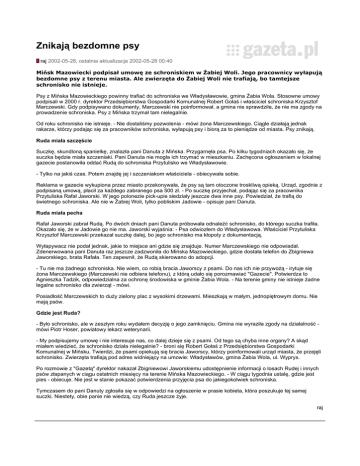 Znikają bezdomne psy raj 2002-05-28, ostatnia aktualizacja 2002-05-28 00:40 Mińsk Mazowiecki podpisał umowę ze schroniskiem w Żabiej Woli. Jego pracownicy wyłapują bezdomne psy z terenu miasta. Ale zwierzęta do Żabiej Woli nie trafiają, bo tamtejsze schronisko nie istnieje. Psy z Mińska Mazowieckiego powinny trafiać do schroniska we Władysławowie, gmina Żabia Wola. Stosowne umowy podpisali w 2000 r. dyrektor Przedsiębiorstwa Gospodarki Komunalnej Robert Gołaś i właściciel schroniska Krzysztof Marczewski. Gdy podpisywano dokumenty, Marczewski nie poinformował, a gmina nie sprawdziła, że nie ma zgody na prowadzenie schroniska. Psy z Mińska trzymał tam nielegalnie. Od roku schronisko nie istnieje. - Nie dostaliśmy pozwolenia - mówi żona Marczewskiego. Ciągle działają jednak rakarze, którzy podając się za pracowników schroniska, wyłapują psy i biorą za to pieniądze od miasta. Psy znikają. Ruda miała szczęście Suczkę, skundloną spanielkę, znalazła pani Danuta z Mińska. Przygarnęła psa. Po kilku tygodniach okazało się, że suczka będzie miała szczeniaki. Pani Danuta nie mogła ich trzymać w mieszkaniu. Zachęcona ogłoszeniem w lokalnej gazecie postanowiła oddać Rudą do schroniska Przytulisko we Władysławowie. - Tylko na jakiś czas. Potem znajdę jej i szczeniakom właściciela - obiecywała sobie. Reklama w gazecie wykupiona przez miasto przekonywała, że psy są tam otoczone troskliwą opieką. Urząd, zgodnie z podpisaną umową, płacił za każdego zabranego psa 500 zł. - Po suczkę przyjechał, podając się za pracownika Przytuliska Rafał Jaworski. W jego polonezie pick-upie siedziały jeszcze dwa inne psy. Powiedział, że trafią do świetnego schroniska. Ale nie w Żabiej Woli, tylko pobliskim Jadowie - opisuje pani Danuta. Ruda miała pecha Rafał Jaworski zabrał Rudą. Po dwóch dniach pani Danuta próbowała odnaleźć schronisko, do którego suczka trafiła. Okazało się, że w Jadowie go nie ma. Jaworski wyjaśnia: - Psa odwiozłem do Władysławowa. Właściciel Przytuliska Krzysztof Marczewski przekazał suczkę dalej, bo jego schronisko ma kłopoty z dokumentacją. Wyłapywacz nie podał jednak, jakie to miejsce ani gdzie się znajduje. Numer Marczewskiego nie odpowiadał. Zdenerwowana pani Danuta raz jeszcze zadzwoniła do Mińska Mazowieckiego, gdzie dostała telefon do Zbigniewa Jaworskiego, brata Rafała. Ten zapewnił, że Rudą skierowano do adopcji. - Tu nie ma żadnego schroniska. Nie wiem, co robią bracia Jaworscy z psami. Do nas ich nie przywożą - irytuje się żona Marczewskiego (Marczewski nie odbiera telefonu), z którą udało się porozmawiać "Gazecie". Potwierdza to Agnieszka Tadzik, odpowiedzialna za ochronę środowiska w gminie Żabia Wola. - Na terenie gminy nie istnieje żadne legalne schronisko dla zwierząt - mówi. Posiadłość Marczewskich to duży zielony plac z wysokimi drzewami. Mieszkają w małym, jednopiętrowym domu. Nie mają psów. Gdzie jest Ruda? - Było schronisko, ale w zeszłym roku wydałem decyzję o jego zamknięciu. Gmina nie wyraziła zgody na działalność mówi Piotr Hoser, powiatowy lekarz weterynarii. - My podpisujemy umowę i nie interesuje nas, co dalej dzieje się z psami. Od tego są chyba inne organy? A skąd miałem wiedzieć, że schronisko działa nielegalnie? - broni się Robert Gołaś z Przedsiębiorstwa Gospodarki Komunalnej w Mińsku. Twierdzi, że psami opiekują się bracia Jaworscy, którzy poinformowali urząd miasta, że przejęli schronisko. Zwierzęta trafiają pod adres widniejący na umowie: Władysławów, gmina Żabia Wola, ul. Wyprys. Po rozmowie z "Gazetą" dyrektor nakazał Zbigniewowi Jaworskiemu udostępnienie informacji o losach Rudej i innych psów złapanych w ciągu ostatnich miesięcy na terenie Mińska Mazowieckiego. - W ciągu tygodnia ustalę, gdzie jest pies - obiecuje. Nie jest w stanie pokazać potwierdzenia przyjęcia psa do jakiegokolwiek schroniska. Tymczasem do pani Danuty zgłosiła się w odpowiedzi na ogłoszenie w prasie kobieta, która poszukuje tej samej suczki. Niestety, obie panie nie wiedzą, czy Ruda jeszcze żyje. raj