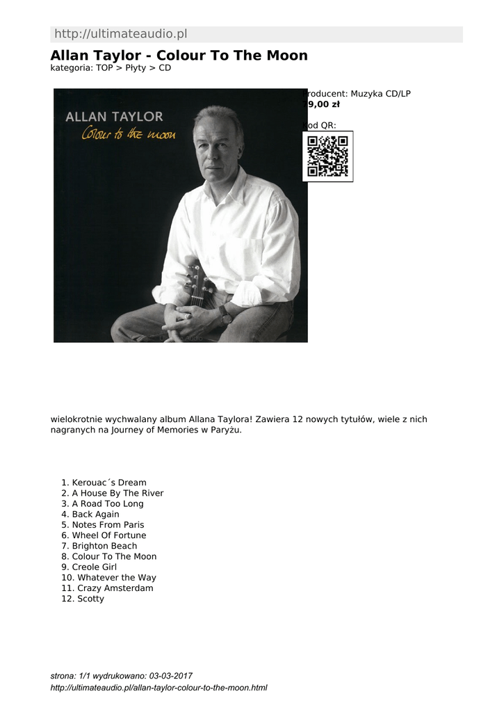 http://ultimateaudio.pl Allan Taylor - Colour To The Moon kategoria: TOP > Płyty > CD Producent: Muzyka CD/LP 79,00 zł Kod QR: wielokrotnie wychwalany album Allana Taylora! Zawiera 12 nowych tytułów, wiele z nich nagranych na Journey of Memories w Paryżu. 1. Kerouac´s Dream 2. A House By The River 3. A Road Too Long 4. Back Again 5. Notes From Paris 6. Wheel Of Fortune 7. Brighton Beach 8. Colour To The Moon 9. Creole Girl 10. Whatever the Way 11. Crazy Amsterdam 12. Scotty strona: 1/1 wydrukowano: 03-03-2017 http://ultimateaudio.pl/allan-taylor-colour-to-the-moon.html