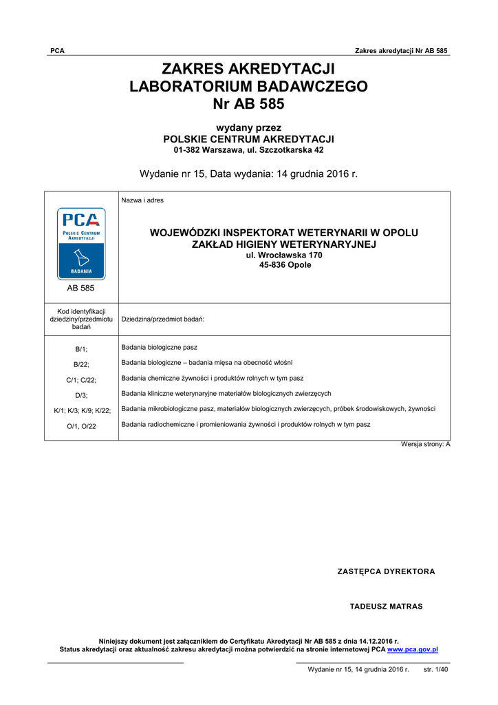 PCA Zakres akredytacji Nr AB 585 ZAKRES AKREDYTACJI LABORATORIUM BADAWCZEGO Nr AB 585 wydany przez POLSKIE CENTRUM AKREDYTACJI 01-382 Warszawa, ul. Szczotkarska 42 Wydanie nr 15, Data wydania: 14 grudnia 2016 r. Nazwa i adres WOJEWÓDZKI INSPEKTORAT WETERYNARII W OPOLU ZAKŁAD HIGIENY WETERYNARYJNEJ ul. Wrocławska 170 45-836 Opole AB 585 Kod identyfikacji dziedziny/przedmiotu badań Dziedzina/przedmiot badań: B/1; Badania biologiczne pasz B/22; Badania biologiczne – badania mięsa na obecność włośni C/1; C/22; D/3; K/1; K/3; K/9; K/22; O/1, O/22 Badania chemiczne żywności i produktów rolnych w tym pasz Badania kliniczne weterynaryjne materiałów biologicznych zwierzęcych Badania mikrobiologiczne pasz, materiałów biologicznych zwierzęcych, próbek środowiskowych, żywności Badania radiochemiczne i promieniowania żywności i produktów rolnych w tym pasz Wersja strony: A ZASTĘPCA DYREKTORA TADEUSZ MATRAS Niniejszy dokument jest załącznikiem do Certyfikatu Akredytacji Nr AB 585 z dnia 14.12.2016 r. Status akredytacji oraz aktualność zakresu akredytacji można potwierdzić na stronie internetowej PCA www.pca.gov.pl Wydanie nr 15, 14 grudnia 2016 r. str. 1/40 PCA Zakres akredytacji Nr AB 585 Pracownia Pożywek i Mikrobiologii Środków Żywienia Zwierząt ul. Wrocławska 170, 45-836 Opole Przedmiot badań/wyrób Pasze Woda Pasze Pasze Rodzaj działalności/badane cechy/metoda Obecność pałeczek z rodzaju Salmonella Metoda hodowlana z potwierdzeniem biochemicznym i serologicznym Liczba Enterobacteriaceae Zakres od 10jtk/g Metoda płytkowa w temp. 37°C z potwierdzeniem biochemicznym (posiew wgłębny) Obecność i gatunkowość DNA białka zwierzęcego. Metoda real – time PCR Dokumenty odniesienia PN-EN ISO 6579:2003 + AC:2014-11 Schemat White 'a- Kauffmanna- Le Minora PN-ISO 21528-2:2005 cz.2 Rozporządzenie Komisji (UE) nr 51/2013 z dnia 16.01.2013 r., zał. VI, pkt.2.2 Wersja strony: A Wydanie nr 15, 14 grudnia 2016 r. str. 2/40 PCA Zakres akredytacji Nr AB 585 Pracownia Chemii ul. Wrocławska 170, 45-836 Opole Przedmiot badań/wyrób Mięso i przetwory mięsne Pasze Rodzaj działalności/badane cechy/metoda Dokumenty odniesienia Zawartość soli kuchennej Zakres: (0,62 - 6,00) % Metoda miareczkowania potencjometrycznego Zawartość azotu Kjeldahla Zakres: (0,07 - 4,6) % azotu Metoda miareczkowa Zawartość białka (z obliczeń) Zawartość azotynów Zakres: (6 - 100) mg/kg Zawartość azotanów Zakres: (7 - 330) mg/kg Metoda spektrofotometryczna Zawartość fosforu całkowitego Zakres: (0,21 - 0,78) % P2O5 Metoda wagowa Zawartość polifosforanów (z obliczeń) Zawartość wody Zakres: (36,0 – 84,0) % Metoda wagowa Zawartość tłuszczu wolnego Zakres: (1,4 - 44,2) % Metoda wagowa Zawartość azotu Kjeldahla Zakres: (9,7 – 123,8) g/kg azotu Metoda miareczkowa Zawartość białka ogólnego (z obliczeń) Zawartość tłuszczu Zakres: (0,8 – 44,6) % Metoda wagowa Zawartość włókna surowego Zakres: (1,0 – 43,0) % Metoda wagowa Zawartość popiołu całkowitego Zakres: (0,19 – 87,70) % Metoda wagowa Obecność przetworzonego białka pochodzenia zwierzęcego Granica wykrywalności od 0,05 % Metoda mikroskopowa PN-73/A-82112 PN-73/A-82112/ Az1:2002 Zawartość fosforu Zakres: (0,05 – 5,00) % Metoda spektrofotometryczna Rozporządzenie Komisji (WE) nr 152/2009 z dnia 27.01.2009 r., zał. III P PN-75/A-04018 PN-74/A-82114 PN-ISO 2294:1999 PN-ISO 1442:2000 PN-ISO 1444:2000 Rozporządzenie Komisji (WE) nr 152/2009 z dnia 27.01.2009 r. , zał. III C Rozporządzenie Komisji (WE) nr 152/2009 z dnia 27.01.2009 r., zał. III H Rozporządzenie Komisji (WE) nr 152/2009 z dnia 27.01.2009 r., zał. III I Rozporządzenie Komisji (WE) nr 152/2009 z dnia 27.01.2009 r. , zał. III M Rozporządzenie Komisji (UE) nr 51/2013 z dnia 16.01.2013 r., zał. VI z wyłączeniem pkt.2.2 Wersja strony: A Wydanie nr 15, 14 grudnia 2016 r. str. 3/40 PCA Zakres akredytacji Nr AB 585 Przedmiot badań/wyrób Pasze Rodzaj działalności/badane cechy/metoda Zawartość chlorków Zakres: (0,06 - 6,40) % Metoda miareczkowania potencjometrycznego Zawartość wilgoci Zakres: (2,00 - 77,10) % Metoda wagowa Homogeniczność (z obliczeń) Pasze, produkty rolne Zawartość zanieczyszczeń botanicznych Zakres: (5 - 3500) mg/kg Metoda wagowa Obecność szkodników żywych Metoda wizualna Zawartość nikarbazyny Zakres (0,1-70,0) mg/kg Metoda wysokosprawnej chromatografii cieczowej z detekcją matrycą diodową (HPLC-DAD) Zawartość fumonizyn Fumonizyna B1, Zakres : (10-4000) µg/kg Fumonizyna B2 Zakres: (10-4000) µg/kg Metoda wysokosprawnej chromatografii cieczowej z detekcją fluorescencyjną (HPLC-FLD) Zawartość ochratoksyny A. Zakres: (0,9 - 150) µg/kg Metoda wysokosprawnej chromatografii cieczowej z detekcją fluorescencyjną (HPLC – FLD) Zawartość deoksyniwalenolu Zakres: (25 - 5000) µg/kg Metoda wysokosprawnej chromatografii cieczowej z detekcją matrycą diodową (HPLC-DAD) Zawartość zearalenonu Zakres: (8 - 3000) µg/kg Metoda wysokosprawnej chromatografii cieczowej z detekcją fluorescencyjną (HPLC – FLD) Dokumenty odniesienia Rozporządzenie Komisji (WE) nr 152/2009 z dnia 27.01.2009 r., zał. III Q Rozporządzenie Komisji (WE) nr 152/2009 z dnia 27.01.2009 r. , zał. III A Instrukcja Nr GIWpuf.512lab.1/2005 z dnia 09.11.2005 r. z wyłączeniem pobierania próbek PB-12/CHPa edycja 2 wydanie z dnia 15.03.2014 r. PB-13/CHPa edycja 2 wydanie z dnia 15.03.2014 r. PB-16/CHPa edycja 2 wydanie z dnia 15.03.2014 r. opracowana na podstawie Instrukcji PIW-PIB w Puławach PB-15/CHPa edycja 2 wydanie z dnia 15.03.2014 r. opracowana na podstawie Instrukcji PIW-PIB w Puławach PB-03/CHPa edycja 3 wydanie z dnia 15.03.2014 r. opracowana na podstawie Instrukcji PIW-PIB w Puławach PB-07/CHPa edycja 3 wydanie z dnia 15.03.2014 r. opracowana na podstawie Instrukcji PIW-PIB w Puławach PB-08/CHPa edycja 3 wydanie z dnia 15.03.2014 r. opracowana na podstawie Instrukcji PIW-PIB w Puławach Wersj