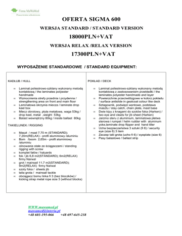 OFERTA SIGMA 600 WERSJA STANDARD / STANDARD VERSION 18000PLN+VAT WERSJA RELAX /RELAX VERSION 17300PLN+VAT WYPOSAŻENIE STANDARDOWE / STANDARD EQUIPMENT: KADŁUB / HULL • • • • • Laminat poliestrowo-szklany wykonany metodą kontaktową / the laminates polyester handmade Wzmocnienia strefy przednia i przydenna / strengthening area on front and main floor Laminatowa skrzynia miecza / laminate drop keel box Miecz obrotowy, płyta metalowa, waga 53kg / drop keel, metal ,weight 53kg Balast wewnętrzny 80kg / inside ballast 80kg TAKIELUNEK / RIGGING • • • • • • • • • Maszt / mast 7,70 m (STANDARD); 7,20m(RELAX) - profil aluminiowy /aluminiu Bom /boom 2,65m - profil aluminiowy /aluminiu olinowanie stałe ze ściągaczami / standing rigging with screw komplet fałów / halyards fok / jib 6,8 m2(STANDARD); 6m2(RELAX) firmy Narwal grot / mainsail 11,7 m2(STANDARD); 9m2(RELAX) firmy Narwal szoty foka / sheets jib talia grota / mainsail tackle obciągacz bomu linka fi 3 (bez bloczków) / kicking strap metal rope size 3 (without blocks) WWW.mawamed.pl [email protected] +48 601-195-066 +48 697-645-238 POKŁAD / DECK • • • • • • • • Laminat poliestrowo-szklany wykonany metodą kontaktową z zastosowaniem przekładki / the laminates polyester handmade and layer Powierzchnie przeciwślizgowe w kolorz pokładu / surface antislide in gealcoat colour like deck Sztagownik, podwięzi wantowe, podstawa masztu / stay catch, chain plate, mast base Dwie kipy z knagami do szotów foka (Harken) / two eye and cleats for jib sheet (Harken) Jarzmo steru z aluminium, laminatowa płetwa sterowa i rumpel / helm rudder with aluminum yoke,laminate drop flipper and hand tiller Ucha bezpieczeństwa 3 sztuki (fi 6) / security eye (size 6) 3 item Zaczep talii grota (ucho fi 6) / eyeplate (size 6) Pasy balastowe / ballast strip WYPOSAŻENIE DODATKOWE (za dopłatą) ADDITIONAL EQUIPMENT (additional payment) Lp Opis / description Powierzchnie antypoślizgowe na pokładzie w kolorze innym niż pokład / surface 1 antislide in other colour like deck 2 Kieszeń kokpitowa / pocket in cockpit 3 Relingi pokładowe dziobowe dwie sztuki / rails two item (front) 4 Relingi pokładowe rufowe dwie sztuki / rails two item (back) 5 Wspornik transportowy masztu dziobowy / mast support of transport (front) 6 Wspornik transportowy masztu rufowy / mast suport of transport (back) 7 Stolik talii grota / mainsail takle table 8 Podstawa pod stolik talii grota / suport for mainsail takle table 9 Roler foka / jib roller 10 Pasy samonośne / standing ballast strip 11 Zaczep silnika / engine catch 12 Łoża taransportowe do przyczep typu Zaród / transport cradle for „ZAROD” trailer Na życzenie klienta montujemy i instalujemy dodatkowy osprzęt We fit additional accessories on wish of client Zastrzegamy sobie możliwość zmiany ceny oraz listy wyposażenia. / We stipulate capability of price change and lists of endowments. WWW.mawamed.pl Headquarters: Studio: Ul. Sikorskiego 110 Radzionkow 41-922 Polska ul. Teligi 2 Chelm Slaski 41-403 Polska [email protected] +48 601-195-066 +48 697-645-238