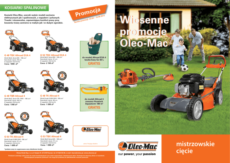 KOSIARKI SPALINOWE Kosiarki Oleo-Mac, szeroki wybór modeli zarówno elektrycznych jak i spalinowych, z napędem i pchanych. Trwałe i niezawodne, zapewniające komfort pracy przy koszeniu trawy zarówno w małym jak i w dużym ogrodzie. G 48 TBX Allroad EXA 4 Silnik B&S, Seria 625 - 190 cm3 Szerokość cięcia: 46 cm Z napędem (3,6 km/h) in Term 04 – i: 23. .2012 10.06 ocj prom Wiosenne promocje Oleo-Mac G 53 TBX Allroad EXA 4 Silnik B&S, Seria 650 - 190 cm3 Szerokość cięcia: 51 cm Z napędem (3,6 km/h) Cena: 2 150 zł* Cena: 1999 zł* a j c o Prom do modeli Allroad EXA 4 taczka Easy Go 60 L GRATIS G 48 TK Allroad 4 G 48 TBR Allroad 4 Silnik B&S, Seria 575, OHV - 140 cm Szerokość cięcia: 46 cm Z napędem (3,6 km/h) Silnik Emak K 650 OHV- 159 cm3 Szerokość cięcia: 46 cm Z napędem (3,6 km/h) Cena: 1780 zł* Cena: 1 599 zł* 3 do modeli Allroad 4 zraszacz Hozelock Aquastorm 180 m2 GRATIS G 53 TK Allroad 4 G 53 TBX Allroad 4 Silnik Emak K 800 OHV- 196 cm3 Szerokość cięcia: 51 cm Z napędem (3,6 km/h) Silnik B&S Seria 625 - 190 cm3 Szerokość cięcia: 51 cm Z napędem (3,6 km/h) Cena: 1 699 zł* Cena: 1 880 zł* adres Twojego dealera *podane ceny to sugerowane ceny detaliczne brutto Victus-Emak Sp.z o.o.ul. Karpia 37, 61-619 Poznań, tel. 61 823 83 69, e-mail: [email protected], www.oleomac.pl Producent zastrzega sobie prawo do zmian konstrukcyjnych oraz zmian wyposażenia. Zamieszczone dane i ilustracje nie stanowią oferty w rozumieniu obowiązujących przepisów prawnych i nie mogą być podstawą do jakichkolwiek roszczeń prawnych. mistrzowskie cięcie PROMOCJE CENOWE OLEO-MAC. KOSY SPALINOWE Szeroka gama wysokiej jakości urządzeń do pracy w lesie i w ogrodzie. Maszyny Oleo-Mac zapewniają optymalną kombinację wydajności, wytrzymałości oraz łatwości obsługi i prostoty konserwacji. a j c o Prom 859 zł 12 .06.20 : mocji in pro Term – 30 23.04 Kosy spalinowe - od modeli uniwersalnych, przez półprofesjonalne do modeli profesjonalnych przeznaczonych do intensywnych prac. Wszystkie maszyny charakteryzuje wysoka wydajność i komfort użytkowania. a j c o Prom 799 zł* 12 .06.20 in Term 899 zł ocji: prom – 10 23.04 SPARTA 380 T SPARTA 440T Moc silnika: 2,0 KM Moc użyteczna urządzenia: 1,8 KM Pojemność: 36,2 cm3 Moc silnika: 2,4 KM Moc użyteczna urządzenia: 2,1 KM Pojemność: 40,2 cm3 Cena: 1 290 zł* Cena: 1 490 zł* 746 T 753 T 755 Master Moc silnika: 2,8 KM Moc użyteczna urządzenia: 2,5 KM Pojemność: 45,7 cm3 Moc silnika: 3,2 KM Moc użyteczna urządzenia: 2,8 KM Pojemność: 52,5 cm3 Moc silnika: 3,2 KM Moc użyteczna urządzenia: 2,8 KM Pojemność: 52,5 cm3 Cena: 2 290 zł* Cena: 2 740 zł* Cena: 2 850 zł* 799 zł* Sparta 250T Kosiarka G 44 PK Moc silnika: 1,2 KM Moc użyteczna urządzenia: 1,0 KM Pojemność: 25,4 cm3 Silnik: EMAK K 500 OHV Szerokość cięcia: 41 cm Pchana 759 zł 699 zł* Pilarka GS 350 Moc silnika: 2,2 KM Moc użyteczna urządzenia: 2,1 KM Pojemność: 38,9 cm3 3 lata gwarancji na pilarki GS 350, GS 370, GS 410, GS 410 CX oraz na kosiarki z silnikami Emak do modeli 746T, 753T i 755 Master osłona twarzy z ochronnikami słuchu do modeli SPARTA 380T i 440T żyłka 56 m i osłona twarzy GRATIS GRATIS