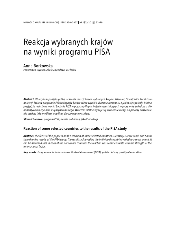 dialogi o kulturze i edukacji | issn 2300–360x | nr 1(2)/2013 | 53–70 Reakcja wybranych krajów na wyniki programu PISA Anna Borkowska Państwowa Wyższa Szkoła Zawodowa w Płocku Abstrakt. W artykule podjęto próbę ukazania reakcji trzech wybranych krajów: Niemiec, Szwajcarii i Korei Południowej, które w programie PISA osiągnęły bardzo różne wyniki i ukazanie rezonansu z jakim się spotkały. Można przyjąć, że reakcja na wyniki badania PISA w poszczególnych krajach uczestniczących w programie świadczy o sile oddziaływania czynnika międzynarodowego. Wówczas istotne wydaje się zwrócenie uwagi na procesy doskonalenia oświaty jako możliwej wspólnej drodze naprawy szkoły. Słowa kluczowe: program PISA, debata publiczna, jakość edukacji Reaction of some selected countries to the results of the PISA study Abstract. The focus of the paper is on the reaction of three selected countries (Germany, Switzerland, and South Korea) to the results of the PISA study. The results achieved by the individual countries varied to a great extent. It can be assumed that in each of the participant countries the reaction was commensurate with the strength of the international factor. Key words: Programme for International Student Assessment (PISA), public debate, quality of education 54 | Międzynarodowy Program Oceny Umiejętności Uczniów PISA (Programme for International Student Assessment) jest uznanym w skali międzynarodowej projektem badawczym poświęconym badaniu kompetencji uczniów1, którzy ukończyli 15 rok życia i zbliżają się do końca obowiązkowej edukacji. Zainicjowanie badań podyktowane było stwierdzoną przez społeczność międzynarodową potrzebą wdrażania dynamicznego modelu kształcenia przez całe życie i stało się głównym założeniem programu PISA2. Celem jest pozyskanie informacji, w jakim stopniu młodzi ludzie na etapie obowiązkowej i powszechnej edukacji zostali wyposażeni w wiedzę i umiejętności niezbędne w dorosłym życiu3. We współczesnym świecie edukacja stała się, podobnie jak gospodarka, częścią światowego systemu. Na przykładzie programu PISA można zauważyć, w jakim stopniu gremia międzynarodowe wpływają na narodową politykę oświatową poszczególnych państw. Gwarantem umiędzynarodowienia oświaty krajowej jest w tym przypadku organizacja OECD, nazywana „szarą eminencją polityki oświatowej”4. Można przyjąć, że reakcja na wyniki badania PISA w poszczególnych krajach uczestniczących w programie świadczy o sile oddziaływania czynnika międzynarodowego. Przy czym, co warto zaznaczyć, nie chodzi tylko o rezonans medialny (chociaż ten w niektórych krajach okazał się bardzo gwałtowny), lecz także o sposoby doskonalenia rodzimej oświaty, w tym inicjowane reformy, jako konsekwencje osiągniętych przez uczniów rezultatów. W artykule podjęto próbę ukazania reakcji trzech wybranych krajów: Niemiec, Szwajcarii i Korei Południowej, które w programie PISA osiągnęły bardzo różne wyniki i ukazanie oddźwięku, z jakim się spotkały. 1 Koordynatorem programu PISA jest Organizacja Współpracy Gospodarczej i Rozwoju (OECD). Badanie przeprowadzane jest regularnie, co trzy lata, począwszy od 2000 r. Wyróżniono w nim trzy podstawowe dziedziny: czytanie ze zrozumieniem (reading literacy), matematyka (mathematical literacy) oraz rozumowanie w naukach przyrodniczych (scientific literacy) badane w każdej kolejnej edycji, ponadto jeden z wymienionych obszarów poddawany jest pogłębionej analizie (w 2000 r. było to czytanie ze zrozumieniem, w 2003 r. – matematyka, w 2006 r. – rozumowanie w naukach przyrodniczych). 2 M. Federowicz: Założenia programu, <http//www.ifispan.waw.pl/ifis.badania/program_ założenia>, (data dostępu: 10.04.2009) 3 W kolejnych edycjach zwiększa się liczba krajów uczestniczących w programie: w 2000 r. – 32 państwa, w 2003 r. – 41 państw, w 2006 r. – 57 państw, w 2009 r. – 65 państw, w 2012 r. – 64 państwa. 4 A. P. Jakobi: Die Bildungspoltik der OECD: Vom Erfolg eines scheinbar machtlosen Akteurs, „Zeitschrift für Pädagogik” 2007, Jahrgang 53-Heft 2, s. 169. DIALOGI O KULTURZE I EDUKACJI | NR 1(2)/2013 | ISSN 2300–360X Poniżej przedstawiono ranking wszystkich państw uczestniczących w trzech kolejnych edycjach. Tabela 1. PISA 2000 Czytanie ze zrozumieniem Matematyka Nauki przyrodnicze Źródło: PISA 2000, Deutsches PISA-Konsortium Tabela 2. PISA 2003 Czytanie ze zrozumieniem Matematyka Nauki przyrodnicze ANNA BORKOWSKA | REAKCJA WYBRANYCH KRAJÓW NA WYNIKI PROGRAMU PISA | 55 56 | Źródło: PISA 2003, PISA – Konsortium5 Tabela 3. PISA 2006 Czytanie ze zrozumieniem Matematyka Nauki przyrodnicze 5 M. Prenzel: PISA 2003 Der Bildungsstand der Jugendlicher in Deutschland – Ergebnisse des zweiten internationalen Vergleichs, Münster–New York–München–Berlin 2004, s. 70, 99, 118. DIALOGI O KULTURZE I EDUKACJI | NR 1(2)/2013 | ISSN 2300–360X | 57 * Brak danych Źródło: PISA 2006, PISA – Konsortium6 6 M. Prenzel: PISA 2006 in Deutschland. Die Kompetenzen der Jugendlichen im dritten Ländervergleich, Münster–New York–München–Berlin 2008, s. 88, 229, 259. ANNA BORKOWSKA | REAKCJA WYBRANYCH KRAJÓW NA WYNIKI PROGRAMU PISA Niemcy – PISA-szok 58 | Rezultaty programu PISA, a szczególnie ich pierwszej edycji z 2000 r. pokazały słabości niemieckiego systemu edukacyjnego. O ile fakt ten, przynajmniej dla niektórych naukowców, był znany (PISA potwierdziły wcześniejsze słabe wyniki uzyskane przez niemieckich uczniów na początku lat 90. w programie TIMSS7), o tyle reakcja oraz dyskusja, jaka rozgorzała po opublikowaniu 4 grudnia 2001 r. wyników PISA 2000, stała się fenomenem na niespotykaną dotąd w Niemczech skalę8. Felietony i komentarze odnoszące się do rezultatów PISA, które ukazały się w prasie i wiadomościach telewizyjnych, zdominowały inne wydarzenia9. O rozmiarze tego zjawiska świadczy 