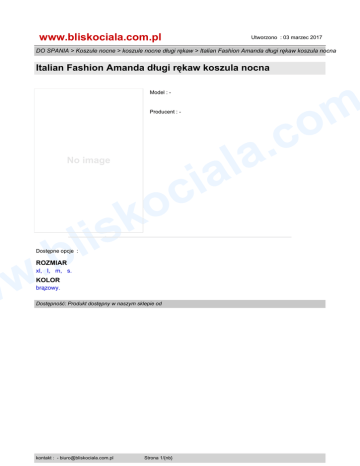 www.bliskociala.com.pl Utworzono : 03 marzec 2017 DO SPANIA > Koszule nocne > koszule nocne długi rękaw > Italian Fashion Amanda długi rękaw koszula nocna Italian Fashion Amanda długi rękaw koszula nocna m o c . a l a Model : - Producent : - No image i c o k il s w b . w Dostępne opcje : ROZMIAR xl, l, m, s. KOLOR brązowy. Dostępność: Produkt dostępny w naszym sklepie od kontakt : - [email protected] Strona 1/{nb}