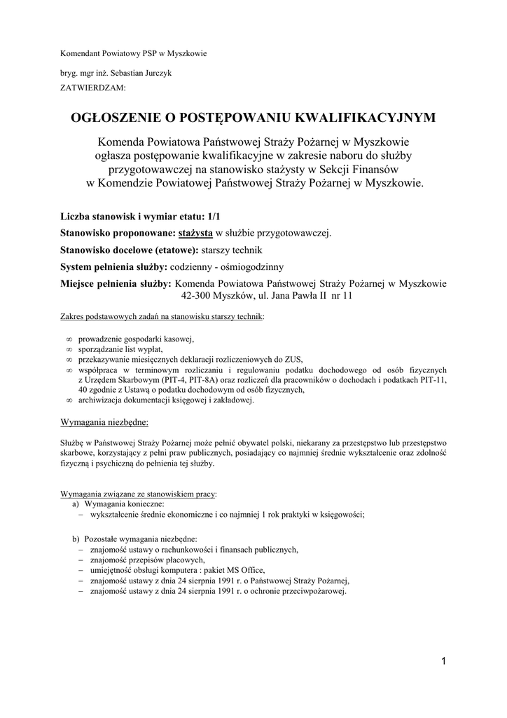Komendant Powiatowy PSP w Myszkowie bryg. mgr inż. Sebastian Jurczyk ZATWIERDZAM: OGŁOSZENIE O POSTĘPOWANIU KWALIFIKACYJNYM Komenda Powiatowa Państwowej Straży Pożarnej w Myszkowie ogłasza postępowanie kwalifikacyjne w zakresie naboru do służby przygotowawczej na stanowisko stażysty w Sekcji Finansów w Komendzie Powiatowej Państwowej Straży Pożarnej w Myszkowie. Liczba stanowisk i wymiar etatu: 1/1 Stanowisko proponowane: stażysta w służbie przygotowawczej. Stanowisko docelowe (etatowe): starszy technik System pełnienia służby: codzienny - ośmiogodzinny Miejsce pełnienia służby: Komenda Powiatowa Państwowej Straży Pożarnej w Myszkowie 42-300 Myszków, ul. Jana Pawła II nr 11 Zakres podstawowych zadań na stanowisku starszy technik: • • • • prowadzenie gospodarki kasowej, sporządzanie list wypłat, przekazywanie miesięcznych deklaracji rozliczeniowych do ZUS, współpraca w terminowym rozliczaniu i regulowaniu podatku dochodowego od osób fizycznych z Urzędem Skarbowym (PIT-4, PIT-8A) oraz rozliczeń dla pracowników o dochodach i podatkach PIT-11, 40 zgodnie z Ustawą o podatku dochodowym od osób fizycznych, • archiwizacja dokumentacji księgowej i zakładowej. Wymagania niezbędne: Służbę w Państwowej Straży Pożarnej może pełnić obywatel polski, niekarany za przestępstwo lub przestępstwo skarbowe, korzystający z pełni praw publicznych, posiadający co najmniej średnie wykształcenie oraz zdolność fizyczną i psychiczną do pełnienia tej służby. Wymagania związane ze stanowiskiem pracy: a) Wymagania konieczne: − wykształcenie średnie ekonomiczne i co najmniej 1 rok praktyki w księgowości; b) Pozostałe wymagania niezbędne: − znajomość ustawy o rachunkowości i finansach publicznych, − znajomość przepisów płacowych, − umiejętność obsługi komputera : pakiet MS Office, − znajomość ustawy z dnia 24 sierpnia 1991 r. o Państwowej Straży Pożarnej, − znajomość ustawy z dnia 24 sierpnia 1991 r. o ochronie przeciwpożarowej. 1 c) Wymagania pożądane: − prawo jazdy Kat. B, − umiejętność pracy w zespole, komunikatywność, terminowość i dokładność, dyspozycyjność, − umiejętność nawiązywania kontaktów i współpracy z instytucjami zewnętrznymi, − umiejętność samodzielnej pracy, − kreatywność i umiejętność analitycznego myślenia. d) Wymagane dokumenty i oświadczenia: − podanie o przyjęcie do służby w Państwowej Straży Pożarnej Załącznik nr 1, − życiorys, − kserokopie świadectw pracy lub służby z poprzednich miejsc pracy lub służby, o ile wcześniej kandydat pozostawał w stosunku pracy lub służby, − kopie dokumentów potwierdzających posiadane wykształcenie, wyszkolenie lub posiadane umiejętności, − kopię dokumentu potwierdzającego posiadanie obywatelstwa polskiego, − podpisane oświadczenie o wyrażeniu zgody na przetwarzanie danych osobowych niezbędnych do realizacji procesu postepowania kwalifikacyjnego, zgodnie z przepisami o ochronie danych osobowych, Załącznik nr 2, − podpisane oświadczenie o korzystaniu z pełni praw publicznych - Załącznik nr 3, − podpisane oświadczenie o niekaralności za przestępstwo lub przestępstwo skarbowe Załącznik nr 4, − zaświadczenie lekarskie dla kobiet o braku przeciwwskazań zdrowotnych do wykonywania ćwiczeń fizycznych wystawione nie wcześniej niż 30 dni przed przystąpieniem do testu Załącznik nr 5, − zaświadczenie lekarskie dla mężczyzn o braku przeciwwskazań zdrowotnych do wykonywania ćwiczeń fizycznych wystawione nie wcześniej niż 30 dni przed przystąpieniem do testu Załącznik nr 6. Uwaga: koszty ewentualnych badań i wystawienia zaświadczenia pokrywa kandydat. Informacje dodatkowe : - na proponowanym stanowisku kandydat do przyjęcia do służby przygotowawczej jako stażysta, otrzymuje wynagrodzenie brutto około 2 520 zł., - kandydat do 3 miesięcy od zatrudnienia zostaje skierowany na szkolenie podstawowe w zawodzie strażak, które trwa około 5 miesięcy w systemie skoszarowanym, - podczas w/w szkolenia należy wykazać się umiejętnością pływania, - aby zostać skierowanym na w/w szkolenie, konieczne jest ukończenie szkolenia podstawowego i szkolenia z zakresu ratownictwa technicznego strażaków ratowników OSP, oraz we własnym zakresie szkolenie z zakresu pierwszej pomocy Uwaga: dokumenty, przy których znajduje się adnotacja „Załącznik nr…” dostępne są w sekretariacie Komendy Powiatowej PSP w Myszkowie oraz na stronie internetowej http://bip.myszkow.katowice.kwpsp.gov.pl w zakładce „Ogłoszenia". Brak jakiegokolwiek wymaganego dokumentu eliminuje kandydata z dalszego postępowania kwalifikacyjnego. Życiorys oraz wymagane oświadczenia załączone do dokumentów aplikacyjnych należy opatrzyć odręcznym i czytelnym podpisem wraz z datą. Wymagane dokumenty należy składać w zaklejonej kopercie formatu A4 opisanej imieniem i nazwiskiem, z dopiskiem: „Nabór do służby - PF system codzienny” w sekretariacie Komendy Powiatowej PSP w Myszkowie od poniedziałku do piątku w godzinach od 800 do 15 00 lub za pośrednictwem poczty na adres: Komenda Powiatowa Państwowej Straży Pożarnej w Myszkowie, ul. Jana Pawła II 11, 42-300 Myszków (liczy się data stempla pocztowego) w nieprzekraczalnym terminie do dnia 9 marca 2016 roku, do godz.1500 - oferty złożone po tym terminie nie będą brane pod uwagę. Przy składaniu dokumentów każdemu kandydatowi zostanie nadany numer identyfikacyjny, który będzie wykorzystany w ogłaszanych wynikach poszczególnych etapów naboru. 2 Oferty (aplikacje) nie spełniające kryteriów naboru oraz oferty kandydatów, którzy nie zakwalifikowali się do przyjęcia do służby w Komendzie Powiatowej PSP w Myszkowie, będą do odbioru w siedzibie Komendy do 7 dni po zakończeniu postępowania kwalifikacyjnego. Nieodebrane dokumenty zostaną zniszczone po upływie 2 tygodni od dnia zakończenia