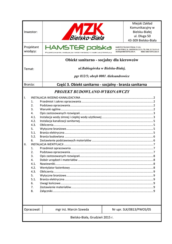Miejski Zakład Komunikacyjny w Bielsku-Białej ul. Długa 50 43-309 Bielsko-Biała Inwestor: Projektant wiodący: Obiekt sanitarno - socjalny dla kierowców Temat: ul.Babiogórska w Bielsku-Białej, pgr 832/5; obręb 0001 Aleksandrowice Branża: Część 3. Obiekt sanitarno - socjalny - branża sanitarna PROJEKT BUDOWLANO-WYKONAWCZY I. II. INSTALACJA WODNO-KANALIZACYJNA ........................................................................................... 2 1. Przedmiot i zakres opracowania .......................................................................................... 2 2. Podstawa opracowania ........................................................................................................ 2 3. Warunki ogólne.................................................................................................................... 2 4. Opis zastosowanych rozwiązań............................................................................................ 3 4.1. Instalacja wody zimnej i ciepłej wody użytkowej ................................................................ 3 4.2. Instalacja kanalizacji sanitarnej............................................................................................ 5 4.3. Obliczenia ............................................................................................................................. 5 5. Wytyczne branżowe............................................................................................................. 5 5.1. Branża elektryczna ............................................................................................................... 5 5.2. Branża budowlana ............................................................................................................... 6 6. Zestawienie podstawowych materiałów ............................................................................. 6 INSTALACJA WENTYLACJI ................................................................................................................ 7 1. Przedmiot opracowania ....................................................................................................... 7 2. Podstawa opracowania ........................................................................................................ 7 3. Opis zastosowanych rozwiązań............................................................................................ 8 4. Dobór urządzeń i materiałów .............................................................................................. 8 4.1. Nawiewniki........................................................................................................................... 8 4.2. Wentylator łazienkowy ........................................................................................................ 8 4.3. Obliczenia ............................................................................................................................. 9 5. Wytyczne branżowe............................................................................................................. 9 5.1. Branża elektryczna ............................................................................................................... 9 6. Uwagi końcowe .................................................................................................................... 9 7. Zestawienie materiałów....................................................................................................... 9 8. Załączniki .............................................................................................................................. 9 Opracował: mgr inż. Marcin Szweda Nr upr. SLK/0813/PWOS/05 Bielsko-Biała, Grudzień 2015 r. I. INSTALACJA WODNO-KANALIZACYJNA 1. Przedmiot i zakres opracowania Przedmiotem opracowania jest projekt budowlano - wykonawczy instalacji wodnokanalizacyjnej obiektu sanitarno - socjalnego dla potrzeb kierowców MZK w Bielsku-Białej, mieszczącego się przy ul. Babiogórskiej na działce nr 832/5. Zakres opracowania obejmuje: - projekt instalacji wody zimnej i ciepłej punktów czerpalnych - projekt instalacji odprowadzającej ścieki sanitarne z przyborów sanitarnych Zakres opracowania nie obejmuje: - projektów przyłączy wod - kan, 2. Podstawa opracowania Podstawę opracowania projektu stanowią: - zlecenie na prace projektowe; - ustalenie z Inwestorem, co do zakresu projektu i przyjętych rozwiązań technicznych; - podkłady mapowe i architektoniczne; - ustawy, rozporządzenia oraz normy objęte zakresem niniejszego opracowania; - wytyczne branżowe. 3. Warunki ogólne • Wszelkie instalacje należy wykonać zgodnie z: - Prawem Budowlanym - „Warunkami Technicznymi Jakim Powinny Odpowiadać Budynki i Ich Usytuowanie” - Instrukcjami odnoszącymi się do poszczególnych instalacji - Polskimi Normami - zgodnie ze sztuką budowlaną. • Obowiązkiem wykonawców instalacji jest dostarczenie wymaganych, aktualnych atestów i dopuszczeń, oraz certyfikatów wszystkich zastosowanych materiałów i urządzeń. Wszystkie urządzenia muszą być oznaczone znakiem bezpieczeństwa. W przypadku urządzeń, które nie podlegają obowiązkowi zgłaszania do certyfikacji na znak bezpieczeństwa i oznaczenia tym znakiem, wykonawca jest zobowiązany dostarczyć odpowiednią deklarację zgodności. 2 • Wykonawca jest zobowiązany do wykonania kompletnej instalacji opisanej w niniejszym projekcie. • Wykonawca jest zobowiązany do zrealizowania wszystkich brakujących i pominiętych w niniejszym opracowaniu elementów instalacji wraz z dostarczeniem koniecznych materiałów i urządzeń dla kompletnego wykonania instalacji i zapewnienia jej pełnej funkcjonalności. • Wykonawca jest również zobowiązany do koordynacji i wykonania połączeń instalacji w punktach wykonywanych przez wykonawców innych branż. Wykonawca jest zobowiązany do zapoznania się z kompletną specyfikacj