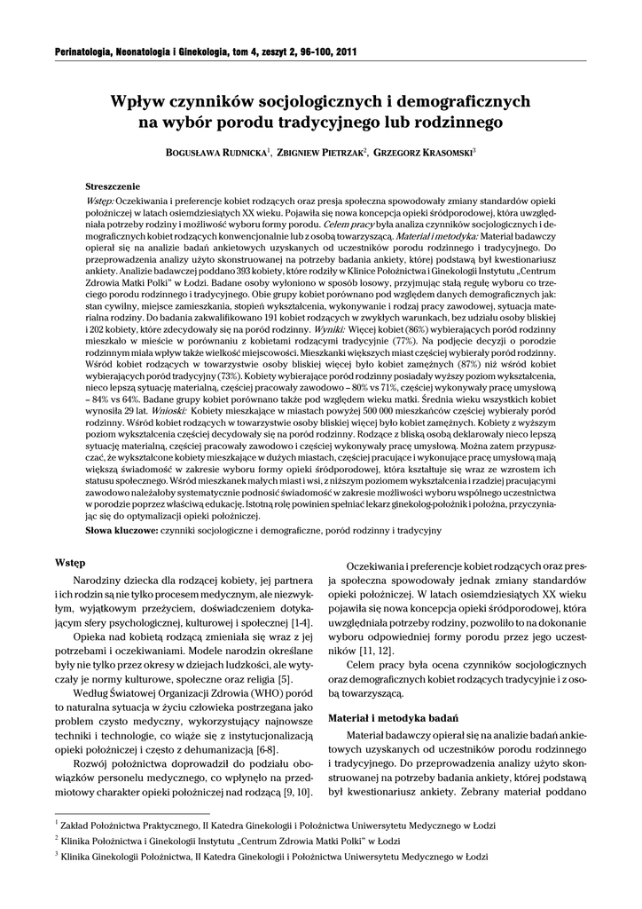 Perinatologia, Neonatologia i Ginekologia, tom 4, zeszyt 2, 96-100, 2011 Wpływ czynników socjologicznych i demograficznych na wybór porodu tradycyjnego lub rodzinnego BOGUSŁAWA RUDNICKA1, ZBIGNIEW PIETRZAK2, GRZEGORZ KRASOMSKI3 Streszczenie Wstęp: Oczekiwania i preferencje kobiet rodzących oraz presja społeczna spowodowały zmiany standardów opieki położniczej w latach osiemdziesiątych XX wieku. Pojawiła się nowa koncepcja opieki śródporodowej, która uwzględniała potrzeby rodziny i możliwość wyboru formy porodu. Celem pracy była analiza czynników socjologicznych i demograficznych kobiet rodzących konwencjonalnie lub z osobą towarzyszącą. Materiał i metodyka: Materiał badawczy opierał się na analizie badań ankietowych uzyskanych od uczestników porodu rodzinnego i tradycyjnego. Do przeprowadzenia analizy użyto skonstruowanej na potrzeby badania ankiety, której podstawą był kwestionariusz ankiety. Analizie badawczej poddano 393 kobiety, które rodziły w Klinice Położnictwa i Ginekologii Instytutu „Centrum Zdrowia Matki Polki” w Łodzi. Badane osoby wyłoniono w sposób losowy, przyjmując stałą regułę wyboru co trzeciego porodu rodzinnego i tradycyjnego. Obie grupy kobiet porównano pod względem danych demograficznych jak: stan cywilny, miejsce zamieszkania, stopień wykształcenia, wykonywanie i rodzaj pracy zawodowej, sytuacja materialna rodziny. Do badania zakwalifikowano 191 kobiet rodzących w zwykłych warunkach, bez udziału osoby bliskiej i 202 kobiety, które zdecydowały się na poród rodzinny. Wyniki: Więcej kobiet (86%) wybierających poród rodzinny mieszkało w mieście w porównaniu z kobietami rodzącymi tradycyjnie (77%). Na podjęcie decyzji o porodzie rodzinnym miała wpływ także wielkość miejscowości. Mieszkanki większych miast częściej wybierały poród rodzinny. Wśród kobiet rodzących w towarzystwie osoby bliskiej więcej było kobiet zamężnych (87%) niż wśród kobiet wybierających poród tradycyjny (73%). Kobiety wybierające poród rodzinny posiadały wyższy poziom wykształcenia, nieco lepszą sytuację materialną, częściej pracowały zawodowo – 80% vs 71%, częściej wykonywały pracę umysłową – 84% vs 64%. Badane grupy kobiet porównano także pod względem wieku matki. Średnia wieku wszystkich kobiet wynosiła 29 lat. Wnioski: Kobiety mieszkające w miastach powyżej 500 000 mieszkańców częściej wybierały poród rodzinny. Wśród kobiet rodzących w towarzystwie osoby bliskiej więcej było kobiet zamężnych. Kobiety z wyższym poziom wykształcenia częściej decydowały się na poród rodzinny. Rodzące z bliską osobą deklarowały nieco lepszą sytuację materialną, częściej pracowały zawodowo i częściej wykonywały pracę umysłową. Można zatem przypuszczać, że wykształcone kobiety mieszkające w dużych miastach, częściej pracujące i wykonujące pracę umysłową mają większą świadomość w zakresie wyboru formy opieki śródporodowej, która kształtuje się wraz ze wzrostem ich statusu społecznego. Wśród mieszkanek małych miast i wsi, z niższym poziomem wykształcenia i rzadziej pracującymi zawodowo należałoby systematycznie podnosić świadomość w zakresie możliwości wyboru wspólnego uczestnictwa w porodzie poprzez właściwą edukację. Istotną rolę powinien spełniać lekarz ginekolog-położnik i położna, przyczyniając się do optymalizacji opieki położniczej. Słowa kluczowe: czynniki socjologiczne i demograficzne, poród rodzinny i tradycyjny Wstęp Narodziny dziecka dla rodzącej kobiety, jej partnera i ich rodzin są nie tylko procesem medycznym, ale niezwykłym, wyjątkowym przeżyciem, doświadczeniem dotykającym sfery psychologicznej, kulturowej i społecznej [1-4]. Opieka nad kobietą rodzącą zmieniała się wraz z jej potrzebami i oczekiwaniami. Modele narodzin określane były nie tylko przez okresy w dziejach ludzkości, ale wytyczały je normy kulturowe, społeczne oraz religia [5]. Według Światowej Organizacji Zdrowia (WHO) poród to naturalna sytuacja w życiu człowieka postrzegana jako problem czysto medyczny, wykorzystujący najnowsze techniki i technologie, co wiąże się z instytucjonalizacją opieki położniczej i często z dehumanizacją [6-8]. Rozwój położnictwa doprowadził do podziału obowiązków personelu medycznego, co wpłynęło na przedmiotowy charakter opieki położniczej nad rodzącą [9, 10]. Oczekiwania i preferencje kobiet rodzących oraz presja społeczna spowodowały jednak zmiany standardów opieki położniczej. W latach osiemdziesiątych XX wieku pojawiła się nowa koncepcja opieki śródporodowej, która uwzględniała potrzeby rodziny, pozwoliło to na dokonanie wyboru odpowiedniej formy porodu przez jego uczestników [11, 12]. Celem pracy była ocena czynników socjologicznych oraz demograficznych kobiet rodzących tradycyjnie i z osobą towarzyszącą. Materiał i metodyka badań Materiał badawczy opierał się na analizie badań ankietowych uzyskanych od uczestników porodu rodzinnego i tradycyjnego. Do przeprowadzenia analizy użyto skonstruowanej na potrzeby badania ankiety, której podstawą był kwestionariusz ankiety. Zebrany materiał poddano 1 Zakład Położnictwa Praktycznego, II Katedra Ginekologii i Położnictwa Uniwersytetu Medycznego w Łodzi 2 Klinika Położnictwa i Ginekologii Instytutu „Centrum Zdrowia Matki Polki” w Łodzi 3 Klinika Ginekologii Położnictwa, II Katedra Ginekologii i Położnictwa Uniwersytetu Medycznego w Łodzi 97 Wpływ czynników socjologicznych i demograficznych na wybór porodu tradycyjnego lub rodzinnego analizie opisowej i statystycznej. Analizę zgodności cech mierzalnych przeprowadzono za pomocą testu chi2. Dla wnioskowania statystycznego przyjęto poziom istotności p < 0,05. Analizie badawczej poddano 393 kobiety, które rodziły w Klinice Położnictwa i Ginekologii Instytutu „Centrum Zdrowia Matki Polki” . Badane 