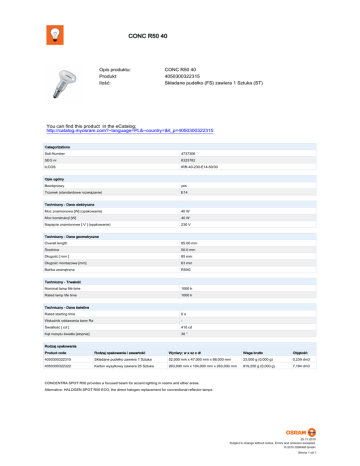 CONC R50 40 Opis produktu: Produkt: Ilość: CONC R50 40 4050300322315 Składane pudełko (FS) zawiera 1 Sztuka (ST) You can find this product in the eCatalog: http://catalog.myosram.com?~language=PL&~country=&it_p=4050300322315 Categorizations Sstl-Number 4737306 SEG nr 8325782 ILCOS IRR-40-230-E14-50/30 Opis ogólny Bezrtęciowy yes Trzonek (standardowe rozwiązanie) E14 Techniczny - Dane elektryczne Moc znamionowa [W] (opakowanie) 40 W Moc konstrukcji [W] 40 W Napięcie znamionowe [ V ] (opakowanie) 230 V Techniczny - Dane geometryczne Overall length 85.00 mm Średnica 50.0 mm Długość [ mm ] 85 mm Długość montażowa [mm] 63 mm Bańka zewnętrzna R50G Techniczny - Trwałość Nominal lamp life time 1000 h Rated lamp life time 1000 h Techniczny - Dane świetlne Rated starting time 0s Wskaźnik oddawania barw Ra - Światłość [ cd ] 410 cd Kąt rozsyłu światła [stopnie] 30 ° Rodzaj opakowania Product code Rodzaj opakowania i zawartość Wyniary: w x sz x dł Waga brutto Objętość: 4050300322315 Składane pudełko zawiera 1 Sztuka 52,000 mm x 47,000 mm x 88,000 mm 23,000 g (0,000 g) 0,239 dm3 4050300322322 Karton wysylkowy zawiera 25 Sztuka 263,000 mm x 104,000 mm x 263,000 mm 819,250 g (0,000 g) 7,194 dm3 CONCENTRA SPOT R50 provides a focused beam for accent lighting in rooms and other areas. Alternative: HALOGEN SPOT R50 ECO, the direct halogen replacement for conventional reflector lamps. 25.11.2010 Subject to change without notice. Errors and omission excepted. © 2010 OSRAM GmbH Strona 1 od 1