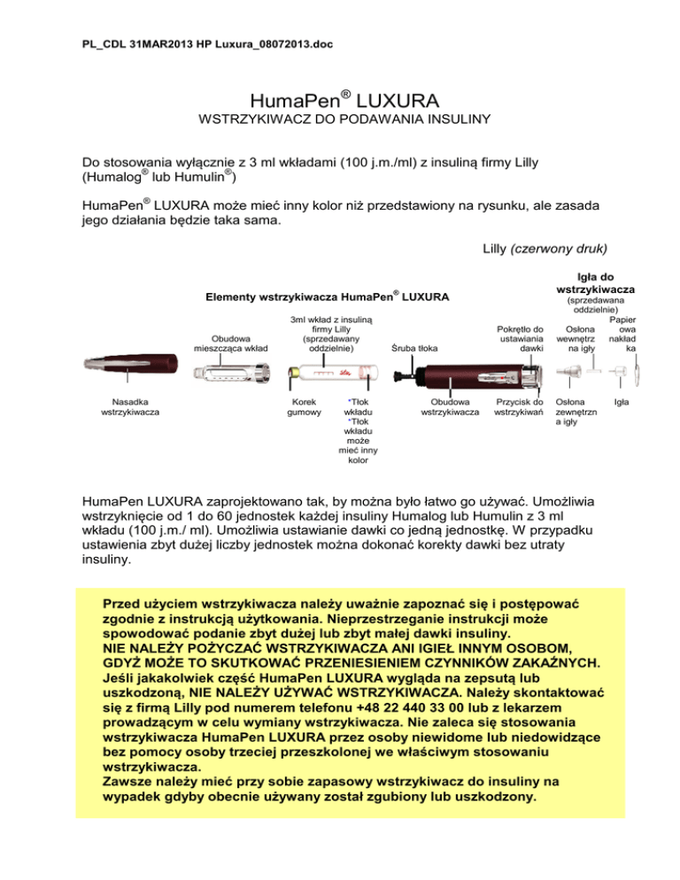 PL_CDL 31MAR2013 HP Luxura_08072013.doc HumaPen® LUXURA WSTRZYKIWACZ DO PODAWANIA INSULINY Do stosowania wyłącznie z 3 ml wkładami (100 j.m./ml) z insuliną firmy Lilly (Humalog® lub Humulin®) HumaPen® LUXURA może mieć inny kolor niż przedstawiony na rysunku, ale zasada jego działania będzie taka sama. Lilly (czerwony druk) ® Igła do wstrzykiwacza Śruba tłoka (sprzedawana oddzielnie) Papier Osłona owa wewnętrz nakład na igły ka Elementy wstrzykiwacza HumaPen LUXURA Obudowa mieszcząca wkład Nasadka wstrzykiwacza 3ml wkład z insuliną firmy Lilly (sprzedawany oddzielnie) Korek gumowy *Tłok wkładu *Tłok wkładu może mieć inny kolor Obudowa wstrzykiwacza Pokrętło do ustawiania dawki Przycisk do wstrzykiwań Osłona zewnętrzn a igły HumaPen LUXURA zaprojektowano tak, by można było łatwo go używać. Umożliwia wstrzyknięcie od 1 do 60 jednostek każdej insuliny Humalog lub Humulin z 3 ml wkładu (100 j.m./ ml). Umożliwia ustawianie dawki co jedną jednostkę. W przypadku ustawienia zbyt dużej liczby jednostek można dokonać korekty dawki bez utraty insuliny. Przed użyciem wstrzykiwacza należy uważnie zapoznać się i postępować zgodnie z instrukcją użytkowania. Nieprzestrzeganie instrukcji może spowodować podanie zbyt dużej lub zbyt małej dawki insuliny. NIE NALEŻY POŻYCZAĆ WSTRZYKIWACZA ANI IGIEŁ INNYM OSOBOM, GDYŻ MOŻE TO SKUTKOWAĆ PRZENIESIENIEM CZYNNIKÓW ZAKAŹNYCH. Jeśli jakakolwiek część HumaPen LUXURA wygląda na zepsutą lub uszkodzoną, NIE NALEŻY UŻYWAĆ WSTRZYKIWACZA. Należy skontaktować się z firmą Lilly pod numerem telefonu +48 22 440 33 00 lub z lekarzem prowadzącym w celu wymiany wstrzykiwacza. Nie zaleca się stosowania wstrzykiwacza HumaPen LUXURA przez osoby niewidome lub niedowidzące bez pomocy osoby trzeciej przeszkolonej we właściwym stosowaniu wstrzykiwacza. Zawsze należy mieć przy sobie zapasowy wstrzykiwacz do insuliny na wypadek gdyby obecnie używany został zgubiony lub uszkodzony. Igła PL_CDL 31MAR2013 HP Luxura_08072013.doc 1 UMIESZCZENIE WKŁADU Z INSULINĄ WE WSTRZYKIWACZU Ważne uwagi • • • • • • • Lekarz prowadzący zalecił najbardziej odpowiedni dla pacjenta typ insuliny. Jakakolwiek zmiana stosowanej insuliny może być przeprowadzona wyłącznie pod nadzorem lekarza. HumaPen LUXURA jest przeznaczony do stosowania wyłącznie z 3 ml wkładami z insuliną firmy Lilly (Humalog lub Humulin). Nie należy stosować wkładów insulinowych innych firm. Należy zapoznać się i postępować zgodnie z instrukcją zamieszczoną w ulotce dla pacjenta dołączonej do 3 ml wkładów insulinowych Humalog lub Humulin. Przed każdym wstrzyknięciem należy przeczytać etykietę na wkładzie i upewnić się, że wstrzykiwacz zawiera właściwy 3 ml wkład insuliny Humalog lub Humulin. Kolor wstrzykiwacza nie jest przeznaczony do rozróżniania typu insuliny. W celu uzyskania dodatkowych informacji dotyczących wstrzykiwacza HumaPen LUXURA oraz insulin Humalog i Humulin zapraszamy na naszą stronę internetową www.lilly.pl Często zadawane pytania dotyczące umieszczania wkładów z insuliną we wstrzykiwaczu 1. Dlaczego śruba tłoka nie wysuwa się, kiedy we wstrzykiwaczu nie ma wkładu? Śruba tłoka może nie wysunąć się podczas wciskania przycisku do wstrzykiwań, jeśli we wstrzykiwaczu nie ma wkładu. Ta cecha wstrzykiwacza umożliwia łatwe wciskanie śruby tłoka do wstrzykiwacza podczas wymiany wkładu. Gdy tylko wkład zostanie umieszczony we wstrzykiwaczu, śruba tłoka wysunie się po wciśnięciu przycisku do wstrzykiwań. 2. Co należy zrobić jeśli nie można przymocować obudowy mieszczącej wkład do obudowy wstrzykiwacza? Należy sprawdzić czy wkład z insuliną jest całkowicie włożony do obudowy. Następnie należy uważnie dopasować obudowę mieszczącą wkład z obudową wstrzykiwacza i przykręcić do oporu. PL_CDL 31MAR2013 HP Luxura_08072013.doc 2 PRZYGOTOWANIE WSTRZYKIWACZA (PRZED KAŻDYM WSTRZYKNIĘCIEM) Ważne uwagi • • • HumaPen LUXURA jest przystosowany do stosowania z igłami do wstrzykiwaczy firmy Becton, Dickinson and Company. Wskazówki dotyczące postępowania z igłą nie mają na celu zastąpienia obowiązujących lokalnie procedur lub zaleceń lekarza prowadzącego. Do każdego wstrzyknięcia należy używać nową igłę. Pomaga to w zapewnieniu jałowości. Pomaga to także w zapobieganiu wyciekania insuliny, przedostawania się pęcherzyków powietrza i zmniejsza możliwość zapchania igły. Często zadawane pytania dotyczące przygotowania wstrzykiwacza 1. Dlaczego ważne jest przygotowanie wstrzykiwacza przed każdym wstrzyknięciem? Jeżeli wstrzykiwacz NIE zostanie przygotowany, możliwe będzie podanie za dużej lub za małej dawki insuliny. Przygotowanie wstrzykiwacza pomaga upewnić się, że wstrzykiwacz i igła działają prawidłowo. Kiedy wstrzykiwacz jest właściwie przygotowany, insulina wypływa z igły strumieniem. Konieczne może być kilkakrotne przygotowanie wstrzykiwacza zanim pojawi się strumień insuliny. 2. Dlaczego po umieszczeniu nowego wkładu przygotowanie wstrzykiwacza może wymagać kilku prób? Pomiędzy śrubą tłoka a tłokiem wkładu może znajdować się odstęp. Powtarzanie kroków przygotowania wstrzykiwacza spowoduje wysunięcie śruby tłoka do styku z tłokiem wkładu. Gdy koniec śruby tłoka popchnie tłok wkładu, insulina zacznie wypływać z igły. Przed przygotowaniem *Tłok wkładu *Tłok wkładu może mieć inny kolor - Odstęp Śruba tłoka Po przygotowaniu Brak odstępu pomiędzy śrubą a tłokiem wkładu Należy powtarzać kroki przygotowania wstrzykiwacza aż do pojawienia się strumienia insuliny. Jeśli z igły nadal nie wypływa strumień insuliny, patrz pytanie nr 3. 3. Dlaczego należy przygotowywać wstrzykiwacz do pojawienia się strumienia insuliny i dlaczego wstrzykiwacz nie jest gotowy do użycia jeśli widać kroplę insuliny na końcu igły? PL_CDL 31MAR2013 HP Luxu