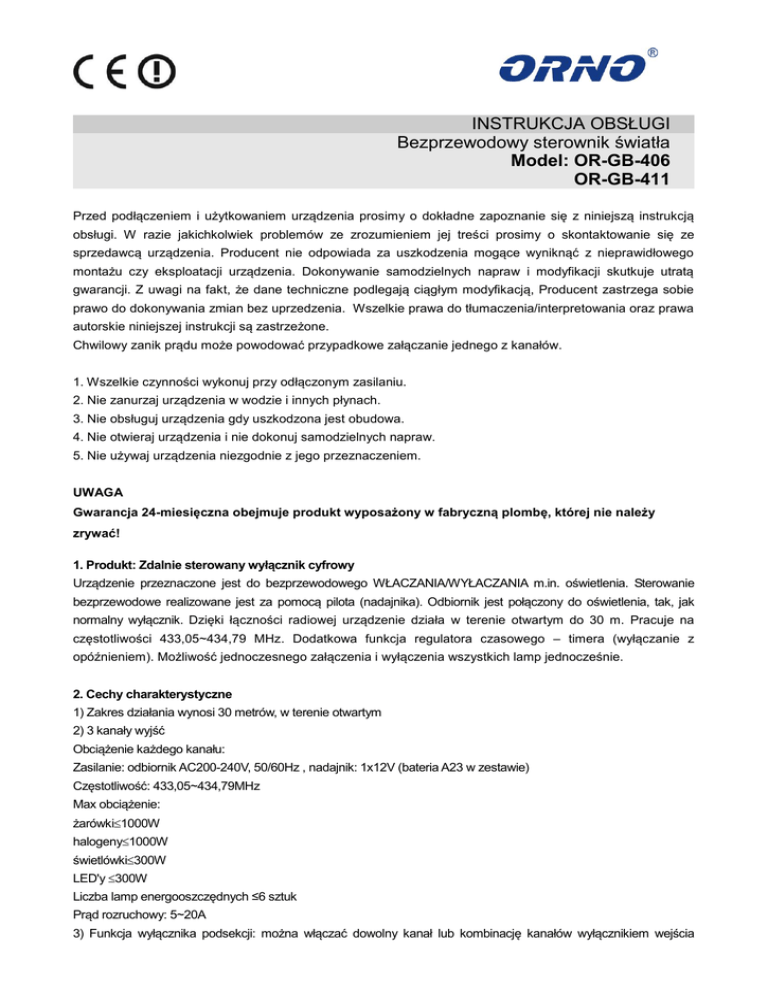 INSTRUKCJA OBSŁUGI Bezprzewodowy sterownik światła Model: OR-GB-406 OR-GB-411 Przed podłączeniem i użytkowaniem urządzenia prosimy o dokładne zapoznanie się z niniejszą instrukcją obsługi. W razie jakichkolwiek problemów ze zrozumieniem jej treści prosimy o skontaktowanie się ze sprzedawcą urządzenia. Producent nie odpowiada za uszkodzenia mogące wyniknąć z nieprawidłowego montażu czy eksploatacji urządzenia. Dokonywanie samodzielnych napraw i modyfikacji skutkuje utratą gwarancji. Z uwagi na fakt, że dane techniczne podlegają ciągłym modyfikacją, Producent zastrzega sobie prawo do dokonywania zmian bez uprzedzenia. Wszelkie prawa do tłumaczenia/interpretowania oraz prawa autorskie niniejszej instrukcji są zastrzeżone. Chwilowy zanik prądu może powodować przypadkowe załączanie jednego z kanałów. 1. Wszelkie czynności wykonuj przy odłączonym zasilaniu. 2. Nie zanurzaj urządzenia w wodzie i innych płynach. 3. Nie obsługuj urządzenia gdy uszkodzona jest obudowa. 4. Nie otwieraj urządzenia i nie dokonuj samodzielnych napraw. 5. Nie używaj urządzenia niezgodnie z jego przeznaczeniem. UWAGA Gwarancja 24-miesięczna obejmuje produkt wyposażony w fabryczną plombę, której nie należy zrywać! 1. Produkt: Zdalnie sterowany wyłącznik cyfrowy Urządzenie przeznaczone jest do bezprzewodowego WŁACZANIA/WYŁACZANIA m.in. oświetlenia. Sterowanie bezprzewodowe realizowane jest za pomocą pilota (nadajnika). Odbiornik jest połączony do oświetlenia, tak, jak normalny wyłącznik. Dzięki łączności radiowej urządzenie działa w terenie otwartym do 30 m. Pracuje na częstotliwości 433,05~434,79 MHz. Dodatkowa funkcja regulatora czasowego – timera (wyłączanie z opóźnieniem). Możliwość jednoczesnego załączenia i wyłączenia wszystkich lamp jednocześnie. 2. Cechy charakterystyczne 1) Zakres działania wynosi 30 metrów, w terenie otwartym 2) 3 kanały wyjść Obciążenie każdego kanału: Zasilanie: odbiornik AC200-240V, 50/60Hz , nadajnik: 1x12V (bateria A23 w zestawie) Częstotliwość: 433,05~434,79MHz Max obciążenie: żarówki1000W halogeny1000W świetlówki300W LED'y 300W Liczba lamp energooszczędnych ≤6 sztuk Prąd rozruchowy: 5~20A 3) Funkcja wyłącznika podsekcji: można włączać dowolny kanał lub kombinację kanałów wyłącznikiem wejścia zasilania odbiornika. Biorąc na przykład model 3-kanałowy, przez włączanie i wyłączanie wyłącznika otrzyma się kanał A, B, C, AB, AC, BC lub ABC. 4) Symbol zegara ( ), funkcja regulatora czasowego - TIMERa. Po naciśnięciu przycisku timera (D), wszystkie lampy wyłączą się po 1 minucie, a nie natychmiast. W celu anulowania tego nacisnąć dowolny przycisk. 3. Instalacja 1) Upewnij się, że moc lamp nie przekracza obciążenia tego produktu. Zainstaluj w nadajniku 1 szt. baterii alkalicznej 12V/A23. 2) Podłączyć przewody oświetlenia z odbiornikiem zgodnie ze schematem podłączenia znajdującym się na odbiorniku. Rys. 1 Schemat podłączenia 4. Działanie Przycis k Funkcja Przycisk WŁĄCZENIE/WYŁĄCZENIE dla obciążenia A WŁĄCZENIE/WYŁĄCZENIE dla obciążenia B WŁĄCZENIE/WYŁĄCZENIE dla obciążenia C Timer – regulator czasowy A B C WŁ/WYŁ Funkcja WŁĄCZENIE/WYŁĄCZENIE dla obciążenia A WŁĄCZENIE/WYŁĄCZENIE dla obciążenia B WŁĄCZENIE/WYŁĄCZENIE dla obciążenia C WŁĄCZENIE wszystkich/WYŁĄCZENIE wszystkich WŁACZENIE wszystkich WYŁĄCZENIE wszystkich Zgodnie z przepisami Ustawy z dnia 29 lipca 2005 r. o ZSEiE zabronione jest umieszczanie łącznie z innymi odpadami zużytego sprzętu oznakowanego symbolem przekreślonego kosza. Użytkownik, chcąc pozbyć się sprzętu elektronicznego i elektrycznego, jest zobowiązany do oddania go do punktu zbierania zużytego sprzętu. Masa netto: 0, 10 kg 06/2014 PRODUCENT: ORNO-LOGISTIC Sp. z o.o. ul. Katowicka 134 43-190 Mikołów tel. 32 43 43 110