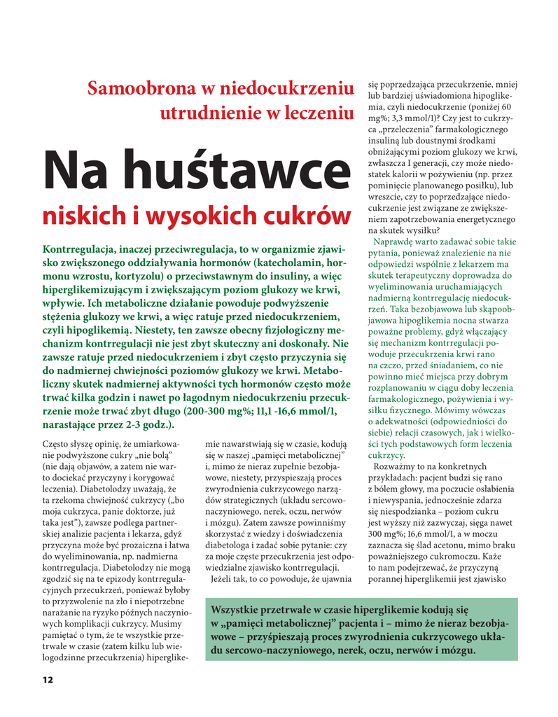 Samoobrona w niedocukrzeniu utrudnienie w leczeniu Na huśtawce niskich i wysokich cukrów Kontrregulacja, inaczej przeciwregulacja, to w organizmie zjawisko zwiększonego oddziaływania hormonów (katecholamin, hormonu wzrostu, kortyzolu) o przeciwstawnym do insuliny, a więc hiperglikemizującym i zwiększającym poziom glukozy we krwi, wpływie. Ich metaboliczne działanie powoduje podwyższenie stężenia glukozy we krwi, a więc ratuje przed niedocukrzeniem, czyli hipoglikemią. Niestety, ten zawsze obecny fizjologiczny me chanizm kontrregulacji nie jest zbyt skuteczny ani doskonały. Nie zawsze ratuje przed niedocukrzeniem i zbyt często przyczynia się do nadmiernej chwiejności poziomów glukozy we krwi. Metaboliczny skutek nadmiernej aktywności tych hormonów często może trwać kilka godzin i nawet po łagodnym niedocukrzeniu przecukrzenie może trwać zbyt długo (200-300 mg%; 11,1 -16,6 mmol/1, narastające przez 2-3 godz.). Często słyszę opinię, że umiarkowa nie podwyższone cukry „nie bolą” (nie dają objawów, a zatem nie war to dociekać przyczyny i korygować leczenia). Diabetolodzy uważają, że ta rzekoma chwiejność cukrzycy („bo moja cukrzyca, panie doktorze, już taka jest”), zawsze podlega partner skiej analizie pacjenta i lekarza, gdyż przyczyna może być prozaiczna i łatwa do wyeliminowania, np. nadmierna kontrregulacja. Diabetolodzy nie mogą zgodzić się na te epizody kontrregula cyjnych przecukrzeń, ponieważ byłoby to przyzwolenie na zło i niepotrzebne narażanie na ryzyko późnych naczynio wych komplikacji cukrzycy. Musimy pamiętać o tym, że te wszystkie prze trwałe w czasie (zatem kilku lub wie logodzinne przecukrzenia) hiperglike 12 mie nawarstwiają się w czasie, kodują się w naszej „pamięci metabolicznej” i, mimo że nieraz zupełnie bezobja wowe, niestety, przyspieszają proces zwyrodnienia cukrzycowego narzą dów strategicznych (układu sercowonaczyniowego, nerek, oczu, nerwów i mózgu). Zatem zawsze powinniśmy skorzystać z wiedzy i doświadczenia diabetologa i zadać sobie pytanie: czy za moje częste przecukrzenia jest odpo wiedzialne zjawisko kontrregulacji. Jeżeli tak, to co powoduje, że ujawnia się poprzedzająca przecukrzenie, mniej lub bardziej uświadomiona hipoglike mia, czyli niedocukrzenie (poniżej 60 mg%; 3,3 mmol/1)? Czy jest to cukrzy ca „przeleczenia” farmakologicznego insuliną lub doustnymi środkami obniżającymi poziom glukozy we krwi, zwłaszcza I generacji, czy może niedo statek kalorii w pożywieniu (np. przez pominięcie planowanego posiłku), lub wreszcie, czy to poprzedzające niedo cukrzenie jest związane ze zwiększe niem zapotrzebowania energetycznego na skutek wysiłku? Naprawdę warto zadawać sobie takie pytania, ponieważ znalezienie na nie odpowiedzi wspólnie z lekarzem ma skutek terapeutyczny doprowadza do wyeliminowania uruchamiających nadmierną kontrregulację niedocuk rzeń. Taka bezobjawowa lub skąpoob jawowa hipoglikemia nocna stwarza poważne problemy, gdyż włączający się mechanizm kontrregulacji po woduje przecukrzenia krwi rano na czczo, przed śniadaniem, co nie powinno mieć miejsca przy dobrym rozplanowaniu w ciągu doby leczenia farmakologicznego, pożywienia i wy siłku fizycznego. Mówimy wówczas o adekwatności (odpowiedniości do siebie) relacji czasowych, jak i wielko ści tych podstawowych form leczenia cukrzycy. Rozważmy to na konkretnych przykładach: pacjent budzi się rano z bólem głowy, ma poczucie osłabienia i niewyspania, jednocześnie zdarza się niespodzianka – poziom cukru jest wyższy niż zazwyczaj, sięga nawet 300 mg%; 16,6 mmol/1, a w moczu zaznacza się ślad acetonu, mimo braku poważniejszego cukromoczu. Każe to nam podejrzewać, że przyczyną porannej hiperglikemii jest zjawisko Wszystkie przetrwałe w czasie hiperglikemie kodują się w „pamięci metabolicznej” pacjenta i – mimo że nieraz bezobjawowe – przyśpieszają proces zwyrodnienia cukrzycowego układu sercowo-naczyniowego, nerek, oczu, nerwów i mózgu. nadmiernej kontrregulacji po epizo dzie nocnego – zazwyczaj między 2 a 3 godziną niedocukrzenia. To niedocu krzenie nie zawsze nas wybudza, czasami powoduje tylko pamięć kosz marnego snu. Następstwa tego stanu pod postacią porannego przecukrzenia (na skutek kontrregulacji), jeżeli nie są analizowane, często prowadzą na manowce lecznicze. Oto zwiększamy wieczorną dawkę insuliny lub popo łudniową doustnego leku hipogli kemizującego w nadziei na „zbicie” porannych poziomów cukru we krwi. Nic bardziej błędnego, skutek będzie fatalny: w istocie nocna hipoglikemia okaże się jeszcze głębsza i mózg może na nią zareagować utratą przytomno ści, tj. śpiączką hipoglikemiczną, i bez umieszczenia chorego na oddziale szpitalnym intensywnego nadzoru medycznego nie będziemy w stanie go wybudzić. Oczywiście nie jest moim celem straszenie chorych, ale zobra zowanie typowego przypadku błędnej interpretacji objawów, a co za tym idzie błędnej decyzji leczniczej. Jak zatem należy postąpić w tych oko licznościach? Przede wszystkim nabrać pewności, że u podłoża rozchwiania cukrzycy leży nocne niedocukrze nie. Trzeba więc nastawić budzik na drugą, trzecią w nocy i ocenić glikemię (sprowadza się to do dobrego opa nowania samokontroli w cukrzycy) i, po potwierdzeniu niedocukrzenia, możemy opóźnić porę wstrzykiwania ostatniej dawki insuliny i zmniejszyć procentowo zawartość insuliny krót kodziałającej, jeżeli to jest mieszanka, lub zmniejszyć całą dawkę wieczornej insuliny lub doustnego środka obniża jącego poziom cukru we krwi. Jeżeli jest to insulina jednorodna o długim lub pośrednim czasie dzia łania, zaleca się spożycie dodatkowo przed snem niewielkiej ilości wolno wchłanianych węglowodanów. Jeżeli oznaczona glikemia przed udaniem się na spoczynek jest zbyt niska, to oczywiście ostatnią dawkę insuliny lub doustnego środka n