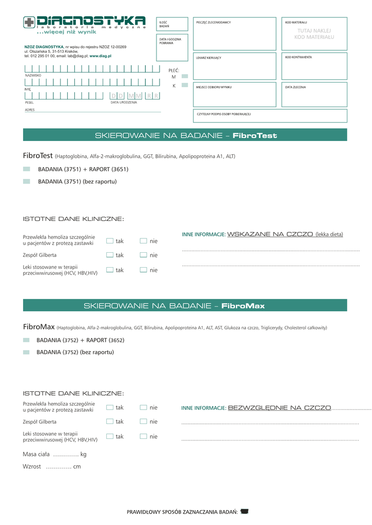 NZOZ DIAGNOSTYKA, nr wpisu do rejestru NZOZ 12-00269 ul. Olszańska 5, 31-513 Kraków, tel. 012 295 01 00, email: [email protected]; www.diag.pl SKIEROWANIE NA BADANIE – FibroTest FibroTest (Haptoglobina, Alfa-2-makroglobulina, GGT, Bilirubina, Apolipoproteina A1, ALT) BADANIA (3751) + RAPORT (3651) BADANIA (3751) (bez raportu) ISTOTNE DANE KLINICZNE: Przewlekła hemoliza szczególnie u pacjentów z protezą zastawki tak nie Zespół Gilberta tak nie Leki stosowane w terapii przeciwwirusowej (HCV, HBV,HIV) tak nie INNE INFORMACJE: WSKAZANE NA CZCZO (lekka dieta) ................................................................................................................... ................................................................................................................... SKIEROWANIE NA BADANIE – FibroMax FibroMax (Haptoglobina, Alfa-2-makroglobulina, GGT, Bilirubina, Apolipoproteina A1, ALT, AST, Glukoza na czczo, Triglicerydy, Cholesterol całkowity) BADANIA (3752) + RAPORT (3652) BADANIA (3752) (bez raportu) ISTOTNE DANE KLINICZNE: Przewlekła hemoliza szczególnie u pacjentów z protezą zastawki tak nie INNE INFORMACJE: BEZWZGLĘDNIE NA CZCZO........................... Zespół Gilberta tak nie ................................................................................................................... Leki stosowane w terapii przeciwwirusowej (HCV, HBV,HIV) tak nie ................................................................................................................... Masa ciała …………. kg Wzrost …………. cm INFORMACJE DLA PACJENTA � a) Testy nie zostały zwalidowane dla pacjentów po przeszczepie wątroby. b) Wykonanie badania należy odroczyć w przypadku, gdy u pacjenta występuje: nasilona hemoliza (atak malarii, leki powodujące hemolizę takie jak rybawiryna, azatioprina), ostre zapalenie wątroby w przebiegu: zakażeń wirusowych (nadkażenia HAV, HBV, HCV), chorób autoimmunizacyjnych lub wywołane lekami, ostre zapalenia towarzyszące infekcji bakteryjnej lub wirusowej (zapalenie dróg oddechowych lub moczowych) cholestaza zewnątrzwątrobowa, np. kamienie żółciowe c) Interpretacji wyników powinien dokonać lekarz specjalista. Jest to szczególnie ważne u pacjentów z przewlekłą hemolizą, zespołem Gilberta. d) W przypadku wątpliwości skontaktuj się z lekarzem. Oświadczenie Pacjenta 1) Wyrażam zgodę na przetwarzanie moich danych osobowych na potrzeby wykonania badań i wydania wyniku FibroTest/FibroMax. 2) Oświadczam, że: potwierdzam zgodność ze stanem faktycznym podanych przeze mnie danych zapoznałem się z powyższymi informacjami …………………………… telefon ……………… data ……………………………………………. Podpis Pacjenta WYBRANE PUNKTY W KTÓRYCH MOŻESZ WYKONAĆ BADANIE: (pełna lista na stronie www.diag.pl) Białystok, ul. Antoniukowska 11, tel. 085 651 11 16 lub 0 663 680 357 Częstochowa, ul. Mickiewicza 12, tel. 034 370 24 43 Gdynia, ul. Wendy 7/9, tel. 058 620 84 01 Gorzów, ul. Piłsudskiego 15, tel. 095 722 92 22 Jelenia Góra, ul. Wiejska 11, tel. 075 642 03 28 Kielce, ul. Jagiellońska 74, tel. 041 368 73 01 Kraków, ul. Olszańska 5, tel. 012 295 01 30 Lublin, ul. Topolowa 7, tel. 081 745 92 55 Łódź, ul. Sporna 36/50, tel. 042 617 79 55 Opole, ul. Wodociągowa 4, tel. 077 541 41 91 Poznań, Al. Solidarności 36, tel. 061 647 77 40 Rzeszów, ul. Jabłońskiego 2/4, tel. 017 875 58 18 Sosnowiec, ul. Wawel 15, tel. 032 368 48 36 Szczecin, ul. Boh. Warszawy 17/20, tel. 091 433 50 61 Tarnobrzeg, ul. Szpitalna 1, tel. 015 812 33 21 Warszawa, Al. Dwudziestolatków 3, tel. 022 846 12 48 Wrocław, ul. Weigla 12, tel. 071 370 90 00 Zielona Góra, ul. Kupiecka 22, tel. 068 457 89 81