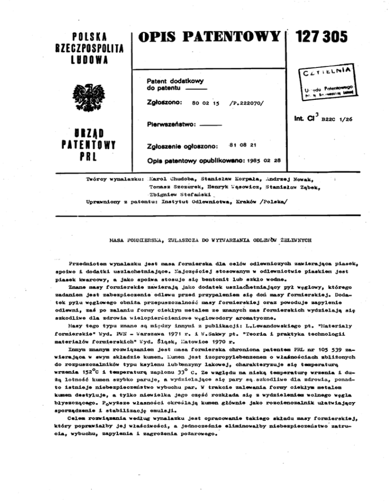 POLSKA RZECZPOSPOLITA OPIS PATENTOWY 127 305 LUDOWA Patent dodatkowy do patentu 'V9:M-$ Zgłoszono: 80 02 15 /p*222070/ Int Cl B22C 1/26 Pierwszeństwo: ■ IZ4D PATENTOWY ru Zgłoszenie ogłoszono: 81 °8 21 Opis patentowy opublikowano: 1985 02 28 Twórcy wynalazku: Karol Chudoba, Stanisław Korpala9 Andrzej Nowak, Tomasz Szczurek, Henryk Vąsowicz, Stanisław Ząbek, Zbigniew Stefański. Uprawniony z patentu: Instytut Odlewniot*a, Kraków /Polska/ MASA FOHIHERSKA, ZWŁASZCZA DO VYTl/ARZANXA ODL3/tfr ŻELIWNYCH Przedmiotem wynalazku Jest masa formierska dla celów odlewniczych zawierająca piasek, spoiwo i dodatki uszlachetniające* Najczęściej stosowanym w odlewnictwie piaskiem jest piasek kwarcowy, a jako spoiwa stosujo się bentonit lub szkło wodne* Znane masy formierskie zawierają jako dodatek uszlachetniający pyl węglowy, którego zadaniem Jest zabezpieczenie odlewu przed przypaleniem się doń masy formierskiej. Doda¬ tek pyłu węglowego obniża przepuszczalność masy formierskiej oraz powoduje zapylenie odlewni, zaś po zalaniu formy ciekłym metalem ze znanych mas formierskich wydzielają się szkodliwe dla zdrowia wielopierścieniowe węglowodory aromatyczne* Masy tego typu znane są miedzy innymi z publikacji: L.Lewandowskiego pt* "Materiały formierskie" Wyd* Pl/N - Warszawa 1971 r. i \v* Sakwy pt* "Teoria i praktyka technologii materiałów formierskich" Uryd. Śląsk, Katowice 1970 r* Innym znanym rozwiązaniem jest masa formierska chroniona patentem PRL nr 105 539 za¬ wierająca w swym składzie kumen. Lumen jest izopropylebenzenem o własnościach zbliżonych do rozpuszczalników typu ksylenu lubbenzyny łąkowej, charakteryzuje się temperaturą wrzenia 152°C i temperaturą zapłonu 33° C* Ze względu na niską temperaturę wrzenia i du¬ żą lotność kumen szybko paruje, a wydzielające się pary są szkodliwe dla zdrowia, ponad¬ to istnieje niebezpieczeństwo wybuchu par* W trakcie zalewania formy ciekłym metalem kumen destyluje, a tylko niewielka jego część rozkłada się z wydzieleniem wolnego węgla błyszczącego* PQwyższe własności określają kumen głównie Jako rozcieńczalnik ułatwiający sporządzenie i stabilizację emulsji* Celem rozwiązania według wynalazku jest opracowanie takiego składu masy formierskiej, który poprawiałby Jej właściwości, a jednocześnie eliminowałby niebezpieczeństwo zatru¬ cia, wybuchu, zapylenia i zagrożenia pożarowego* 127305 2 Cel ten osiągnięto stoaująo jako środek uszlachetniający do masy formierskiej a mole pokumenowa lub produkty jej destylacji* Smolą pokumenowa ma charakter oleju i jest produktem ubocznym w procesie otrzymywa¬ nia etylobenzenu i propylobenzemw Smolą pokumenowa zawiera związki posiadające w cząs¬ teczce dna lub więcej pierśoieni aromatycznych oraz oykloparafinowych, a także związki wyąokoaromatyozne o dużym stopniu kondensacji i właściwościach żywic naftowych* Zawar¬ tość substanoji żywicznych w smole pokumenowej wynosi ponad 5j£ wagowych* Obecność w smo¬ le pokumenowej związków posiadających dwa lub więcej pierścieni aromatycznyoh ma istotny wpływ na wydzielanie się na powierzohni odlewów wolnego węgla błyszczącego* oo jest zja¬ wiskiem pożądanym* Niska lotność i niższy punkt rozkładu termicznego struktur wysokooząstoczkowych zapobiega odparowywaniu ich z masy formierskiej w trakole sporządzania formy 1 w ozasie zalewania formy ciekłym metalem* a jednocześnie sprzyja tworzeniu się węgla błyszcząoego na drodze krakingu* Temperatura wrzenia smoły pokumenowej przekracza 300°C9 a temperatura zapłonu wyno¬ si ponad 100°C* Zawarte w smole pokumenowej związki łatwo mieszają się ze składnikami mi¬ neralnymi masy formierskiej i nie zachodzi konieczność sporządzania emulsji wodnej nie¬ pożądanego dodatkowego wprowadzania wody do masy formierskiej* Składniki żywiczne smoły pokumenowej wiążą materiał i podwyższają wytrzymałość masy formierskiej* Smołę pokumenowa otrzymuje sic po oddestylowaniu składników wrzących w temperaturze poniżej 240°C z mieszaniny węglowodorowej będącej produktem katalitycznej alkilacji ben¬ zenu etylenu lub propylonu* Smoła pokumenowa zawiera 3-30 ozęści wagowych dwutenylu i alkilowanyoh pochodnych dwutenylu oraz innych dwupierścieniowych węglowodorów aromatycz¬ nych* 30-60 ozęści wagowych polipropylobenzenów i polibutylobenzenów, 5*30 ozęści wago¬ wych węglowodorów trój- i więoej cyklicznych oraz żywic* Smołę pokumenowa w stanie ciekłym wprowadza się do masy formierskiej w ilości 0,2-10 osęśoi wagowych na 100 części wagowych piasku, korzystnie plasku kwarcowego* Można też przed wprowadzeniem do masy formierskiej zmieszać smołę pokumenowa z pyłem węglowym lub produktami węglopochodnymi lub ponaftowymi w ilości 5-20 części smoły pokumenowej na 100 ozęśoi wagowyoh pyłu węglowego lub produktów węglopoohodnych lub ponaf towych* Otrzymaną mieszaninę w stanie stałym wprowadza się do masy formierskiej w ilości 2-4 części wagowych mieszaniny na 100 części wagowych piasku* Masa formierska według wynalazku posiada dobre właściwości tochnologiczne, dużą wytrzy¬ małość, płynność i nie przypala sio do powierzchni odlewów* V trakcie zalewania formy ciekłym metalem następuje rozkład zawartych w masie formierskiej policyklicznych węglowo¬ dorów aromatycznych z Jednoczesnym wydzieleniem dużej ilośoi węgla błyszczącego, oo wywie¬ ra korzystny wpływ na jakość powierzchni odlewu* Masa formierska według wynalazku nie za¬ wiera niskowrzących węglowodorów aromatycznych, co w sposób wydatny ogranicza ilość wy¬ dzielających się szkodliwych oparów i eliminuje niebezpieczeństwo wybuchu* Masa formierska według wynalazku może być również stosowana do wykonywania rdzeni od¬ lewniczyoh* Przykłady składu masy według wynalazku* Przykład I* Piasek kwarcowy - 100 czości wagowych* bentonit - 3 cz