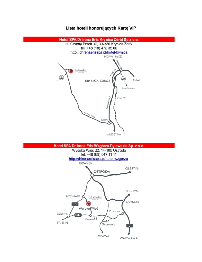 Lista hoteli honorujących Kartę VIP Hotel SPA Dr Irena Eris Krynica Zdrój Sp.z o.o. ul. Czarny Potok 30, 33-380 Krynica Zdrój tel. +48 (18) 472 35 00 http://drirenaerisspa.pl/hotel-krynica Hotel SPA Dr Irena Eris Wzgórza Dylewskie Sp. z o.o. Wysoka Wieś 22, 14-100 Ostróda tel. +48 (89) 647 11 11 http://drirenaerisspa.pl/hotel-wzgorza Hotel SPA Dr Irena Eris Polanica Zdrój Sp. z o.o. Dębowa 19b, 57-320 Polanica-Zdrój tel. +48 (74) 662 40 00 http://www.drirenaerisspa.pl/polanica-zdroj