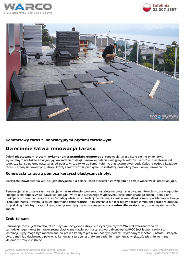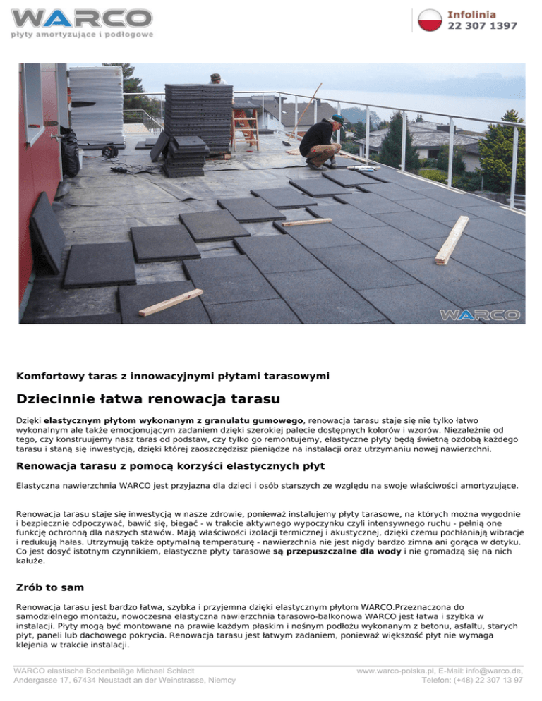Komfortowy taras z innowacyjnymi płytami tarasowymi Dziecinnie łatwa renowacja tarasu Dzięki elastycznym płytom wykonanym z granulatu gumowego, renowacja tarasu staje się nie tylko łatwo wykonalnym ale także emocjonującym zadaniem dzięki szerokiej palecie dostępnych kolorów i wzorów. Niezależnie od tego, czy konstruujemy nasz taras od podstaw, czy tylko go remontujemy, elastyczne płyty będą świetną ozdobą każdego tarasu i staną się inwestycją, dzięki której zaoszczędzisz pieniądze na instalacji oraz utrzymaniu nowej nawierzchni. Renowacja tarasu z pomocą korzyści elastycznych płyt Elastyczna nawierzchnia WARCO jest przyjazna dla dzieci i osób starszych ze względu na swoje właściwości amortyzujące. Renowacja tarasu staje się inwestycją w nasze zdrowie, ponieważ instalujemy płyty tarasowe, na których można wygodnie i bezpiecznie odpoczywać, bawić się, biegać - w trakcie aktywnego wypoczynku czyli intensywnego ruchu - pełnią one funkcję ochronną dla naszych stawów. Mają właściwości izolacji termicznej i akustycznej, dzięki czemu pochłaniają wibracje i redukują hałas. Utrzymują także optymalną temperaturę - nawierzchnia nie jest nigdy bardzo zimna ani gorąca w dotyku. Co jest dosyć istotnym czynnikiem, elastyczne płyty tarasowe są przepuszczalne dla wody i nie gromadzą się na nich kałuże. Zrób to sam Renowacja tarasu jest bardzo łatwa, szybka i przyjemna dzięki elastycznym płytom WARCO.Przeznaczona do samodzielnego montażu, nowoczesna elastyczna nawierzchnia tarasowo-balkonowa WARCO jest łatwa i szybka w instalacji. Płyty mogą być montowane na prawie każdym płaskim i nośnym podłożu wykonanym z betonu, asfaltu, starych płyt, paneli lub dachowego pokrycia. Renowacja tarasu jest łatwym zadaniem, ponieważ większość płyt nie wymaga klejenia w trakcie instalacji. WARCO elastische Bodenbeläge Michael Schladt Andergasse 17, 67434 Neustadt an der Weinstrasse, Niemcy www.warco-polska.pl, E-Mail: [email protected], Telefon: (+48) 22 307 13 97 W przypadku uszkodzenia poszczególnych płyt, renowacja tarasu nie musi być ponownie przeprowadzona od podstaw, ponieważ pojedyncze płyty mogą one być bezproblemowo odinstalowane i wymienione bez uszkodzenia pozostałej części nawierzchni. Inspirująca renowacja tarasu Czeka Cię renowacja tarasu? Pomoc w wyborze odpowiedniego produktu będzie dla nas prawdziwą przyjemnością wystarczy tylko wypełnić nasz formularz kontaktowy, aby uzyskać odpowiednią poradę, bezpłatną ulotkę i informację na temat wybranego wzoru. Jeśli szukasz więcej pomysłów i inspiracji, odkryj także naszą galerię i zobacz gotowe projekty z nawierzchnią WARCO. KONTAKT Aby otrzymać darmową próbkę i ofertę, wypełnij formularz kontaktowy WARCO elastische Bodenbeläge Michael Schladt Andergasse 17, 67434 Neustadt an der Weinstrasse, Niemcy Powered by TCPDF (www.tcpdf.org) www.warco-polska.pl, E-Mail: [email protected], Telefon: (+48) 22 307 13 97