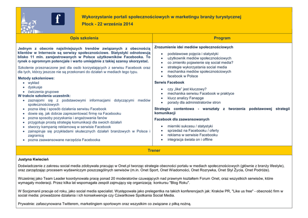 Wykorzystanie portali społecznościowych w marketingu branży turystycznej Płock - 22 września 2014 Opis szkolenia Program Jednym z obecnie najsilniejszych trendów związanych z obecnością klientów w Internecie są serwisy społecznościowe. Statystyki odnotowują blisko 11 mln. zarejestrowanych w Polsce użytkowników Facebooka. To rynek o ogromnym potencjale i warto umiejętnie z takiej szansy skorzystać. Zrozumienie idei mediów społecznościowych Szkolenie przeznaczone jest dla osób korzystających z serwisu Facebook oraz dla tych, którzy jeszcze nie są przekonani do działań w mediach tego typu. Metody szkoleniowe: wykład dyskusje ćwiczenia grupowe W trakcie szkolenia uczestnik: zaznajomi się z podstawowymi informacjami dotyczącymi mediów społecznościowych pozna ideę i sposób działania serwisu Facebook dowie się, jak dobrze zaprezentować firmę na Facebooku pozna sposoby pozyskania i angażowania fanów przygotuje prostą strategię komunikacji dla swoich działań stworzy kampanię reklamową w serwisie Facebook zainspiruje się przykładami skutecznych działań branżowych w Polsce i zagranicą pozna zaawansowane narzędzia Facebooka podstawowe pojęcia i statystyki użytkownik mediów społecznościowych co zmieniło pojawienie się social media? strategie wykorzystania social media mechanika mediów społecznościowych facebook w Polsce Serwis Facebook czy „like” jest kluczowy? mechanika serwisu Facebook w praktyce klucz analizy Fanapge porady dla administratorów stron Strategia contentowa komunikacji - warsztaty z tworzenia podstawowej strategii Facebook dla zaawansowanych mierniki sukcesu / statystyki sprzedaż na Facebooku / oferty reklama w serwisie Facebooku integracja świata on i offline Trener Justyna Kwiecień Doświadczenie z zakresu social media zdobywała pracując w Onet.pl tworząc strategie obecności portalu w mediach społecznościowych (głównie z branży lifestyle), oraz zarządzając procesem wydawniczym poszczególnych serwisów (m.in. Onet Sport, Onet Wiadomości, Onet Rozrywka, Onet Styl Życia, Onet Podróże). Wcześniej jako Team Leader koordynowała pracę ponad 20 moderatorów czuwających nad prawnym kształtem Forum Onet, oraz wszystkich serwisów, które wymagały moderacji. Przez kilka lat wspomagała zespół zajmujący się organizacją konkursu "Blog Roku". W Socjomanii pracuje od roku, jako social media specialist. Występowała jako prelegentka na takich konferencjach jak: Kraków PR, "Like us free" - obecność firm w social media: prowadzone działania i ich konsekwencje czy Czwartkowe Spotkania Social Media. Prywatnie: zafascynowana Twitterem, marketingiem sportowym oraz wszystkim co związane z piłką nożną.