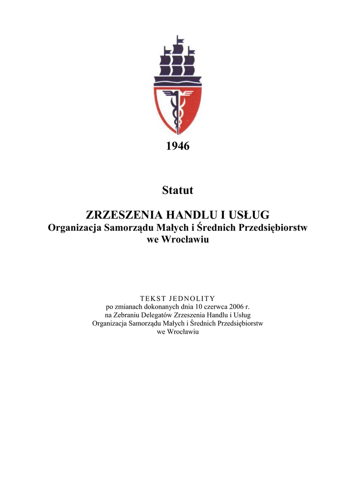 1946 Statut ZRZESZENIA HANDLU I USŁUG Organizacja Samorządu Małych i Średnich Przedsiębiorstw we Wrocławiu TEKST JEDNOLITY po zmianach dokonanych dnia 10 czerwca 2006 r. na Zebraniu Delegatów Zrzeszenia Handlu i Usług Organizacja Samorządu Małych i Średnich Przedsiębiorstw we Wrocławiu Rozdział I Postanowienia ogólne §1 1. Zrzeszenie Handlu i Usług, Organizacja Samorządu Małych i Średnich Przedsiębiorstw zwane Zrzeszeniem, jest organizacją samorządu zawodowego przedsiębiorców prowadzących małe i średnie przedsiębiorstwa. 2. Zrzeszenie powstało w wyniku uchwały Zebrania Delegatów ZPHiU we Wrocławiu z dnia 18.10.1989 r. o przekształceniu się w organizację dobrowolną o nazwie „Zrzeszenie Prywatnego Handlu i Usług” na podstawie art. 49, pkt. 1. ustawy o działalności gospodarczej z dnia 23.12.1988 r. (Dz. U. nr. 41, poz. 342) oraz ustawy z dnia 30.05.1989 r. o samorządzie zawodowym niektórych przedsiębiorców (Dz. U. nr. 35, poz.194). 3. W oparciu o w/w ustawy Zrzeszenie przyjęło prawa majątkowe zobowiązania dotychczasowego przymusowego Zrzeszenia Prywatnego Handlu i Usług woj. wrocławskiego we Wrocławiu. §2 1. Zrzeszenie posiada osobowość prawną – może zbywać i nabywać majątek nieruchomy i ruchomy, zaciągać wszelkiego rodzaju zobowiązania, pozywać i być pozywanym, tworzyć oddziały i spółki lub obejmować w spółkach udziały lub akcje oraz łączyć się z innymi organizacjami w federacje. 2. Zrzeszenie odpowiada za swoje zobowiązania tylko swoim majątkiem. 3. Zrzeszenie nie odpowiada wobec osób trzecich za zobowiązania członków Zrzeszenia ani członkowie Zrzeszenia nie odpowiadają wobec osób trzecich za zobowiązania Zrzeszenia. 1. 2. §3 Zrzeszenie obejmuje zakresem swej działalności obszar Rzeczypospolitej Polskiej, może także prowadzić działalność poza granicami kraju. Siedzibą Zrzeszenia jest miasto Wrocław. Zrzeszenie używa godła z rysunkiem laski Merkurego na biało-czerwonej tarczy, zwieńczonej rysunkiem żaglowca oraz ma prawo używania pieczęci okrągłej z tym godłem i napisem Zrzeszenie Handlu i Usług Organizacja Samorządu Małych i Średnich Przedsiębiorstw we Wrocławiu. Zrzeszenie może posiadać sztandar. Rozdział II Zadania Zrzeszenia §4 1. Zrzeszenie ma na celu wszechstronne popieranie i rozwój działalności gospodarczej prowadzonej przez członków Zrzeszenia oraz obronę, pomoc i reprezentację ich interesów gospodarczych. 2. Do osiągnięcia zamierzonych celów Zrzeszenie będzie dążyć w szczególności przez: 1. reprezentowanie interesów zrzeszonych wobec władz i samorządowych, gospodarczych, społecznych i innych poprzez: instytucji państwowych -2- a) popieranie inicjatyw gospodarczych b) wyrażanie opinii i formułowanie wniosków co do aktów prawnych aktualnie obowiązujących, będących w opracowaniu lub nowowydanych, a związanych z działalnością członków Zrzeszenia. 2. pomoc w prowadzeniu działalności gospodarczej poprzez: a) doradztwo i instruktaż w sprawach podatkowych, prowadzenia ksiąg, kalkulacji zeznań podatkowych, pisania odwołań, pism i podań, powoływania rzeczoznawców w zakresie działalności gospodarczej Zrzeszonych b) bieżącą informację o obowiązujących aktach prawnych i ich interpretacji c) informację branżową o źródłach zaopatrzenia d) pośrednictwo w nawiązywaniu kontaktów z innymi podmiotami gospodarczymi e) pomoc w sprawach wyposażenia technicznego f) organizowanie szkoleń, kursów, instruktaży i imprez handlowych, w tym również w celach zarobkowych dla podmiotów nie będących członkami Zrzeszenia. g) wykonywanie innych zadań wynikających z aktualnych potrzeb Zrzeszenia. 3. a) b) c) d) Obronę grupowych i indywidualnych interesów członków wobec władz poprzez: interwencję u władz administracyjnych, skarbowych i kontrolnych uczestnictwo w komisjach i gremiach rozstrzygających sprawy podatkowe i inne udzielanie poręk w uzasadnionych wypadkach wydawanie opinii i zaświadczeń dla władz i instytucji wyłącznie na żądanie lub za zgodą zainteresowanych członków Zrzeszenia. §5 Zrzeszenie może na podstawie uchwały Zebrania Delegatów rozszerzyć swą działalność i prowadzić : 1. dla członków, ich rodzin i pracowników oraz byłych członków – emerytów i rencistów akcję socjalną samodzielnie lub z innymi organizacjami 2. organizować i prowadzić kasę pożyczkową dla członków 3. tworzyć fundusze na cele samopomocowe, społeczne, inwestycyjne i inne 4. prowadzić działalność gospodarczą samodzielnie lub w formie udziału w spółkach. Rozdział III Członkowie - ich prawa i obowiązki §6 1. Członkami Zrzeszenia mogą być przedsiębiorcy, o którym mowa w § 1 Statutu. 2. O przyjęciu w poczet członków decyduje Prezydium Zarządu na podstawie pisemnej deklaracji podpisanej przez zgłaszającą się osobę (kandydata). 3. Przy składaniu deklaracji kandydat wpłaca wpisowe w wysokości ustalonej przez Zarząd Zrzeszenia. 4. O decyzji Prezydium odmawiającej przyjęcia, kandydat może być powiadomiony listem poleconym w ciągu miesiąca od daty złożenia deklaracji. Brak decyzji w określonym terminie jest równoznaczny z przyjęciem kandydata. -3- 5. Kandydatowi przysługuje prawo odwołania się do Zarządu Zrzeszenia od negatywnej decyzji Prezydium w ciągu 14 dni od jej otrzymania. Decyzja Zarządu jest ostateczna i w wypadku nie przyjęcia kandydata wpisowe podlega zwrotowi. §7 1. Wszyscy członkowie Zrzeszenia mają prawo korzystać z wszelkich urządzeń Zrzeszenia, uczestniczyć w zebraniach przez Zrzeszenie organizowanych z prawem czynnego i biernego prawa wyborczego oraz podkreślać przynależność swą do organizacji w formie wywieszki czy szyldu z godłem organizacji określonym w § 3 pkt. 2 niniejszego statutu. 2. Każdy członek może zgłaszać swoje uwagi i wnioski do Prezydium i Zarządu oraz na Zebraniu Delegatów. Wnioski na Zebranie Delegat