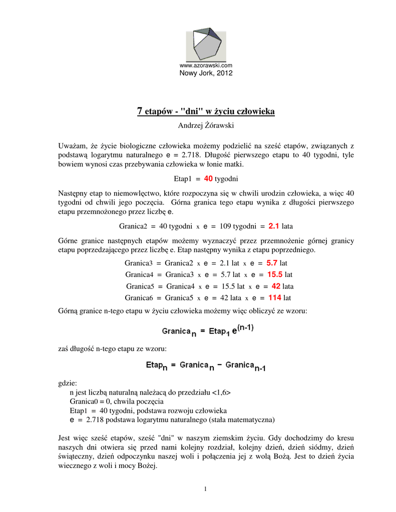 www.azorawski.com Nowy Jork, 2012 7 etapów - "dni" w życiu człowieka Andrzej Żórawski Uważam, że życie biologiczne człowieka możemy podzielić na sześć etapów, związanych z podstawą logarytmu naturalnego e = 2.718. Długość pierwszego etapu to 40 tygodni, tyle bowiem wynosi czas przebywania człowieka w łonie matki. Etap1 = 40 tygodni Następny etap to niemowlęctwo, które rozpoczyna się w chwili urodzin człowieka, a więc 40 tygodni od chwili jego poczęcia. Górna granica tego etapu wynika z długości pierwszego etapu przemnożonego przez liczbę e. Granica2 = 40 tygodni x e = 109 tygodni = 2.1 lata Górne granice następnych etapów możemy wyznaczyć przez przemnożenie górnej granicy etapu poprzedzającego przez liczbę e. Etap następny wynika z etapu poprzedniego. Granica3 Granica4 Granica5 Granica6 = Granica2 = Granica3 = Granica4 = Granica5 = 2.1 lat x e = 5.7 lat x e = 5.7 lat x e = 15.5 lat x e = 15.5 lat x e = 42 lata x e = 42 lata x e = 114 lat x e Górną granice n-tego etapu w życiu człowieka możemy więc obliczyć ze wzoru: zaś długość n-tego etapu ze wzoru: gdzie: n jest liczbą naturalną należacą do przedziału <1,6> Granica0 = 0, chwila poczęcia Etap1 = 40 tygodni, podstawa rozwoju człowieka e = 2.718 podstawa logarytmu naturalnego (stała matematyczna) Jest więc sześć etapów, sześć "dni" w naszym ziemskim życiu. Gdy dochodzimy do kresu naszych dni otwiera się przed nami kolejny rozdział, kolejny dzień, dzień siódmy, dzień świąteczny, dzień odpoczynku naszej woli i połączenia jej z wolą Bożą. Jest to dzień życia wiecznego z woli i mocy Bożej. 1 Wyznaczone w ten sposób długości etapów mają znaczenie teoretyczne. W praktyce ze względu na choroby, wypadki, splot różnych życiowych zdarzeń, odżywianie czy higienę życia długości etapów mogą być nieco odmienne jednak będą zbliżone do wartości teoretycznych. Największe rozbieżności mogą występować w odniesieniu do "dnia VI". Podział ten przedstawia poniższa tabela. Etap "dzień" Granice etapu Charakterystyka (w uproszczeniu) I 40 tygodni Rozwój w łonie matki. Człowiek rodzi się po 40 tygodniach od chwili poczęcia. II od 40 tygodnia do 2.1 lata Nauka rozpoznawania przez zmysły. Nabywamy umiejętność samodzielnego poruszania się i kształtujemy podstawy mowy. III od 2.1 lat do 5.7 lat Rozwój motoryczny i emocjonalny. Potrzeba ekspresji w zabawie z rówieśnikami. Uaktywnienie wyobraźni, rozwój myślenia symbolicznego i koncentracji uwagi. IV od 5.7 lat do 15.5 lat Wiek szkolny. Kształtowanie wyobraźni, nauka logiki, rozwój myślenia hipotetyczno-dedukcyjnego. V od 15.5 lat do 42 lat W tym okresie wszystkie hormony działają w organizmie człowieka. Dojrzewanie psychiczne i społeczne. W trzeciej części tego etapu osiągamy dorosłość. VI od 42 lat do 114 lat Dojrzałość. Zmniejsza się aktywność fizyczna, a zwiększa potrzeba refleksji duchowej. Zmiany fizjologiczne, siwe włosy, zmarszczki, starzenie. VII rozpoczyna się z chwilą śmierci Odpoczynek naszej woli, połączenie jej z wolą Bożą Życie wieczne z woli i mocy Bożej. Jak można zauważyć "dni" są przedziałami wiekowymi. Począwszy od "dnia II", dnia naszych urodzin, a kończąc na "dniu VI", każdy z "dni" jest dzielony na trzy pory: poranek, południe i wieczór. Podział ten wynika z wpisywania się w przedstawione powyżej przedziały wiekowe ciągu liczb Fibonacciego. Liczby Fibonacciego związane są z tak zwanym złotym (boskim) podziałem. Te, które wpisują się w "dni" naszego życia to: 1, 2, 3, 5, 8, 13, 21, 34, 55, 89. Dziesięć wyrazów ciągu Fibonacciego dzieli więc po naszym narodzeniu pięć "dni" życia na trzy części, bo w każdy "dzień" wpisują się dwie liczby Fibonacciego. W sumie jest więc 5 x 3 = 15 okresów biologicznych, które możemy wyróżnić po naszym narodzeniu. W Księdze Wyjścia (25:3-7) Mojżesz opisuje, że Bóg określił 15 materiałów potrzebnych do budowy i użytkowania Przybytku Izraela oraz pouczył go jak ma być Przybytek zbudowany. W czasie opisanych 15 okresów biologicznych możemy budować w naszej duszy duchowy przybytek według Bożego planu jakim jest "ziarno dobra". Zauważmy że pierwszy "dzień" 2 rozpoczynający się w chwili naszego poczęcia i związany z budową ciała człowieka jest najkrótszy. Etap ten odbywa się w łonie matki, a zachodzące wówczas zmiany biologiczne organizmu przebiegają z największa intensywnością, bo przecież następuje budowa i wzrost wszystkich części ciała. Etap ten można łączyć z "pouczeniem przez Słowo Boże" naszej nieświadomej natury. Pouczenie to początkuje Jego plan. Odpowiadające sobie okresy "materiały": poranki, południa, wieczory, w kolejnych dniach są coraz dłuższe, gdyż nasza świadomość rozwijając się jest w nich bardziej rozległa. Najdłuższym jest trwające 34 lata południe "dnia VI", które nazwałem "wiekiem refleksji". Jest to czas przygotowania do starości ale też i do wieczności. Powyższe rozważania ilustruje rysunek: 3 Można zauważyć, że stosunek liczby 10 wyrazów ciągu Fibonacciego do liczby 6 "ziemskich dni" życia człowieka jest w tej samej proporcji co 40 godzinny okres próby człowieka wyznaczony przez śmierć Jezusa i Jego zmartwychwstanie do długości 24 godzinnego dnia: 10/6 = 40/24 = 5/3. To, że odczuwamy upływ czasu wynika z posiadanych przez człowieka zdolności do zauważania zachodzących zdarzeń (zmian) i ułożenia ich w ciąg przyczynowo skutkowy. Jest to funkcja czysto psychiczna związana z naszą świadomością i wolą. Fizycy przyjmują, że czas jest wymiarem. Określają fizyczną przestrzeń Wszechświata jako czasoprzestrzeń, w której obiekty do niej należące poruszają się względem siebie, a ich istota czy też natura może ulegać zmianie na skutek zachodzących między nimi oddziaływań. Czy jednak czas jest wymiarem fizycznym, a nie jedynie wygodną