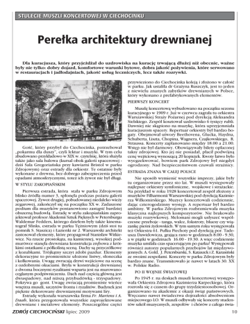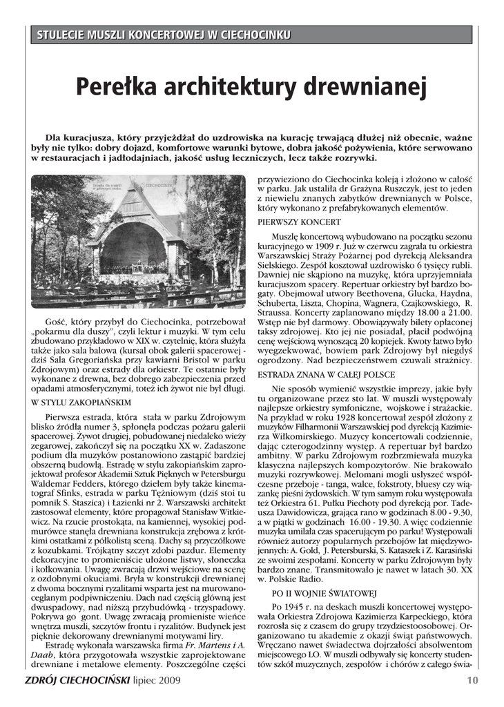 STULECIE MUSZLI KONCERTOWEJ W CIECHOCINKU Pere∏ka architektury drewnianej Dla kuracjusza, który przyje˝d˝a∏ do uzdrowiska na kuracj´ trwajàcà d∏u˝ej ni˝ obecnie, wa˝ne by∏y nie tylko: dobry dojazd, komfortowe warunki bytowe, dobra jakoÊç po˝ywienia, które serwowano w restauracjach i jad∏odajniach, jakoÊç us∏ug leczniczych, lecz tak˝e rozrywki. przywieziono do Ciechocinka kolejà i z∏o˝ono w ca∏oÊç w parku. Jak ustali∏a dr Gra˝yna Ruszczyk, jest to jeden z niewielu znanych zabytków drewnianych w Polsce, który wykonano z prefabrykowanych elementów. PIERWSZY KONCERT GoÊç, który przyby∏ do Ciechocinka, potrzebowa∏ „pokarmu dla duszy”, czyli lektur i muzyki. W tym celu zbudowano przyk∏adowo w XIX w. czytelni´, która s∏u˝y∏a tak˝e jako sala balowa (kursal obok galerii spacerowej dziÊ Sala Gregoriaƒska przy kawiarni Bristol w parku Zdrojowym) oraz estrady dla orkiestr. Te ostatnie by∏y wykonane z drewna, bez dobrego zabezpieczenia przed opadami atmosferycznymi, tote˝ ich ˝ywot nie by∏ d∏ugi. W STYLU ZAKOPIA¡SKIM Pierwsza estrada, która sta∏a w parku Zdrojowym blisko êród∏a numer 3, sp∏on´∏a podczas po˝aru galerii spacerowej. ˚ywot drugiej, pobudowanej niedaleko wie˝y zegarowej, zakoƒczy∏ si´ na poczàtku XX w. Zadaszone podium dla muzyków postanowiono zastàpiç bardziej obszernà budowlà. Estrad´ w stylu zakopiaƒskim zaprojektowa∏ profesor Akademii Sztuk Pi´knych w Petersburgu Waldemar Fedders, którego dzie∏em by∏y tak˝e kinematograf Sfinks, estrada w parku T´˝niowym (dziÊ stoi tu pomnik S. Staszica) i ¸azienki nr 2. Warszawski architekt zastosowa∏ elementy, które propagowa∏ Stanis∏aw Witkiewicz. Na rzucie prostokàta, na kamiennej, wysokiej podmurówce stan´∏a drewniana konstrukcja zr´bowa z krótkimi ostatkami z pó∏kolistà scenà. Dachy sà przyczó∏kowe z kozubkami. Trójkàtny szczyt zdobi pazdur. Elementy dekoracyjne to promieniÊcie u∏o˝one listwy, s∏oneczka i ko∏kowania. Uwag´ zwracajà drzwi wejÊciowe na scen´ z ozdobnymi okuciami. Bry∏a w konstrukcji drewnianej z dwoma bocznymi ryzalitami wsparta jest na murowanoceglanym podpiwniczeniu. Dach nad cz´Êcià g∏ównà jest dwuspadowy, nad ni˝szà przybudówkà - trzyspadowy. Pokrywa go gont. Uwag´ zwracajà promieniste wieƒce wn´trza muszli, szczytów frontu i ryzalitów. Budynek jest pi´knie dekorowany drewnianymi motywami liry. Estrad´ wykona∏a warszawska firma Fr. Martens i A. Daab, która przygotowa∏a wszystkie zaprojektowane drewniane i metalowe elementy. Poszczególne cz´Êci ZDRÓJ CIECHOCI¡SKI lipiec 2009 Muszl´ koncertowà wybudowano na poczàtku sezonu kuracyjnego w 1909 r. Ju˝ w czerwcu zagra∏a tu orkiestra Warszawskiej Stra˝y Po˝arnej pod dyrekcjà Aleksandra Sielskiego. Zespó∏ kosztowa∏ uzdrowisko 6 tysi´cy rubli. Dawniej nie skàpiono na muzyk´, która uprzyjemnia∏a kuracjuszom spacery. Repertuar orkiestry by∏ bardzo bogaty. Obejmowa∏ utwory Beethovena, Glucka, Haydna, Schuberta, Liszta, Chopina, Wagnera, Czajkowskiego, R. Straussa. Koncerty zaplanowano mi´dzy 18.00 a 21.00. Wst´p nie by∏ darmowy. Obowiàzywa∏y bilety op∏aconej taksy zdrojowej. Kto jej nie posiada∏, p∏aci∏ podwójnà cen´ wejÊciowà wynoszàcà 20 kopiejek. Kwoty ∏atwo by∏o wyegzekwowaç, bowiem park Zdrojowy by∏ niegdyÊ ogrodzony. Nad bezpieczeƒstwem czuwali stra˝nicy. ESTRADA ZNANA W CA¸EJ POLSCE Nie sposób wymieniç wszystkie imprezy, jakie by∏y tu organizowane przez sto lat. W muszli wyst´powa∏y najlepsze orkiestry symfoniczne, wojskowe i stra˝ackie. Na przyk∏ad w roku 1928 koncertowa∏ zespó∏ z∏o˝ony z muzyków Filharmonii Warszawskiej pod dyrekcjà Kazimierza Wi∏komirskiego. Muzycy koncertowali codziennie, dajàc czterogodzinny wyst´p. A repertuar by∏ bardzo ambitny. W parku Zdrojowym rozbrzmiewa∏a muzyka klasyczna najlepszych kompozytorów. Nie brakowa∏o muzyki rozrywkowej. Melomani mogli us∏yszeç wspó∏czesne przeboje - tanga, walce, fokstroty, bluesy czy wiàzank´ pieÊni ˝ydowskich. W tym samym roku wyst´powa∏a te˝ Orkiestra 61. Pu∏ku Piechoty pod dyrekcjà por. Tadeusza Dawidowicza, grajàca rano w godzinach 8.00 - 9.30, a w piàtki w godzinach 16.00 - 19.30. A wi´c codziennie muzyka umila∏a czas spacerujàcym po parku! Wyst´powali równie˝ autorzy popularnych przebojów lat mi´dzywojennych: A. Gold, J. Petersburski, S. Kataszek i Z. Karasiƒski ze swoimi zespo∏ami. Koncerty w parku Zdrojowym by∏y bardzo znane. Transmitowa∏o je nawet w latach 30. XX w. Polskie Radio. PO II WOJNIE ÂWIATOWEJ Po 1945 r. na deskach muszli koncertowej wyst´powa∏a Orkiestra Zdrojowa Kazimierza Karpeckiego, która rozros∏a si´ z czasem do grupy trzydziestoosobowej. Organizowano tu akademie z okazji Êwiàt paƒstwowych. Wr´czano nawet Êwiadectwa dojrza∏oÊci absolwentom miejscowego LO. W muszli odbywa∏y si´ koncerty studentów szkó∏ muzycznych, zespo∏ów i chórów z ca∏ego Êwia- 10 Êcian brusowych i krà˝yn. Wi´êba dachowa zosta∏a pokryta nowymi gontami Êwierkowymi. Zosta∏y pog∏´bione piwnice, aby stworzyç zaplecze magazynowe. Wykonano nowe instalacje: elektrycznà i wodno-kanalizacyjnà. Przebudowano sanitariaty i garderoby. Obiekt zosta∏ zabezpieczony przed katastrofà budowlanà. Remont generalny zosta∏ sfinansowany z bud˝etu ciechociƒskiej gminy, troch´ do∏o˝y∏ konserwator zabytków. Wykonawcà by∏o Przedsi´biorstwo Budowlano-Konserwatorskie DOMPOL Sp. z o. o. z Torunia. Kolejny sezon muszla koncertowa w parku Zdrojowym cieszy oko spacerujàcych. Obiekt jest pi´knie iluminowany. Sta∏à ochron´ przed wandalami zapewnia monitoring. NIE TYLKO ATRAKCJA ta. W parku mo˝na by∏o us∏yszeç „Czarne Berety” i „Poz-naƒskie S∏owiki” pod dyrekcjà Stefana Stuligrosza, W∏oÊciaƒskà Orkiestr´ im. Karola Namys∏owskiego. Cz´sto koncertowa∏ zespó∏ Paƒstwowej 
